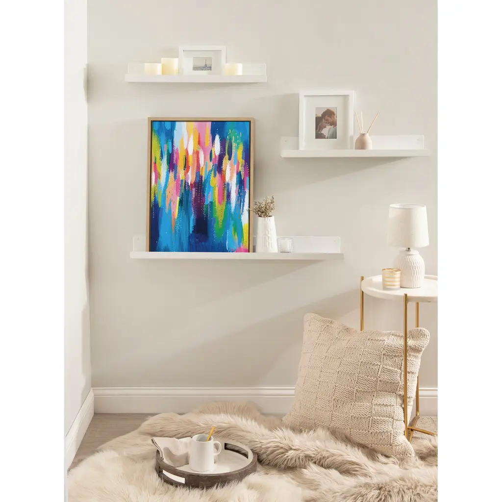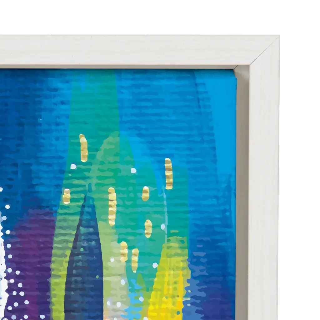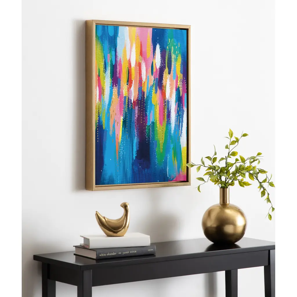 This cool print by Jessi Raulet of Ettavee brings a pop of color and vibrancy to your home in the form of a rainbow abstract. Framed in the USA in Waunakee, Wisconsin, this floating canvas art will be a pleasure to look at every day in your living room, bedroom, nursery, or any room in the home. Printed on gallery-wrapped canvas and framed with a lightweight polystyrene frame, this wall art has two hangers already attached to the MDF back for easy wall display. The outer dimensions are 24 inches tall by 18 inches wide by 1.63 inches deep. Print Name: "EV Bright Brush Strokes 033"