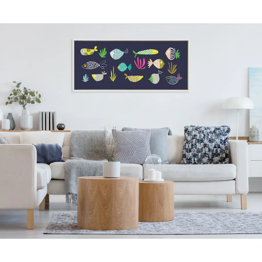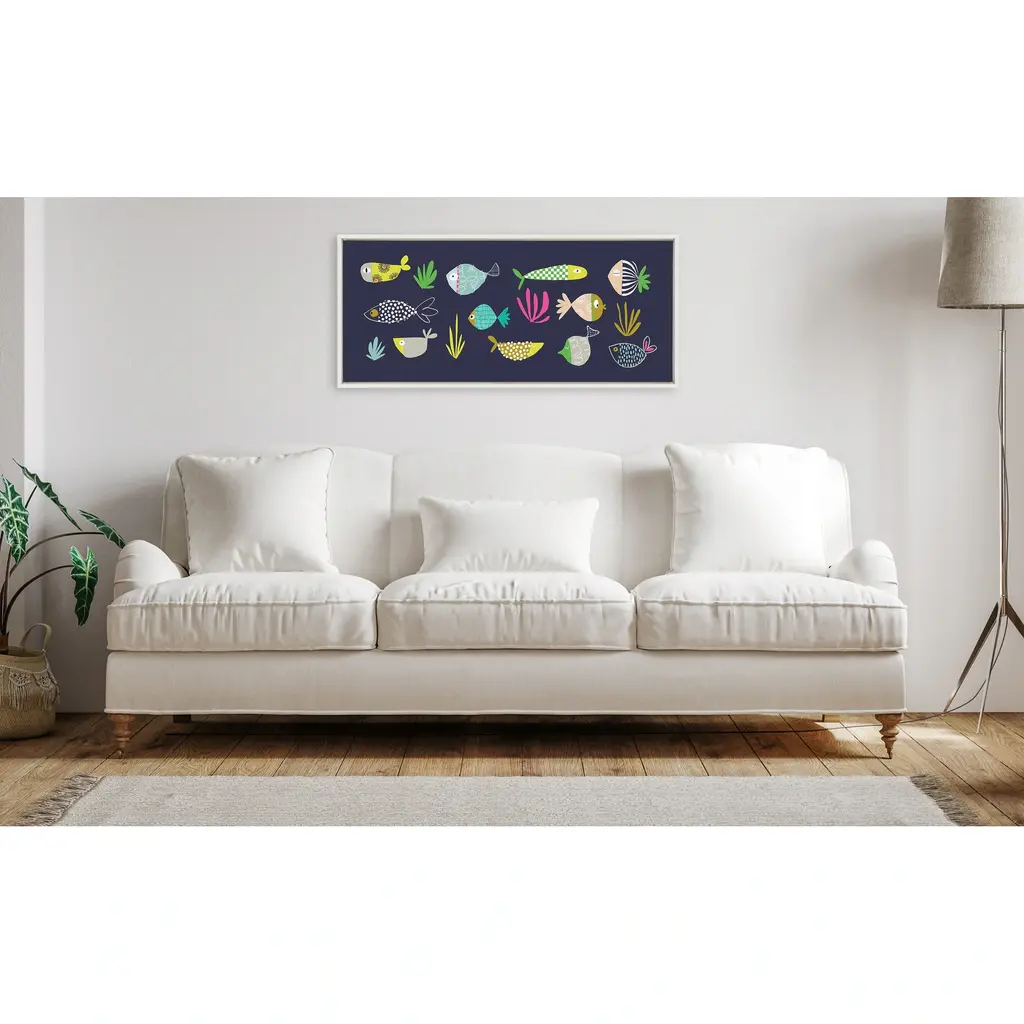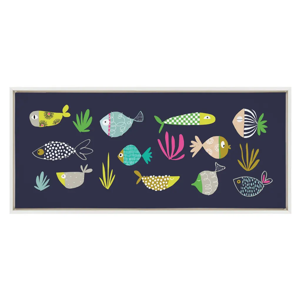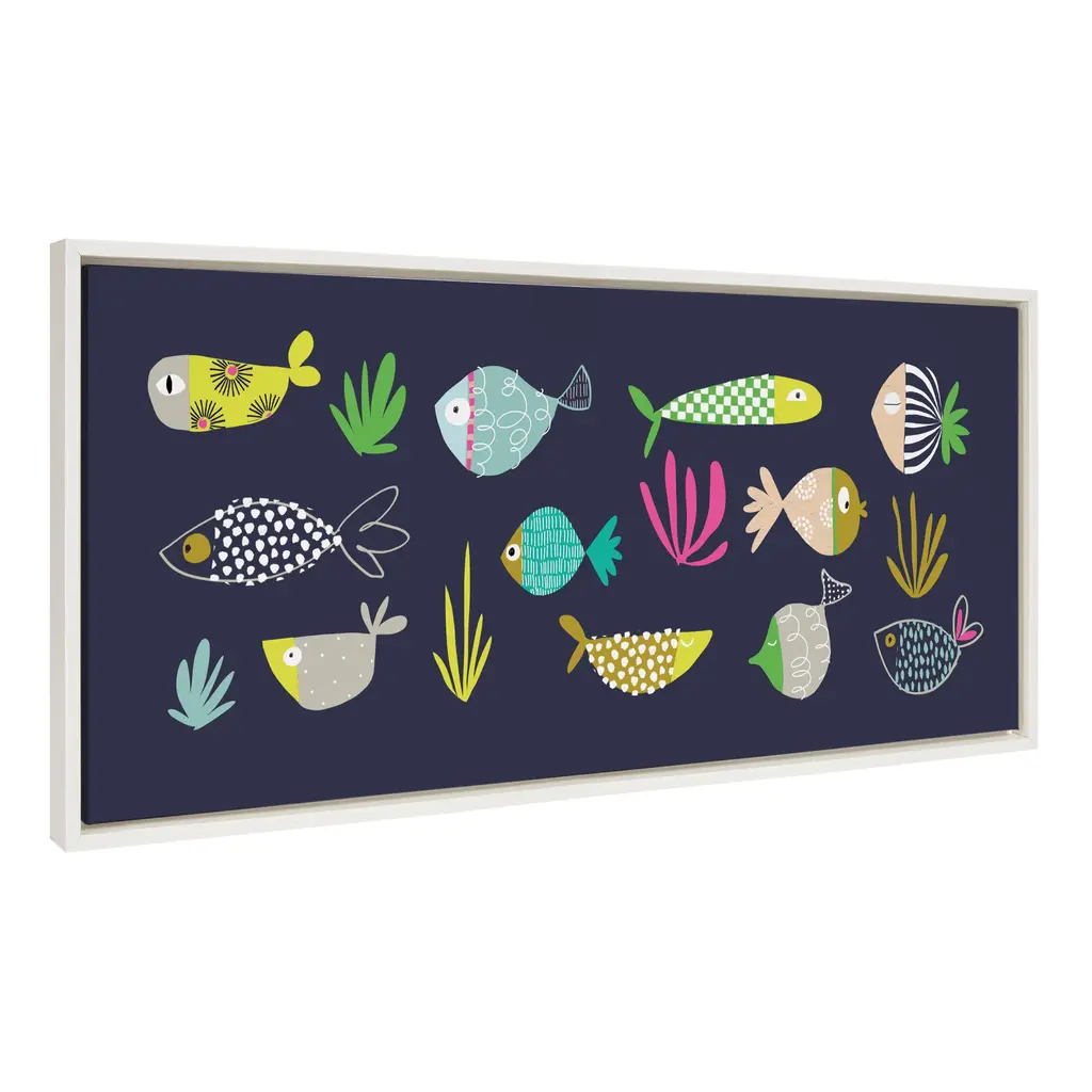 Immerse yourself in an enchanting underwater world with this delightful artwork by Turnowsky. It features playful, colorful fish in vibrant colors, perfect for adding a touch of whimsy and marine charm to your wall decor. Framed in the USA in Waunakee, Wisconsin, this modern floating canvas art is sure to bring joy to your space. Our design team curates art that will fit perfectly in any room of your home. Showcase this art in your living room, bedroom, home office, kitchen, bathroom, nursery, or anywhere you want to bring a little beauty and charm to your walls. Specializing in home décor, we are continually bringing timeless works of art for the traditional decorator as well as trend-forward pieces for that eclectic art lover. Our high-quality framed canvas art also makes excellent gifts for birthdays, holidays, or housewarming parties. Printed on gallery-wrapped canvas and framed with a simple gallery frame this wall art is easy to display on the wall and will match with any décor style. The outer dimensions are 18 inches by 40 inches by 1.6 inches. Print Name: "Playtime Story Fishy Friends"