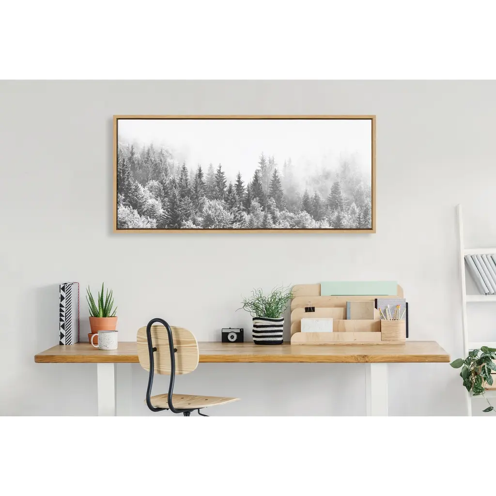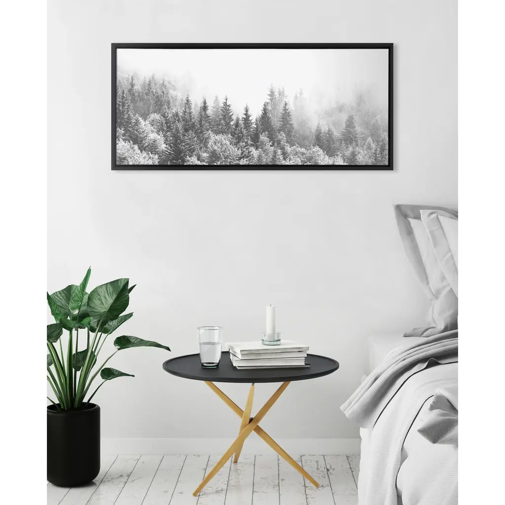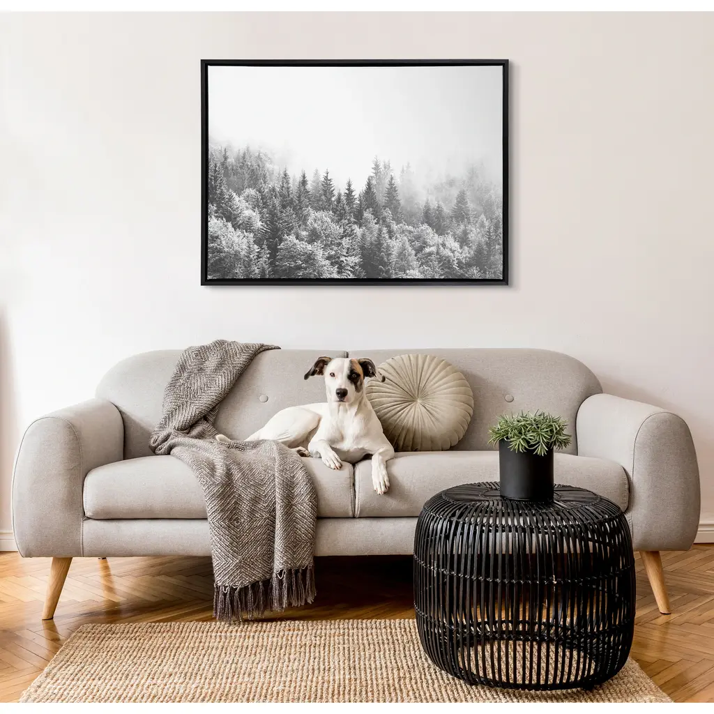 This is the only forest you want to get lost in (figuratively, of course). This nature-themed art print brings the mystifying beauty of the wilderness to your home. Framed in the USA in Waunakee, Wisconsin, this floating canvas art will be a pleasure to look at every day in your living room, bedroom, office, or any room in the home. This art print also makes an excellent gift for birthdays, holidays, or house-warming parties. Printed on gallery-wrapped canvas and framed with a lightweight polystyrene frame, this wall art has two hangers already attached to the MDF back for easy wall display. The outer dimensions are 38 inches by 28 inches by 1.6 inches. Print Name: "Forest On A Foggy Day BW"