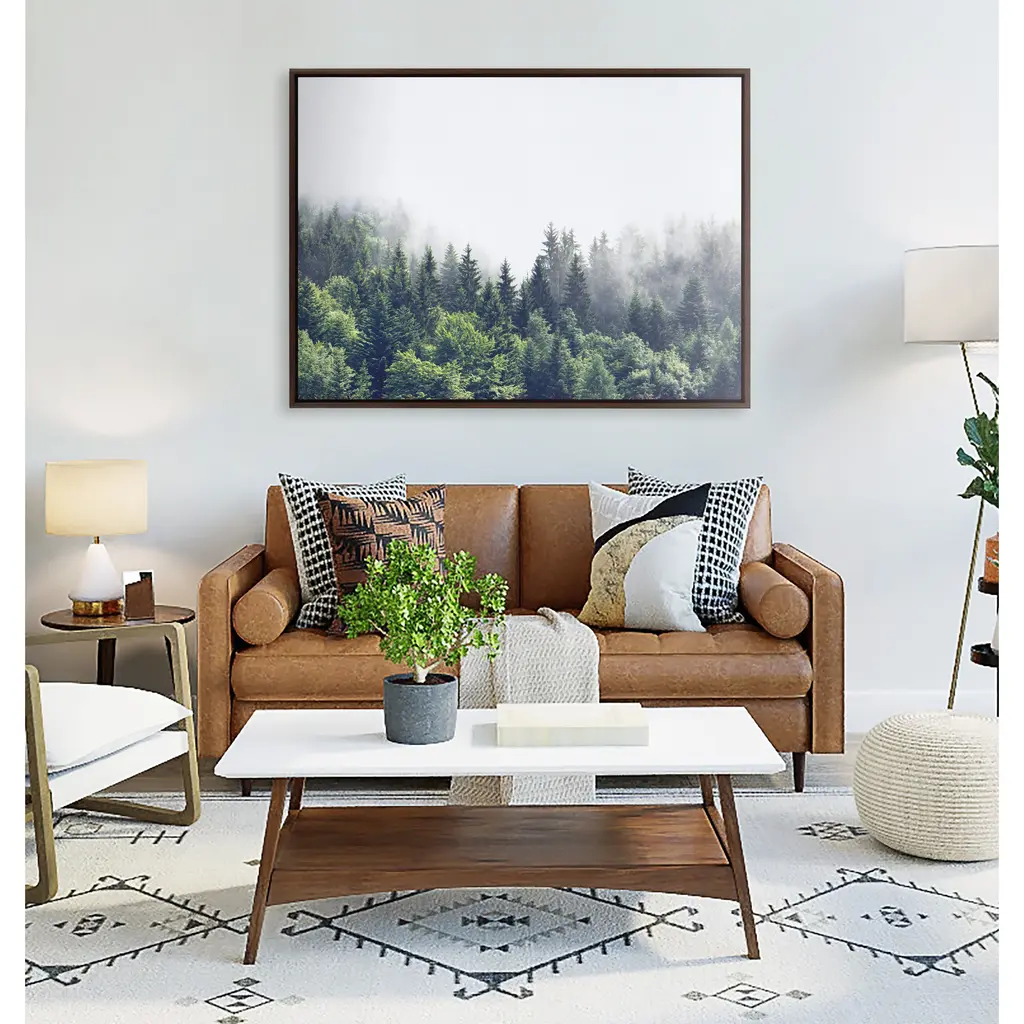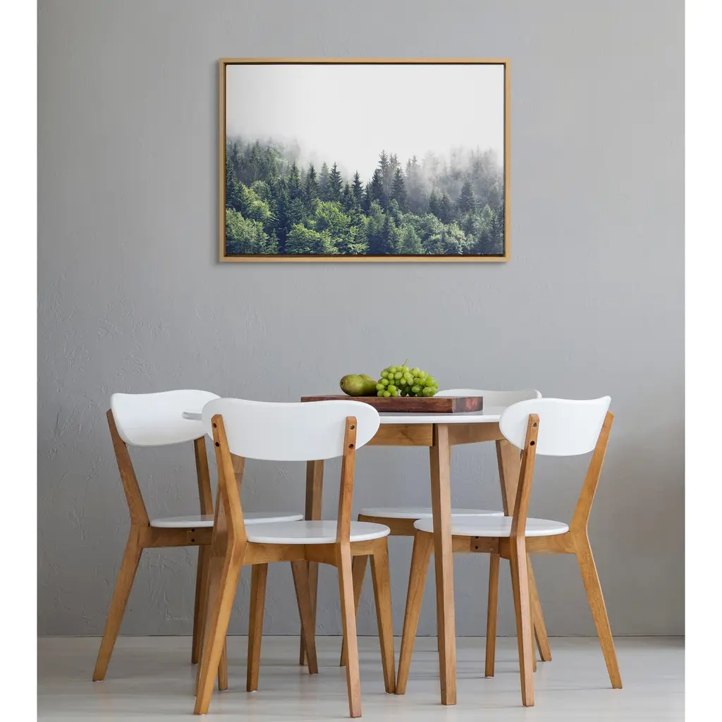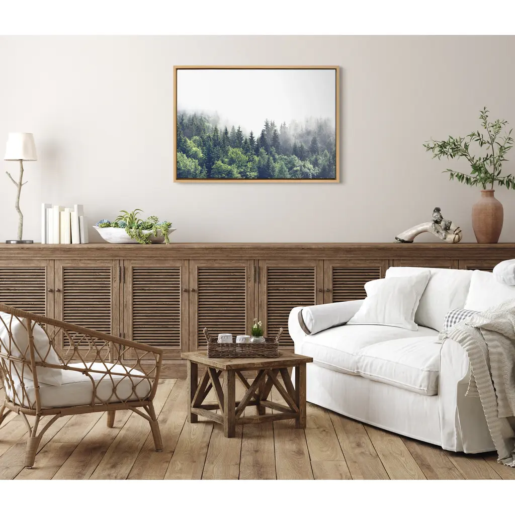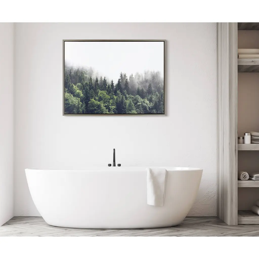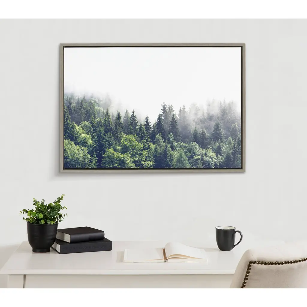 Hike into the woods without leaving your couch with this rustic, mystifying print of a forest landscape. This floating canvas art will be a pleasure to look at every day in your living room, bedroom, office, or any room in the home that could use a glimpse of lush greenery in the mist. This art print also makes an excellent gift for birthdays, holidays, or house-warmings. Printed on gallery-wrapped canvas and framed with a lightweight polystyrene frame, this wall art has two hangers already attached to the MDF back for easy wall display. The outer dimensions are 33 inches tall by 23 inches wide by 1.63 inches deep. Print Name: "Lush Green Forest on a Foggy Day"
