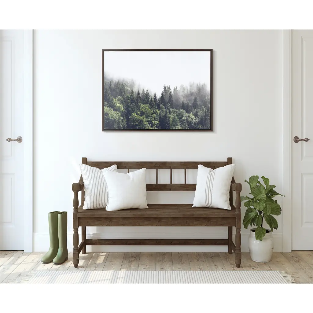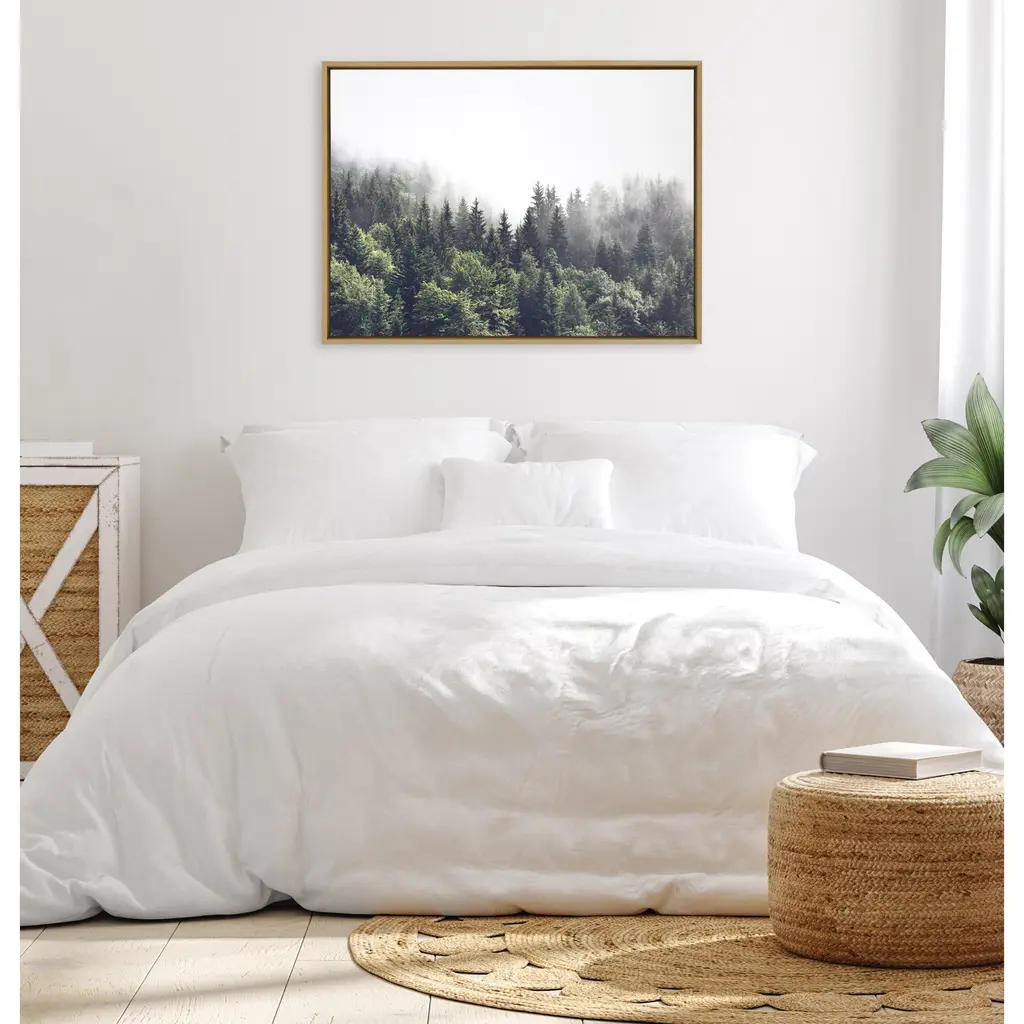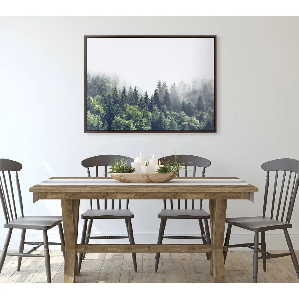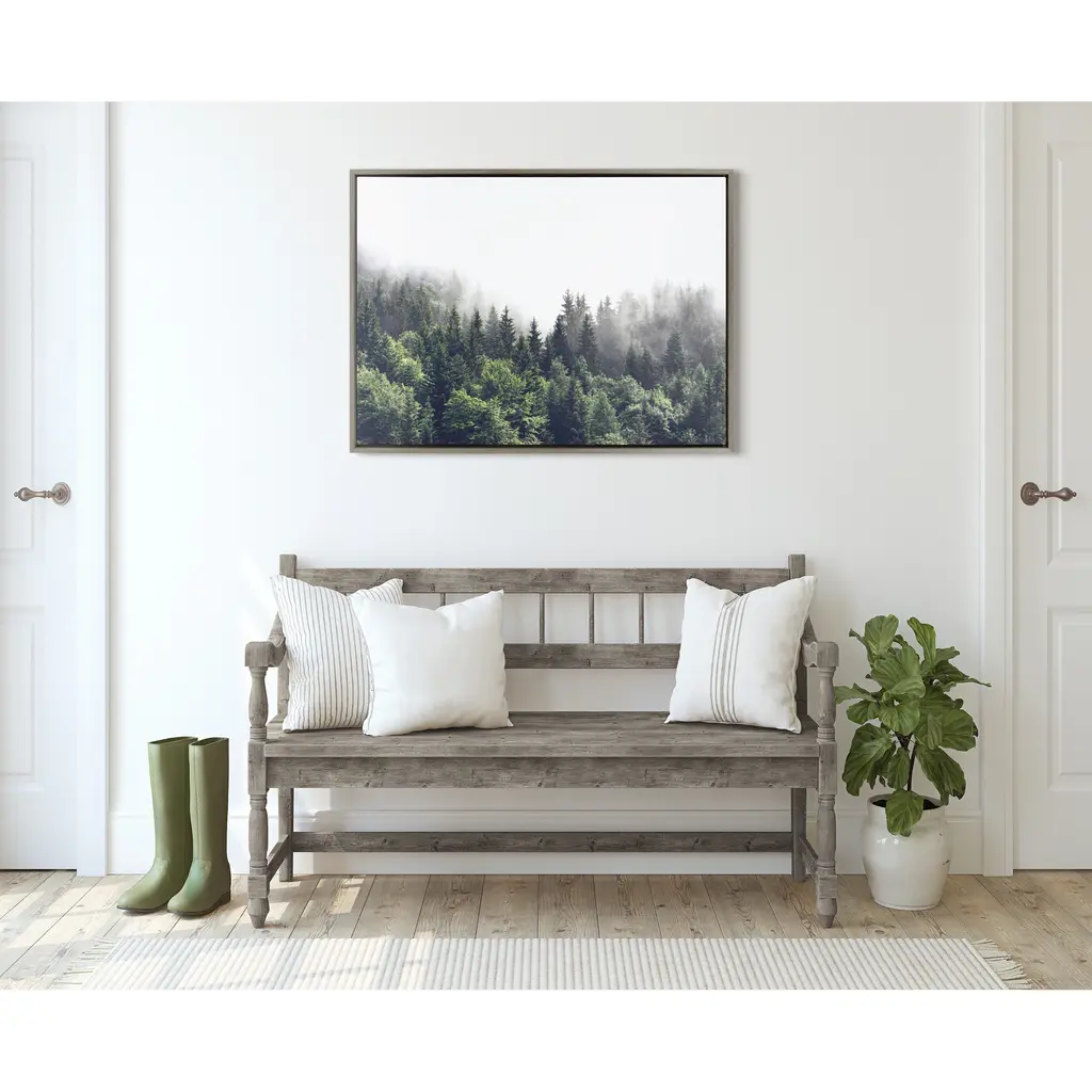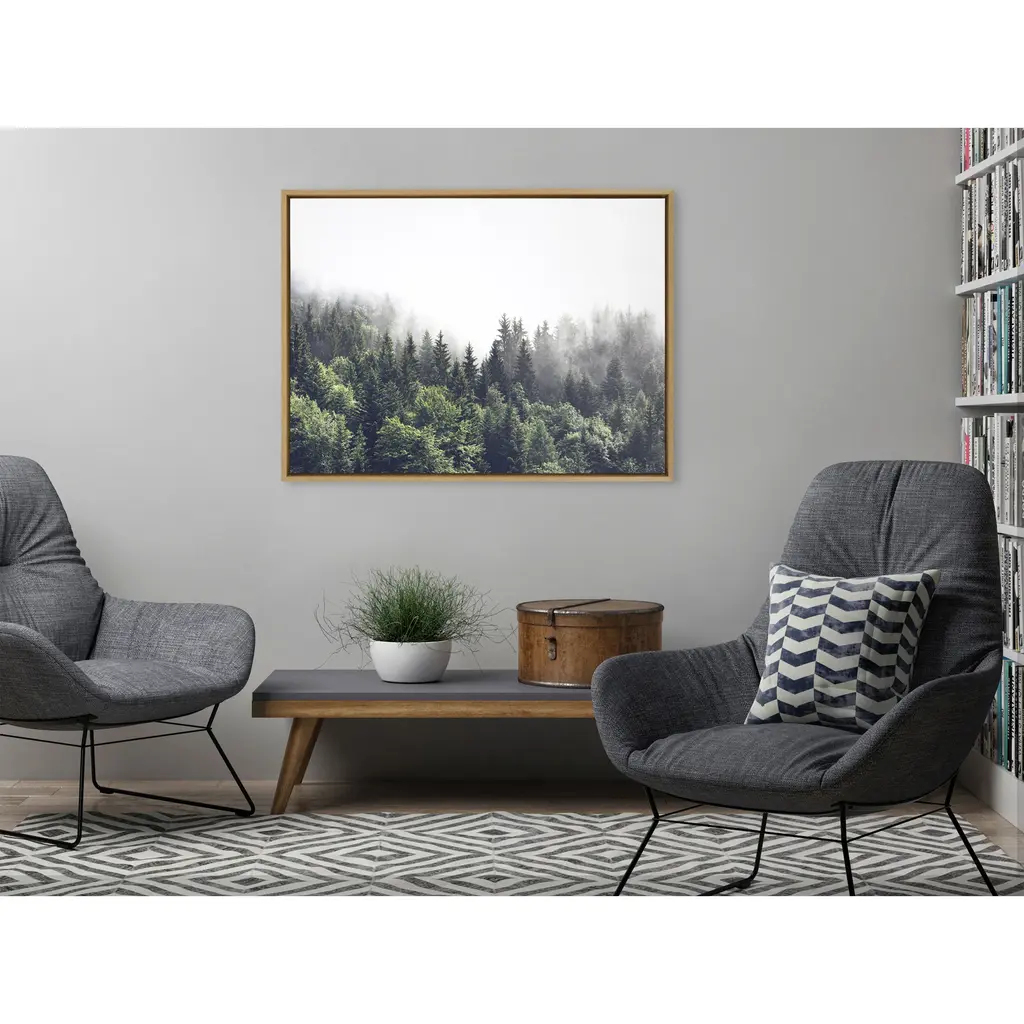 Hike into the woods without leaving your couch with this rustic, mystifying print of a forest landscape. This floating canvas art will be a pleasure to look at every day in your living room, bedroom, office, or any room in the home that could use a glimpse of lush greenery in the mist. This art print also makes an excellent gift for birthdays, holidays, or house-warmings. Printed on gallery-wrapped canvas and framed with a lightweight polystyrene frame, this wall art has two hangers already attached to the MDF back for easy wall display. The outer dimensions are 33 inches tall by 23 inches wide by 1.63 inches deep. Print Name: "Lush Green Forest on a Foggy Day"