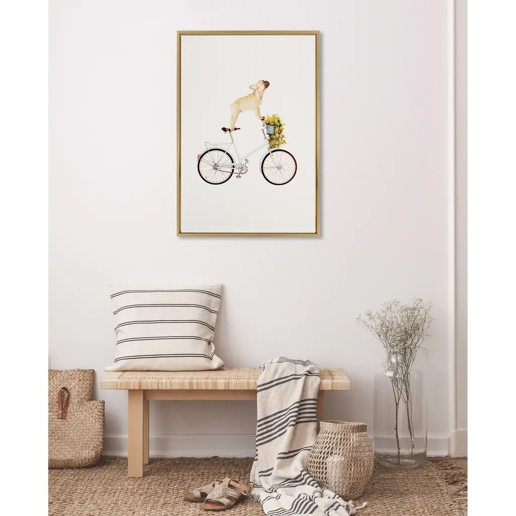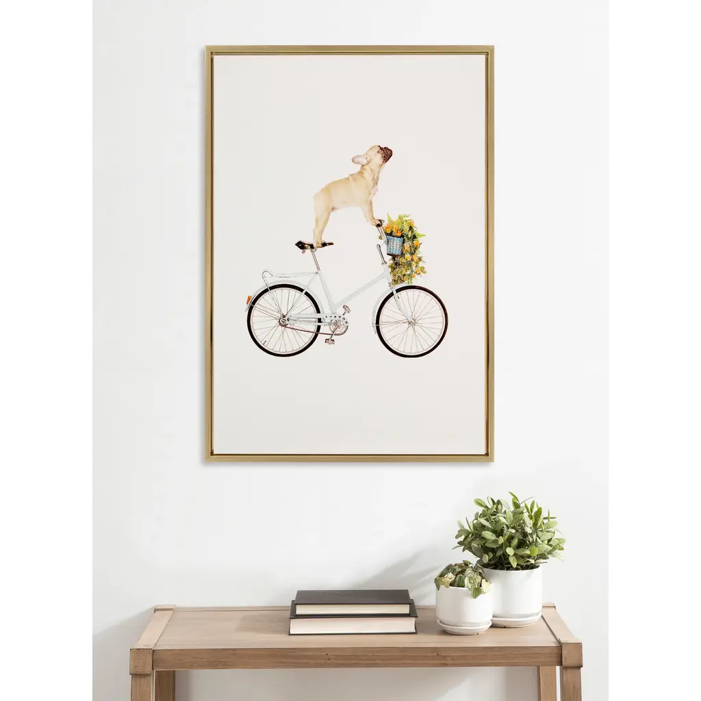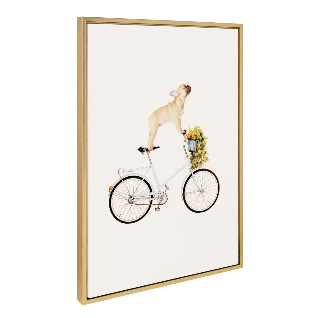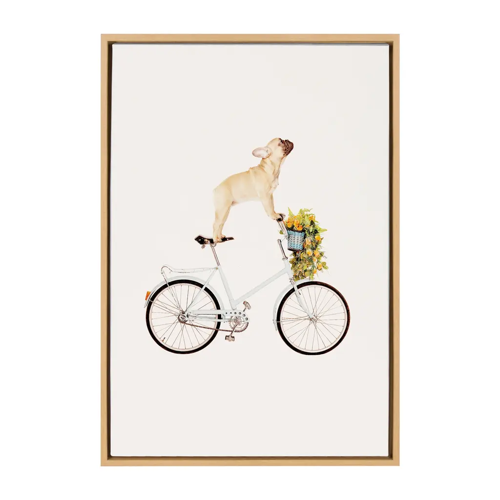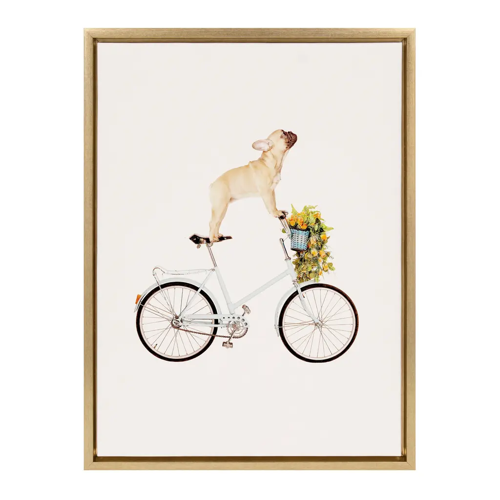 Highlight your love of dogs with this framed canvas art print, featuring a French Bulldog sitting playfully on a bicycle. Gallery-wrapped and framed to give a floating appearance, this wall art comes with two attached sawtooth hangers for quick and easy mounting. A white background and soft colors make this piece easy to pair with your existing decor.