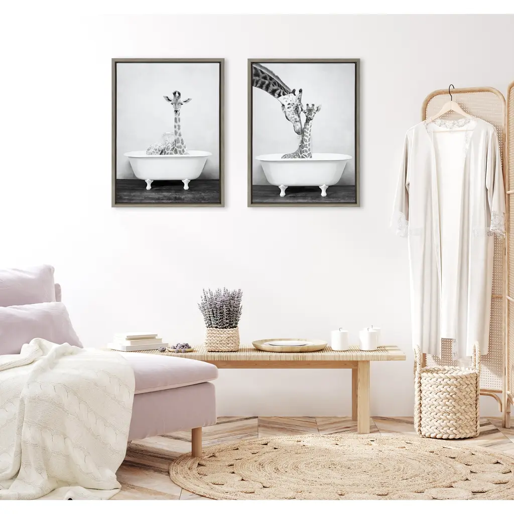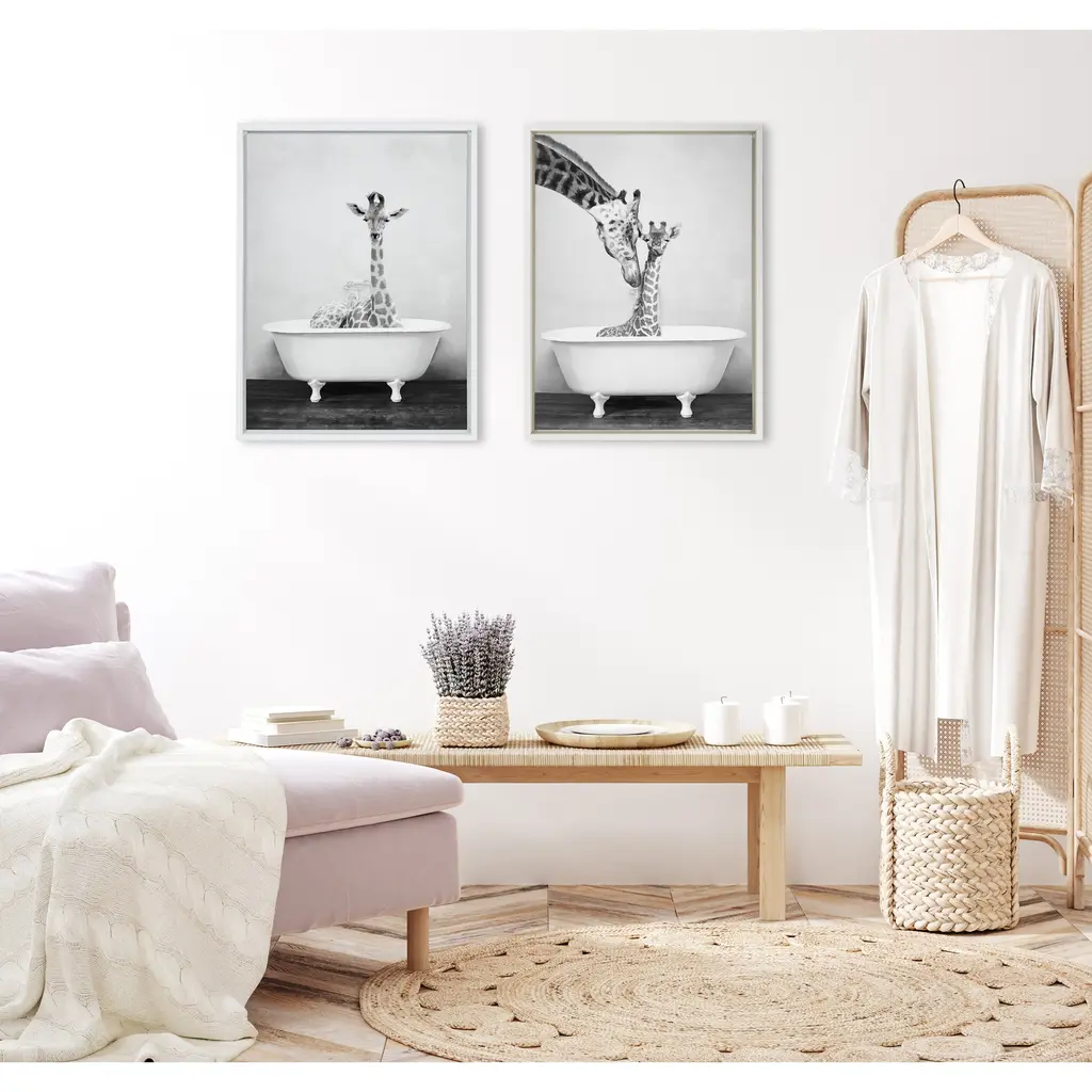 Add a touch of whimsy to your bathroom with DesignOvation's Sylvie 'Giraffe in Tub' framed canvas by Amy Peterson. A gallery-wrapped canvas in a high-quality glossy white polystyrene frame enhances the beauty of the piece. Two sawtooth hangers are attached to the inset back for quick and easy wall display.