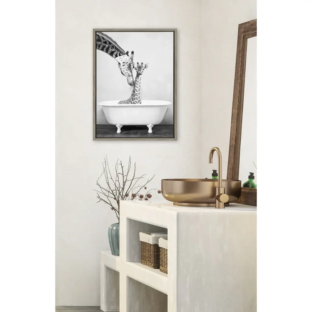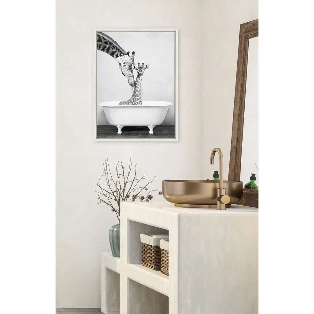 Add a touch of whimsy to your bathroom with DesignOvation's Sylvie 'Giraffe in Tub' framed canvas by Amy Peterson. A gallery-wrapped canvas in a high-quality glossy white polystyrene frame enhances the beauty of the piece. Two sawtooth hangers are attached to the inset back for quick and easy wall display.