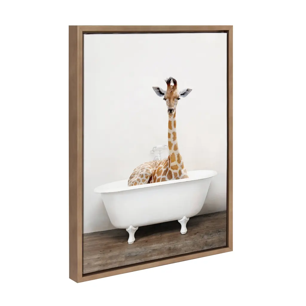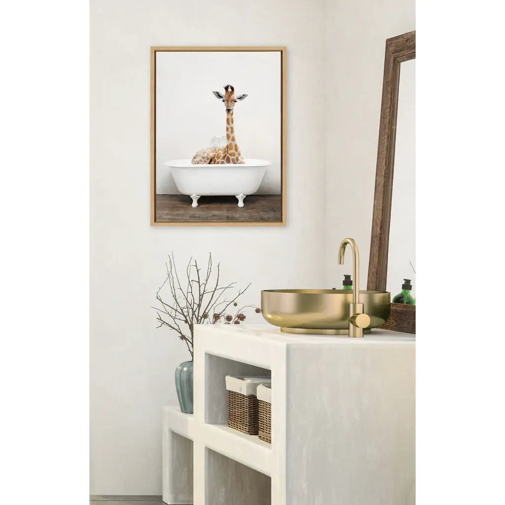 Make a bold impression on your house guests with this whimsical animal art piece by artist Amy Peterson. With its sleek modern frame, this fun, contemporary design is the perfect art piece to add to your home decor collection. Framed in the USA in Waunakee, Wisconsin, this floating canvas art will be a pleasure to look at every day in your living room, bedroom, nursery, or any room in the home. This art print also makes an excellent gift for birthdays, holidays, or house-warming parties. Printed on gallery-wrapped canvas and framed with a lightweight polystyrene frame, this wall art is easy to display on the wall. The outer dimensions are 18 inches by 24 inches by 1.6 inches. Print Name: "Giraffe 2 in the Tub Color"