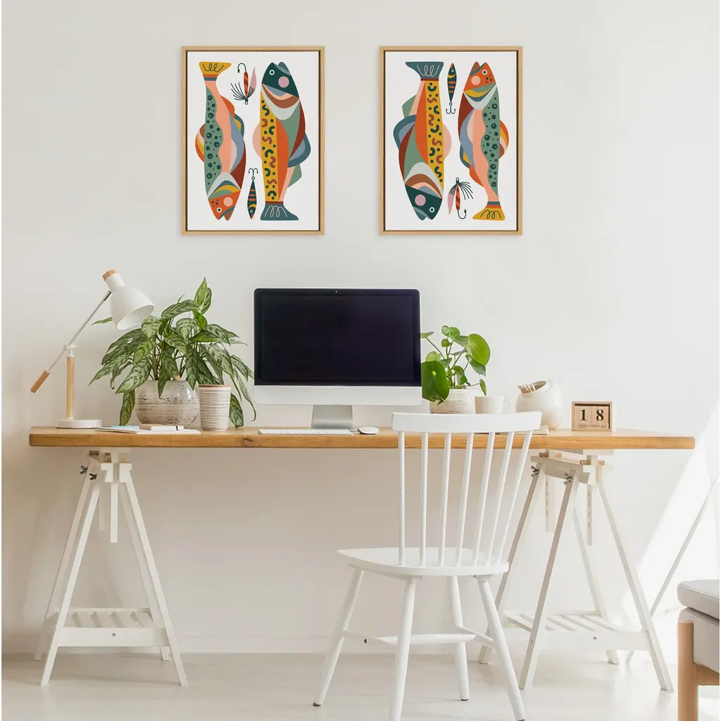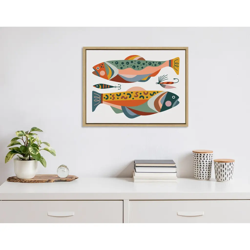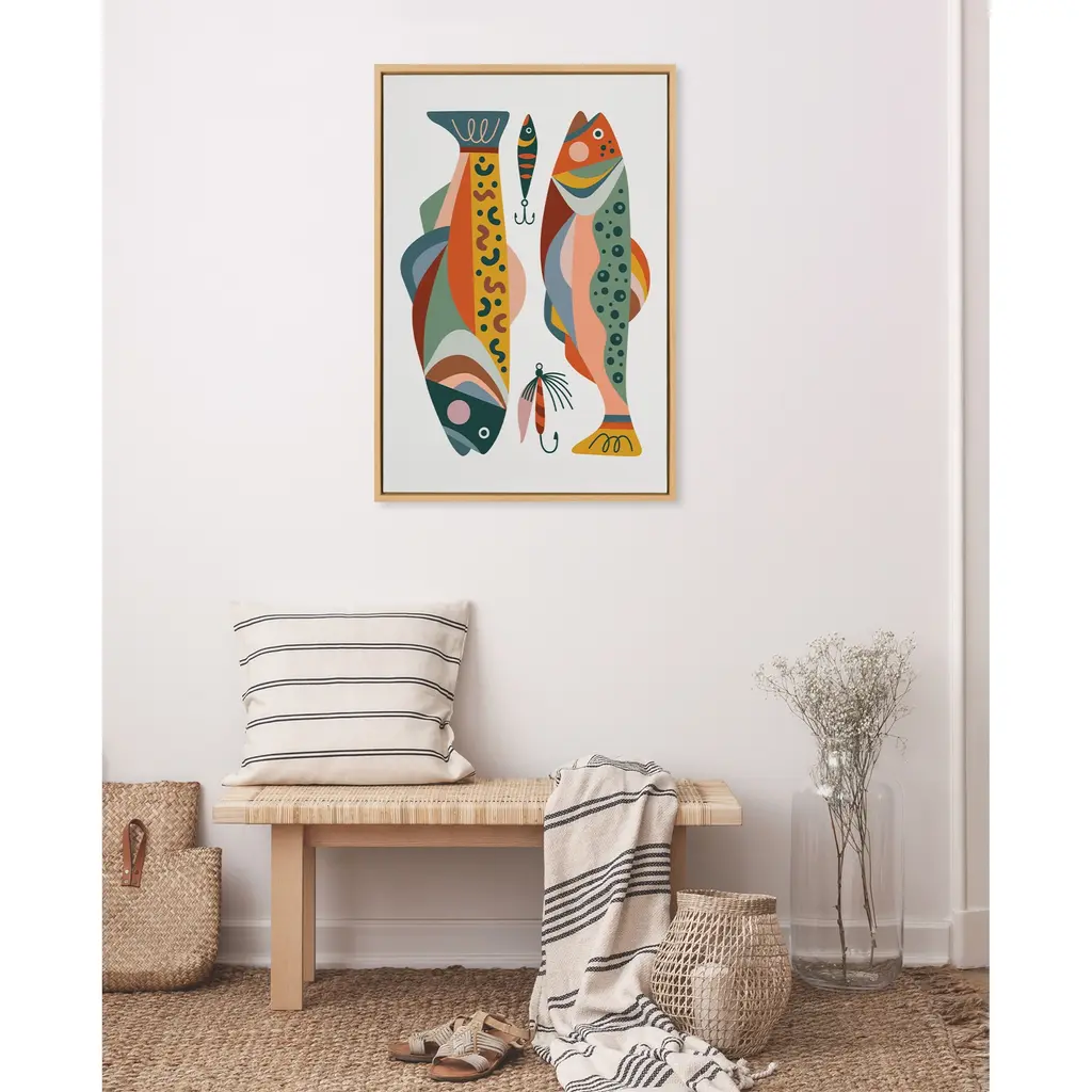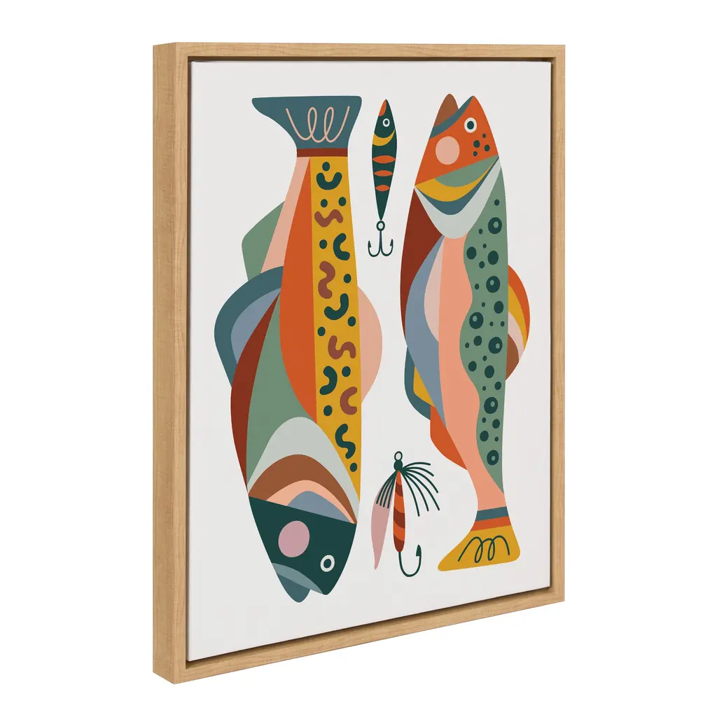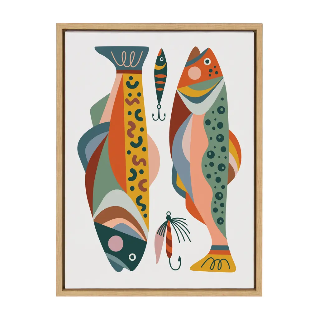 Brighten up your living space with this colorful fish illustration by Rachel Lee of My Dream Wall. Perfect for adding a splash of color and personality to any room in your home, this print is sure to become a beloved element of your home decor. Framed in the USA in Waunakee, Wisconsin, this modern floating canvas art is sure to bring joy to your space. Our design team curates art that will fit perfectly in any room of your home. Showcase this art in your living room, bedroom, home office, kitchen, bathroom, nursery, or anywhere you want to bring a little beauty and charm to your walls. Specializing in home décor, we are continually bringing timeless works of art for the traditional decorator as well as trend-forward pieces for that eclectic art lover. Our high-quality framed canvas art also makes excellent gifts for birthdays, holidays, or housewarming parties. Printed on gallery-wrapped canvas and framed with a simple gallery frame this wall art is easy to display on the wall and will match with any décor style. The outer dimensions are 18 inches by 24 inches by 1.6 inches. Print Name: "Gone Fishing"