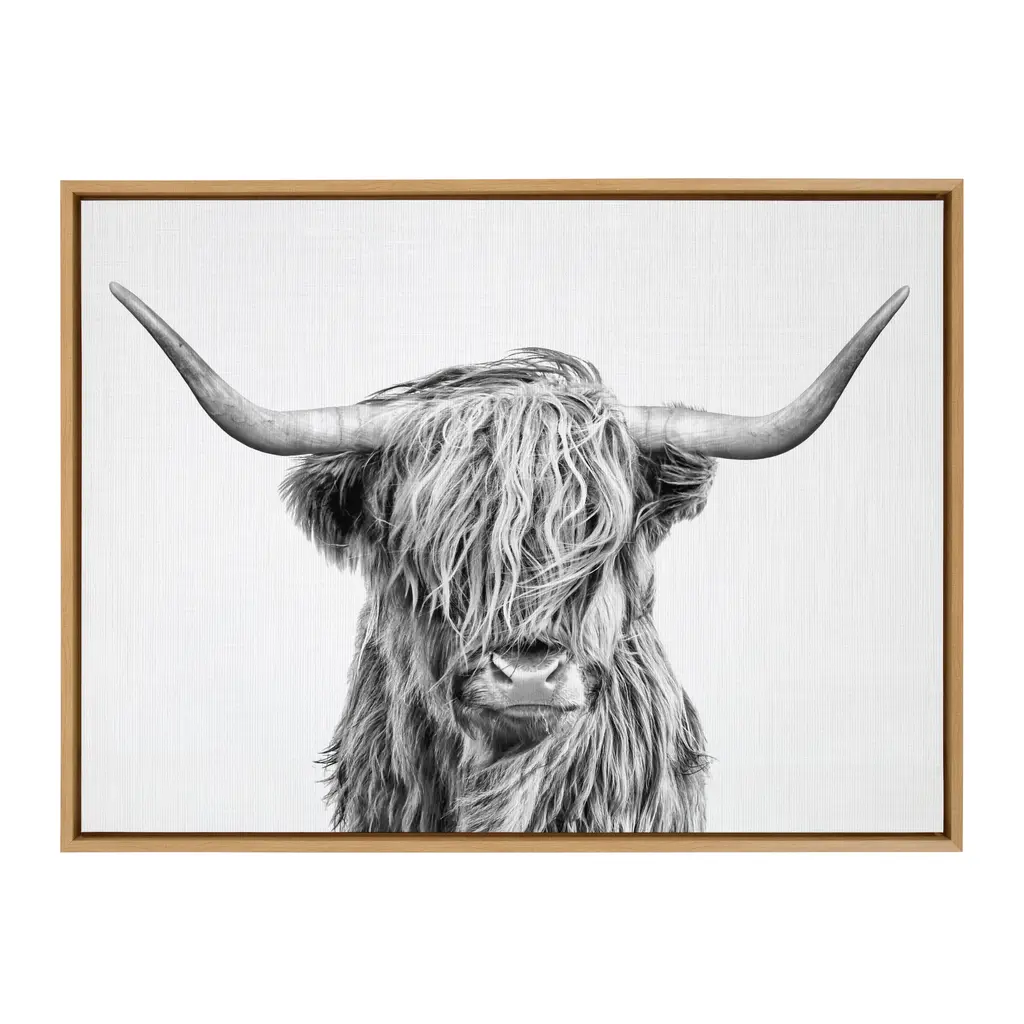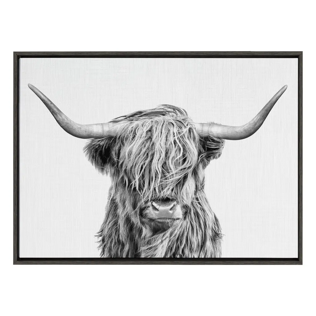 This chic, rustic cow portrait is a great way to give your home a modern farmhouse flair with its black and white look and regal-looking cow. Framed in the USA in Waunakee, Wisconsin, this floating canvas art will be a pleasure to look at every day in your living room, bedroom, nursery, or any room in the home. This art print also makes an excellent gift for birthdays, holidays, or housewarming parties. Printed on gallery-wrapped canvas and framed with a lightweight polystyrene frame, this wall art is easy to display on the wall. The outer dimensions are 28 inches by 38 inches by 1.6 inches. Print Name: "Highland Cow 2"