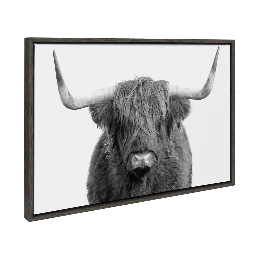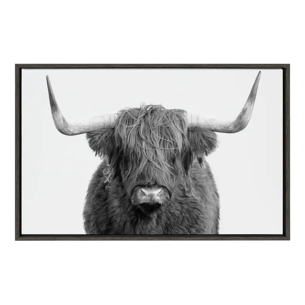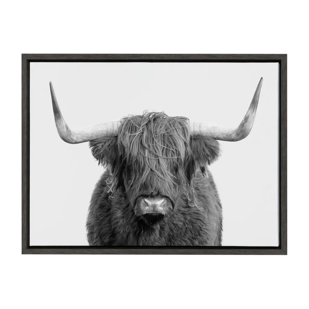 Add an extra bit of whimsy to your home and showcase you love of animals with the Kate and Laurel Sylvie Highland Cow Framed Canvas. This adorable piece of art was printed and framed in Kate and Laurel's hometown of Waunakee, Wisconsin, this floating canvas wall art would make the perfect addition to any nursery, living room or kitchen. We print this art on gallery wrapped canvas and frame it in a gray woodgrain high quality polystyrene frame. Each printed canvas also includes two sawtooth hangers already attached to the black inset back for easy wall display. The outer dimensions are 23 inches tall by 33 inches wide by 1.6 inches deep. Print Name: "B&W Highland Cow No. 1" About the artist: Amy Peterson started working on her craft at an early age and continues to sharpen her skills as a production artist in many of San Francisco's technical creative agencies. Creating colorful and uplifting art is the key to Amy's "Happy Place." Her favorite pieces come together with the helping hands of a good cup of coffee and some great music. Nothing ignites her passion like creating work that brings joy and good vibes into the world!
