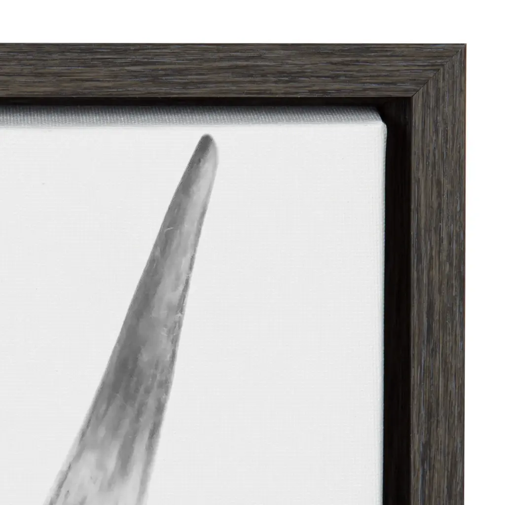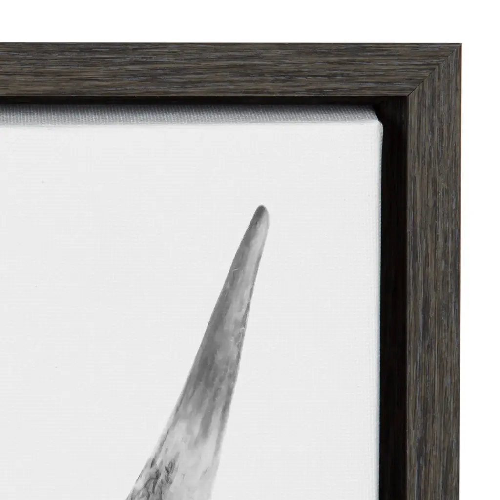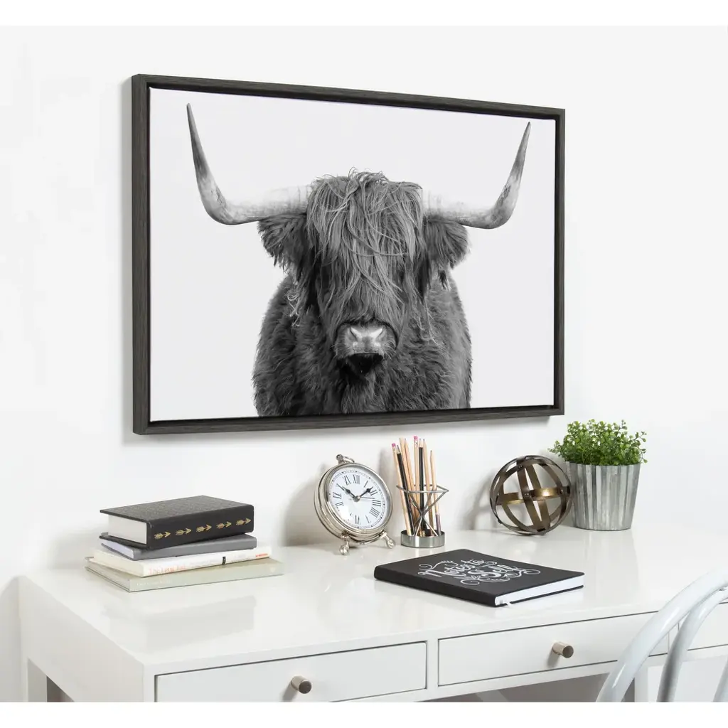 Add an extra bit of whimsy to your home and showcase you love of animals with the Kate and Laurel Sylvie Highland Cow Framed Canvas. This adorable piece of art was printed and framed in Kate and Laurel's hometown of Waunakee, Wisconsin, this floating canvas wall art would make the perfect addition to any nursery, living room or kitchen. We print this art on gallery wrapped canvas and frame it in a gray woodgrain high quality polystyrene frame. Each printed canvas also includes two sawtooth hangers already attached to the black inset back for easy wall display. The outer dimensions are 23 inches tall by 33 inches wide by 1.6 inches deep. Print Name: "B&W Highland Cow No. 1" About the artist: Amy Peterson started working on her craft at an early age and continues to sharpen her skills as a production artist in many of San Francisco's technical creative agencies. Creating colorful and uplifting art is the key to Amy's "Happy Place." Her favorite pieces come together with the helping hands of a good cup of coffee and some great music. Nothing ignites her passion like creating work that brings joy and good vibes into the world!