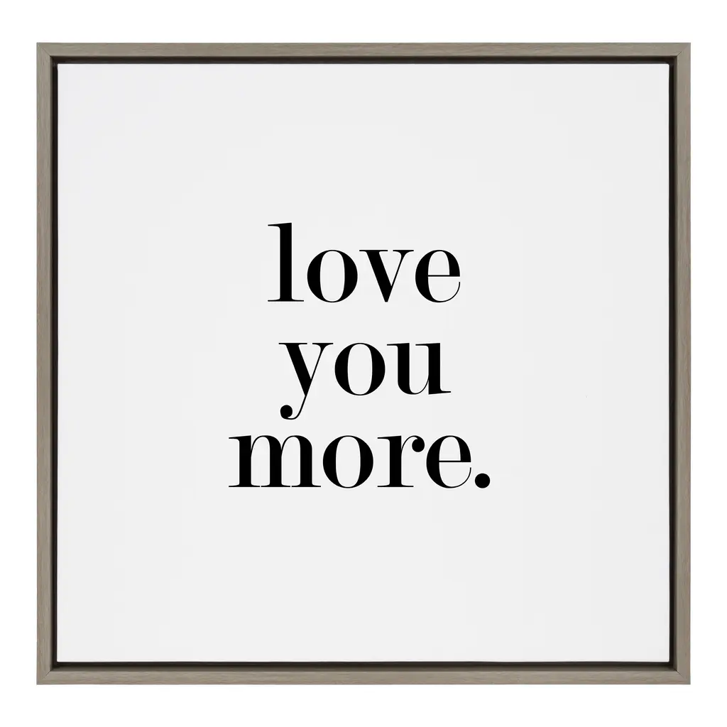Remind yourself and loved ones how much you love them with this minimal yet romantic wall art. Framed in the USA in Waunakee, Wisconsin, this floating canvas art will be a pleasure to look at every day in your living room, bedroom, office, or any room in the home that needs a touching reminder that you are loved. Printed on linen-textured canvas and framed with a lightweight polystyrene frame, this wall art has two hangers already attached to the MDF back for easy wall display. The outer dimensions are 24 inches tall by 24 inches wide by 1.63 inches deep. Print Name: "Love You More"