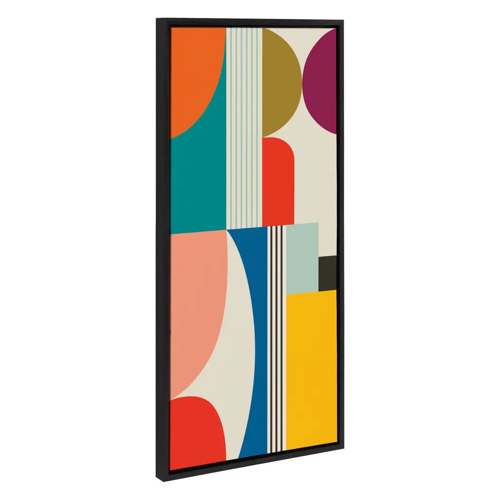 Want to add color to your walls without the hassle of painting? Check out this vibrant multicolored abstract! Its unique color palette and midcentury vibe bring a splash of vibrancy to any wall of the home. Framed in the USA in Waunakee, Wisconsin, this floating canvas art will be a pleasure to look at every day in your living room, bedroom, office, or any room in the home. This art print also makes an excellent gift for birthdays, holidays, or house-warming parties. Printed on gallery-wrapped canvas and framed with a lightweight polystyrene frame, this wall art has two hangers already attached to the MDF back for easy wall display. The outer dimensions are 33 inches by 23 inches by 1.6 inches. Print Name: "Mid Century Modern Pattern"
