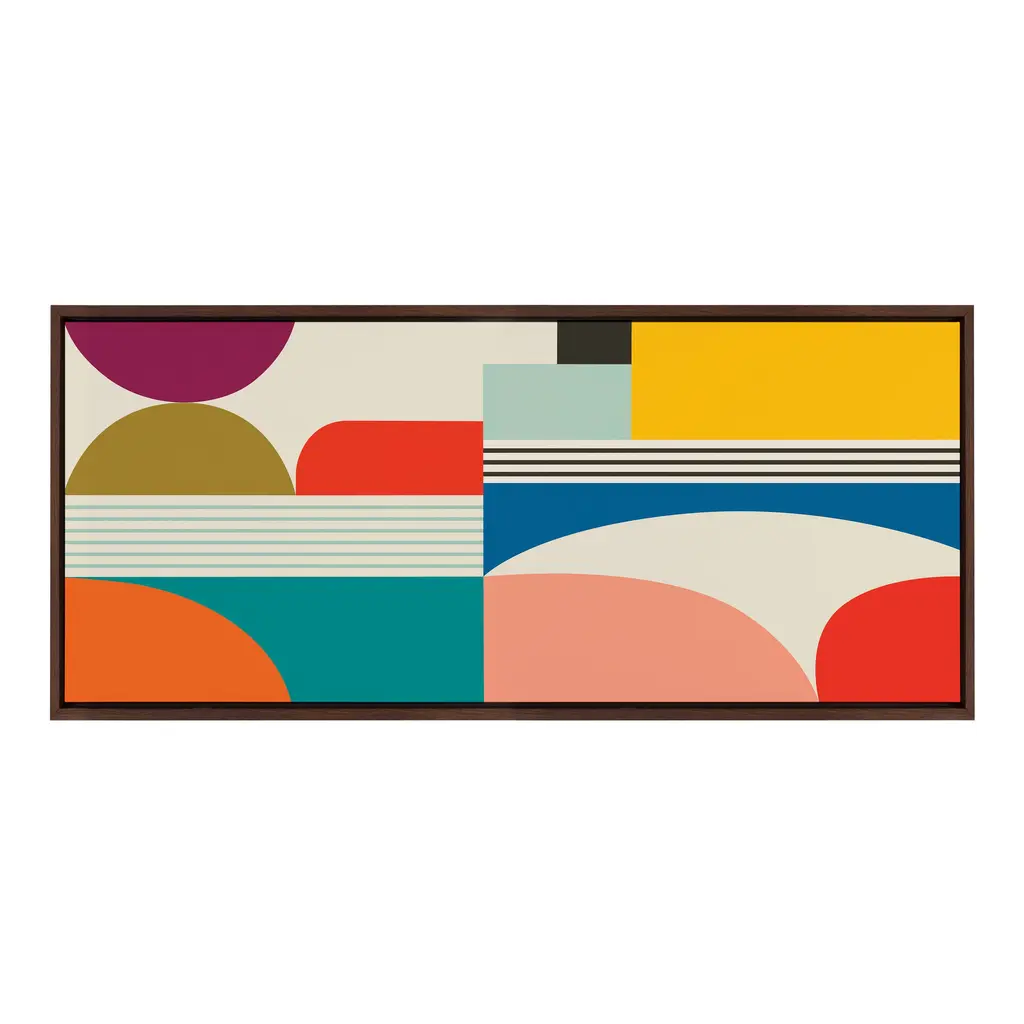 Want to add color to your walls without the hassle of painting? Check out this vibrant multicolored abstract! Its unique color palette and midcentury vibe bring a splash of vibrancy to any wall of the home. Framed in the USA in Waunakee, Wisconsin, this floating canvas art will be a pleasure to look at every day in your living room, bedroom, office, or any room in the home. This art print also makes an excellent gift for birthdays, holidays, or house-warming parties. Printed on gallery-wrapped canvas and framed with a lightweight polystyrene frame, this wall art has two hangers already attached to the MDF back for easy wall display. The outer dimensions are 33 inches by 23 inches by 1.6 inches. Print Name: "Mid Century Modern Pattern"
