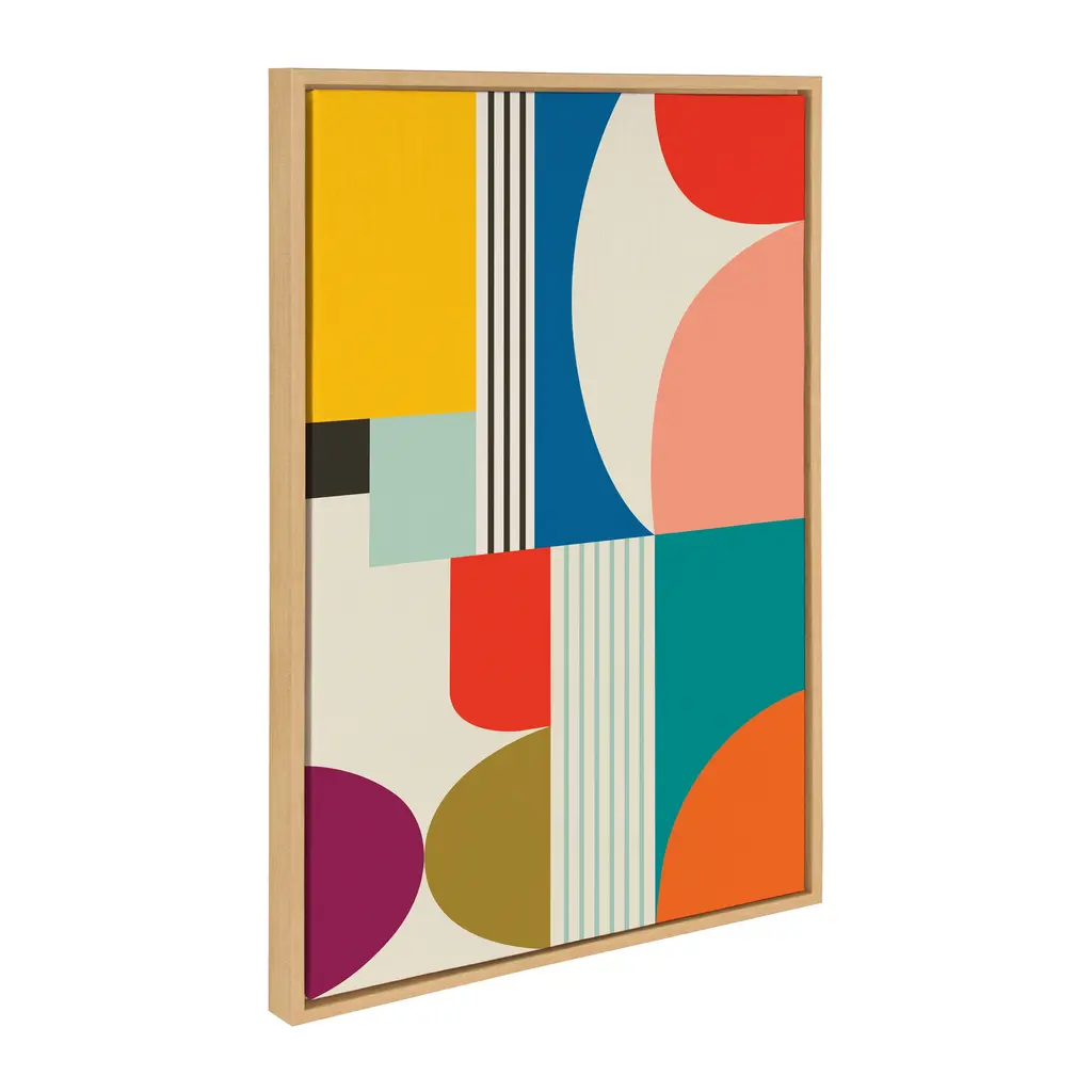 Want to add color to your walls without the hassle of painting? Check out this vibrant multicolored abstract! Its unique color palette and midcentury vibe bring a splash of vibrancy to any wall of the home. Framed in the USA in Waunakee, Wisconsin, this floating canvas art will be a pleasure to look at every day in your living room, bedroom, office, or any room in the home. This art print also makes an excellent gift for birthdays, holidays, or house-warming parties. Printed on gallery-wrapped canvas and framed with a lightweight polystyrene frame, this wall art has two hangers already attached to the MDF back for easy wall display. The outer dimensions are 33 inches by 23 inches by 1.6 inches. Print Name: "Mid Century Modern Pattern"
