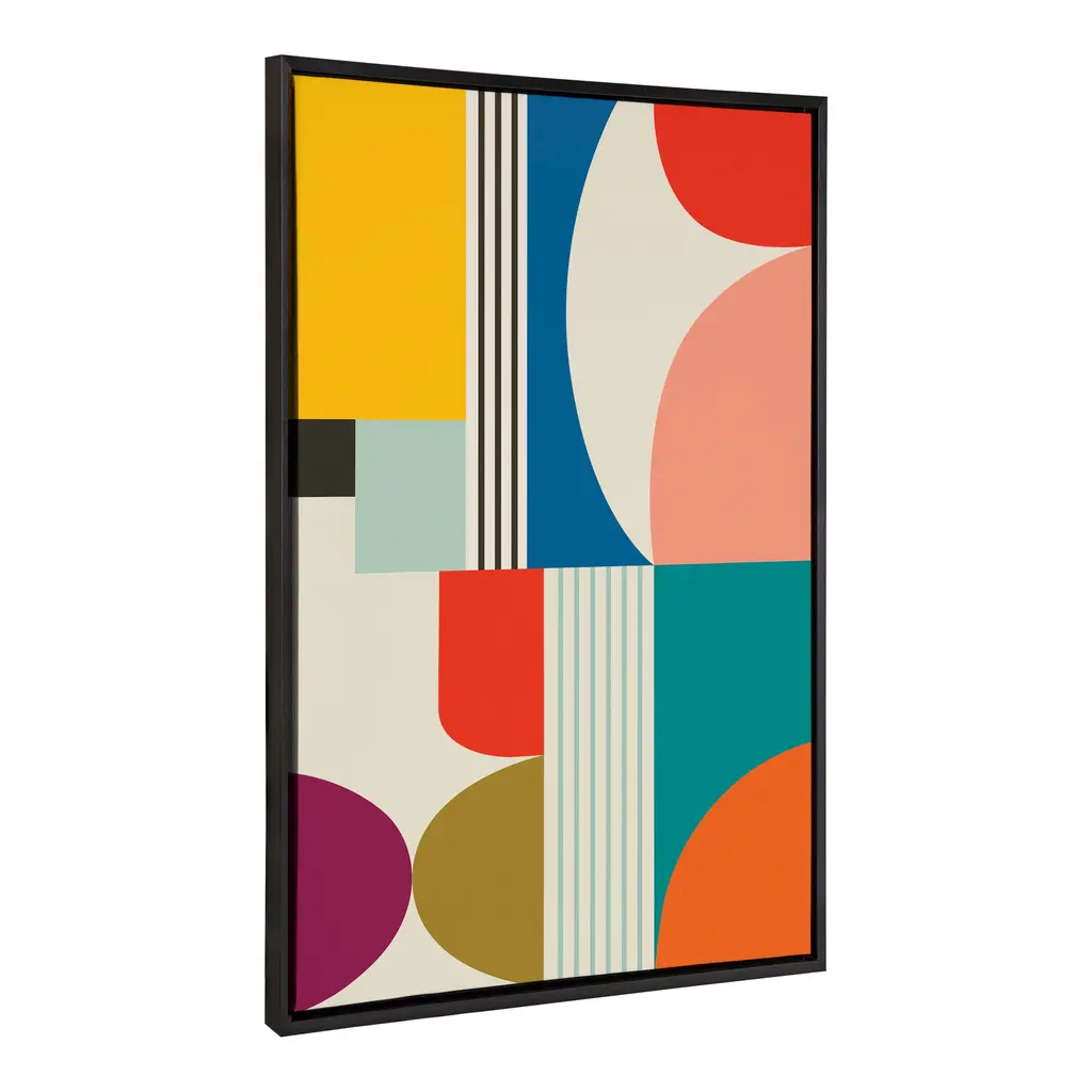 Want to add color to your walls without the hassle of painting? Check out this vibrant multicolored abstract! Its unique color palette and midcentury vibe bring a splash of vibrancy to any wall of the home. Framed in the USA in Waunakee, Wisconsin, this floating canvas art will be a pleasure to look at every day in your living room, bedroom, office, or any room in the home. This art print also makes an excellent gift for birthdays, holidays, or house-warming parties. Printed on gallery-wrapped canvas and framed with a lightweight polystyrene frame, this wall art has two hangers already attached to the MDF back for easy wall display. The outer dimensions are 33 inches by 23 inches by 1.6 inches. Print Name: "Mid Century Modern Pattern"