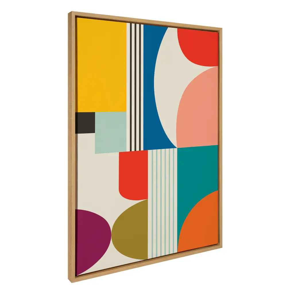 Want to add color to your walls without the hassle of painting? Check out this vibrant multicolored abstract! Its unique color palette and midcentury vibe bring a splash of vibrancy to any wall of the home. Framed in the USA in Waunakee, Wisconsin, this floating canvas art will be a pleasure to look at every day in your living room, bedroom, office, or any room in the home. This art print also makes an excellent gift for birthdays, holidays, or house-warming parties. Printed on gallery-wrapped canvas and framed with a lightweight polystyrene frame, this wall art has two hangers already attached to the MDF back for easy wall display. The outer dimensions are 33 inches by 23 inches by 1.6 inches. Print Name: "Mid Century Modern Pattern"