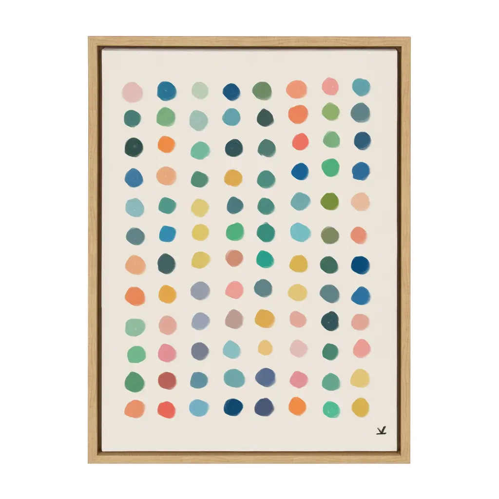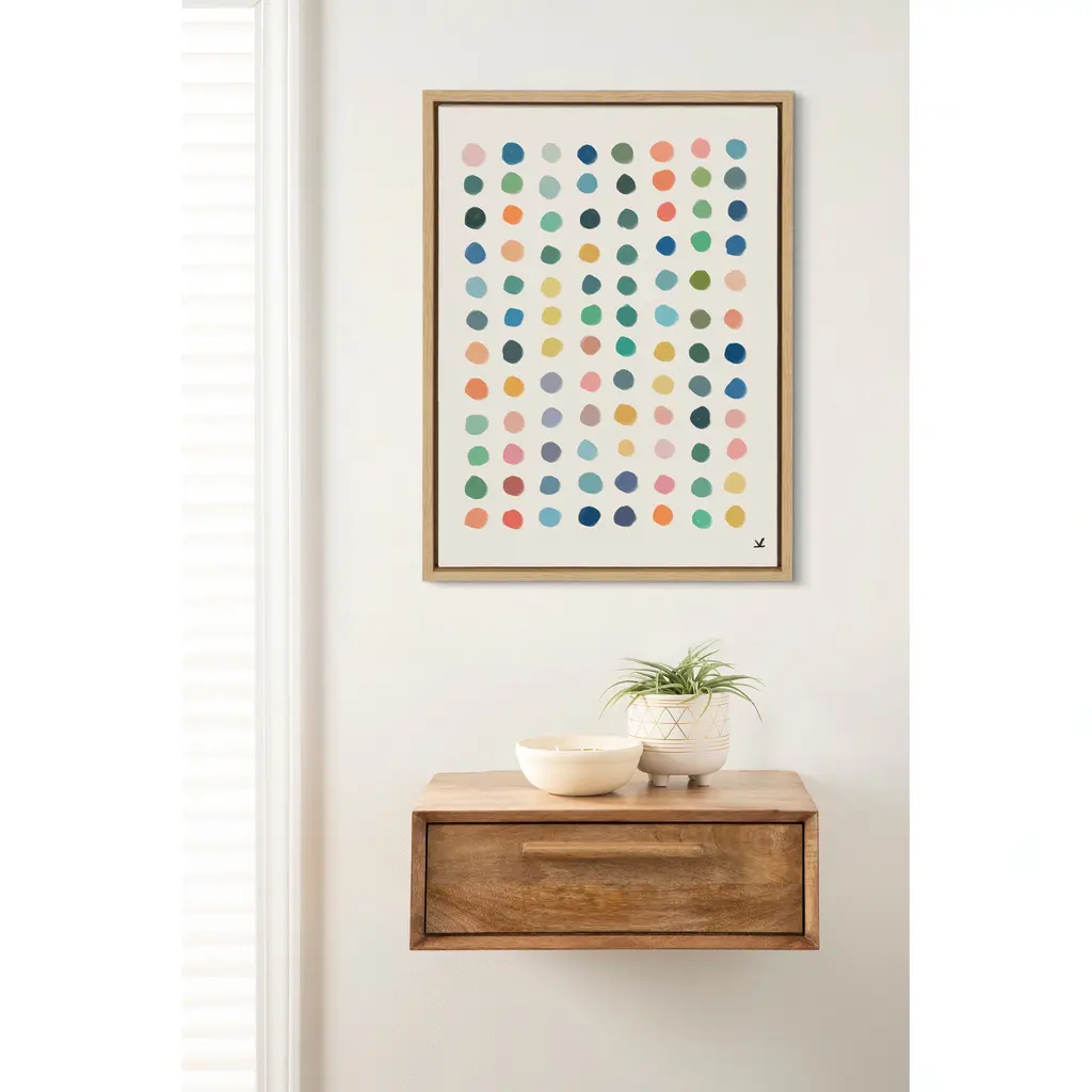 Capture calmness in your space with a colorful yet organized polka dot art print! Framed in the USA in Waunakee, Wisconsin, this floating canvas art will be a pleasure to look at every day in your living room, bedroom, nursery, or any room in the home. This art print also makes an excellent gift for birthdays, holidays, or house-warming parties. Printed on gallery-wrapped canvas and framed with a lightweight polystyrene frame, this wall art has two hangers already attached to the MDF back for easy wall display. The outer dimensions are 24 inches by 18 inches by 1.6 inches. Print Name: "Meditation 3"