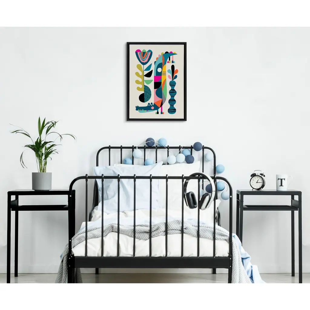 Stay awhile, crocodile! This colorful guy has a mid-century design featuring a wide color palette for a unique, eye-catching accent for your wall. Framed in the USA in Waunakee, Wisconsin, this floating canvas art will be a pleasure to look at every day in your living room, bedroom, nursery, or any room in the home. Printed on gallery-wrapped canvas and framed with a lightweight polystyrene frame, this wall art has two hangers already attached to the MDF back for easy wall display. The outer dimensions are 24 inches tall by 18 inches wide by 1.63 inches deep. Print Name: "Mid-Century Crocodile"