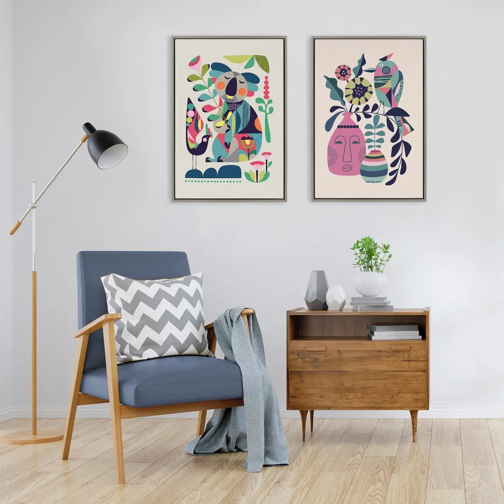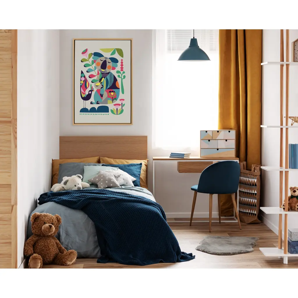 This colorful little dude brings a peaceful yet colorful abstract art piece to any space in your home! Framed in the USA in Waunakee, Wisconsin, this floating canvas art will be a pleasure to look at every day in your living room, bedroom, nursery, or any room in the home. Printed on gallery-wrapped canvas and framed with a lightweight polystyrene frame, this wall art has two hangers already attached to the MDF back for easy wall display. The outer dimensions are 24 inches tall by 18 inches wide by 1.63 inches deep. Print Name: "Mid Century Modern Koala"