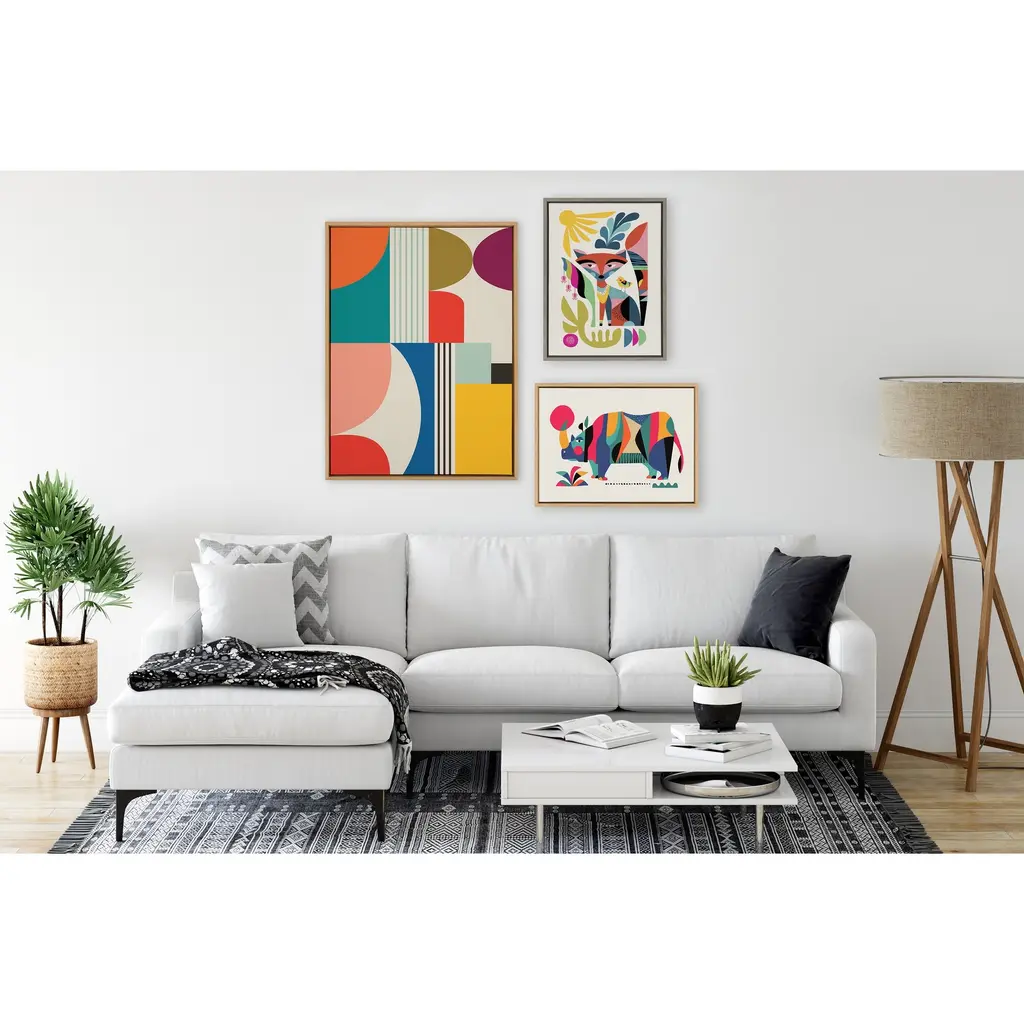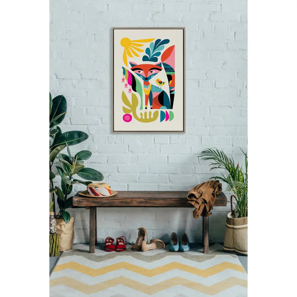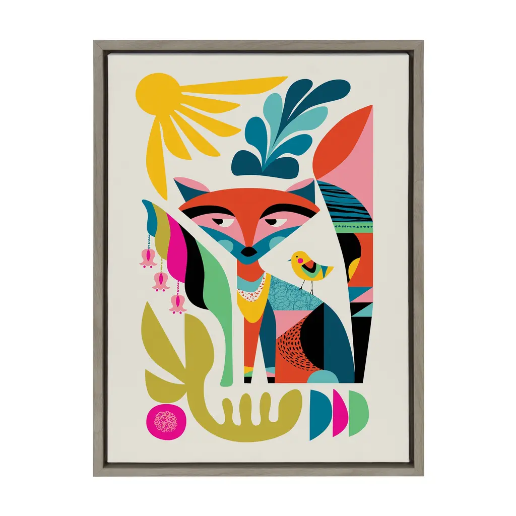 Check out this funky, mid-century fox! Add some vibrant, colorful decor to any wall of your home with this out-of-the-box, mid-century print. Framed in the USA in Waunakee, Wisconsin, this floating canvas art will be a pleasure to look at every day in your living room, bedroom, nursery, or any room in the home. Printed on gallery-wrapped canvas and framed with a lightweight polystyrene frame, this wall art has two hangers already attached to the MDF back for easy wall display. The outer dimensions are 24 inches tall by 18 inches wide by 1.63 inches deep. Print Name: "Mid Century Modern Fox"