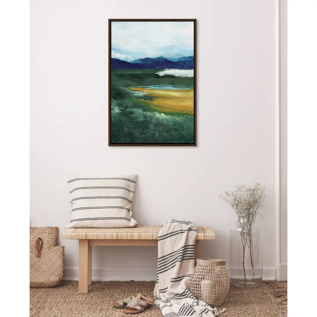 Give your home a soothing view of the serene mountains with this painting by Nikita Jariwala. Its soft tones and delicate brushwork make this a transitional piece anywhere in your home. Framed in the USA in Waunakee, Wisconsin, this modern floating canvas art is sure to bring joy to your space. Our design team curates art that will fit perfectly in any room of your home. Showcase this art in your living room, bedroom, home office, kitchen, bathroom, nursery, or anywhere you want to bring a little beauty and charm to your walls. Specializing in home décor, we are continually bringing timeless works of art for the traditional decorator as well as trend-forward pieces for that eclectic art lover. Our high-quality framed canvas art also makes excellent gifts for birthdays, holidays, or housewarming parties. Printed on gallery-wrapped canvas and framed with a simple gallery frame this wall art is easy to display on the wall and will match with any décor style. The outer dimensions are 18 inches by 24 inches by 1.6 inches. Print Name: "Misty Green"