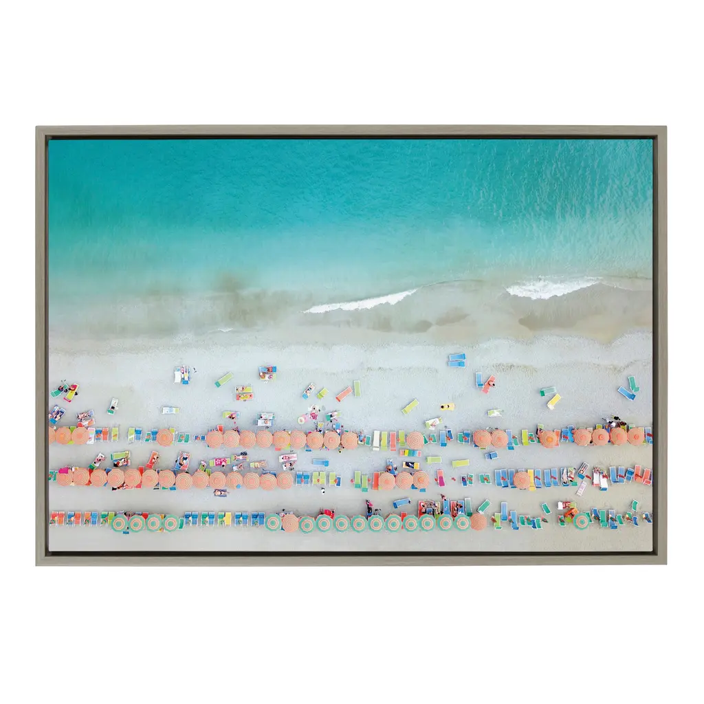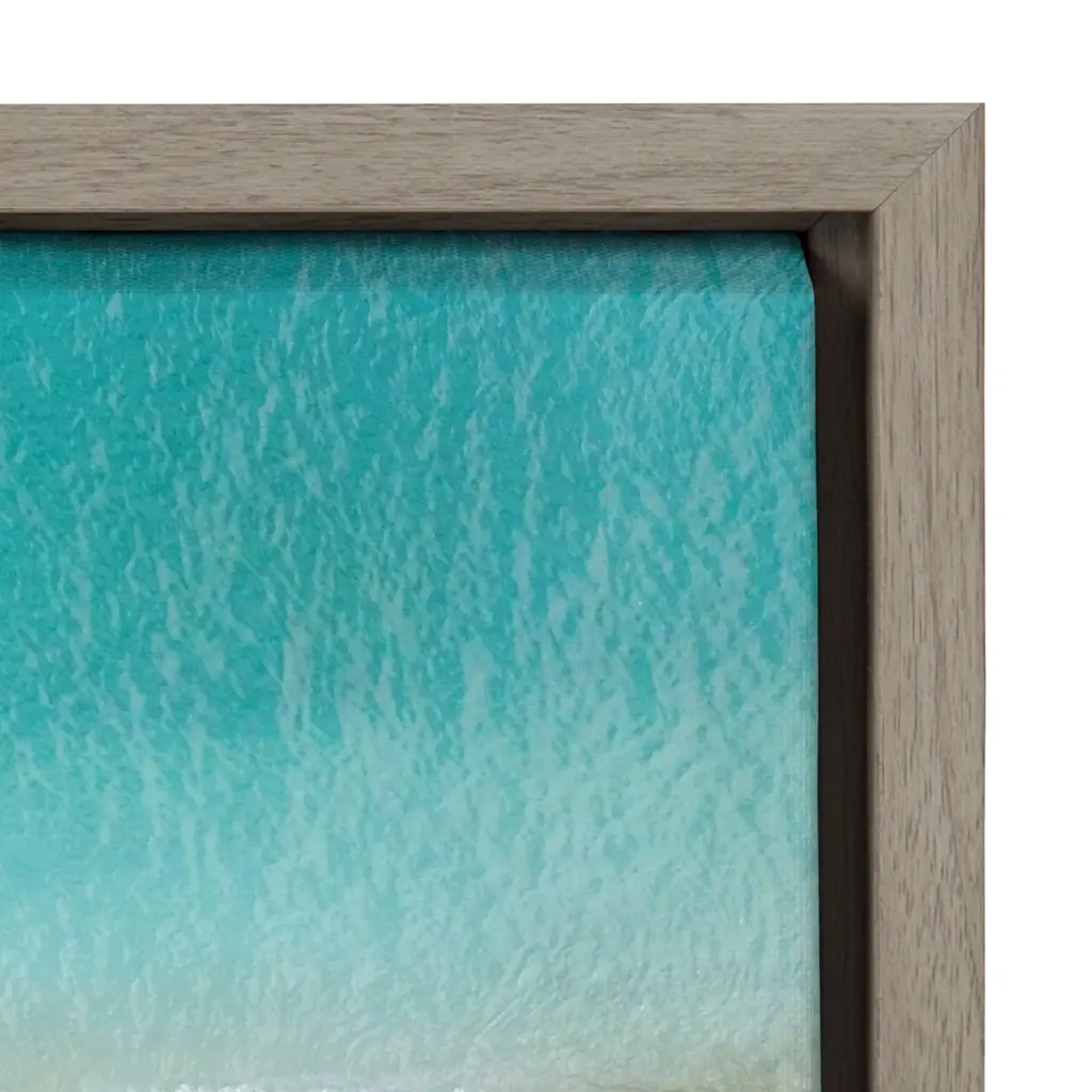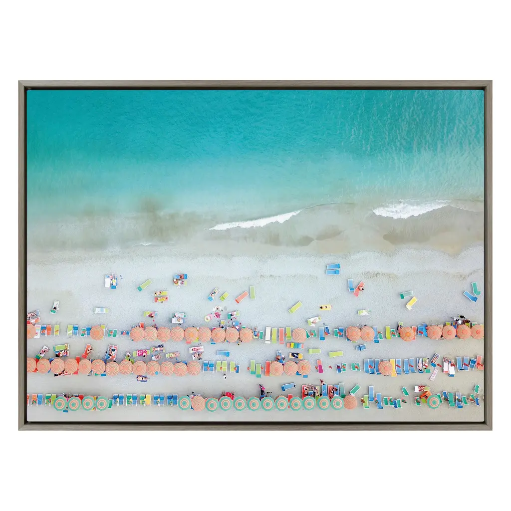 Are you dreaming of those long days at the beach, sand between your toes, hot sun on your skin, sunblock in the air? Well, this print may not take you back to the coast, but it's sure to be the next best thing as an addition to your wall decor. Framed in the USA in Waunakee, Wisconsin, this floating canvas art will be a pleasure to look at every day in your living room, bedroom, nursery, or any room in the home. This art print also makes an excellent gift for birthdays, holidays, or house-warming parties. Printed on gallery-wrapped canvas and framed with a lightweight polystyrene frame, this wall art has two hangers already attached to the MDF back for easy wall display. The outer dimensions are 38 inches by 28 inches by 1.63 inches. Print Name: "Monterosso 6"