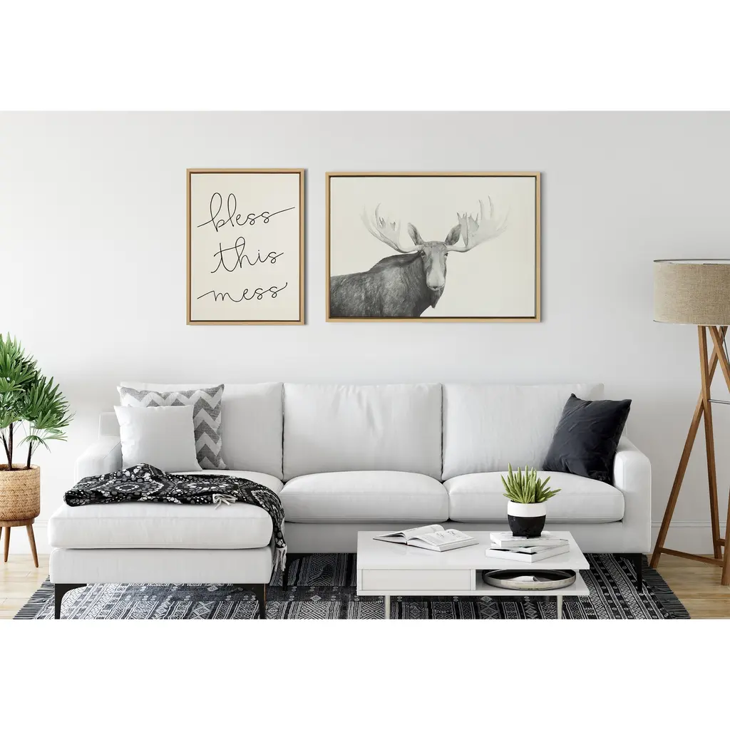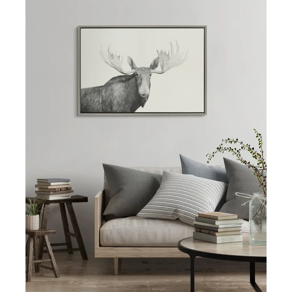 Bring a rustic perspective that embraces the beautiful creatures of the forest with this framed moose art print. This black and white wildlife moose print with it's big antlers is the perfect addition to your fireplace, man cave or hunting shack. Framed in a sleek modern frame, this contemporary design is the perfect art piece to add to your home décor collection. Printed and framed in the USA in Waunakee, Wisconsin, this framed linen textured canvas art will be a pleasure to look at every day in your living room, bedroom, office, or any room in the home. This art print also makes an excellent gift for a birthday, holiday, or housewarming. It has two hangers already attached for easy wall display. The outer dimensions are 33 inches by 23 inches by 1.6 inches. Print Name: "Moose 2 crop BW"
