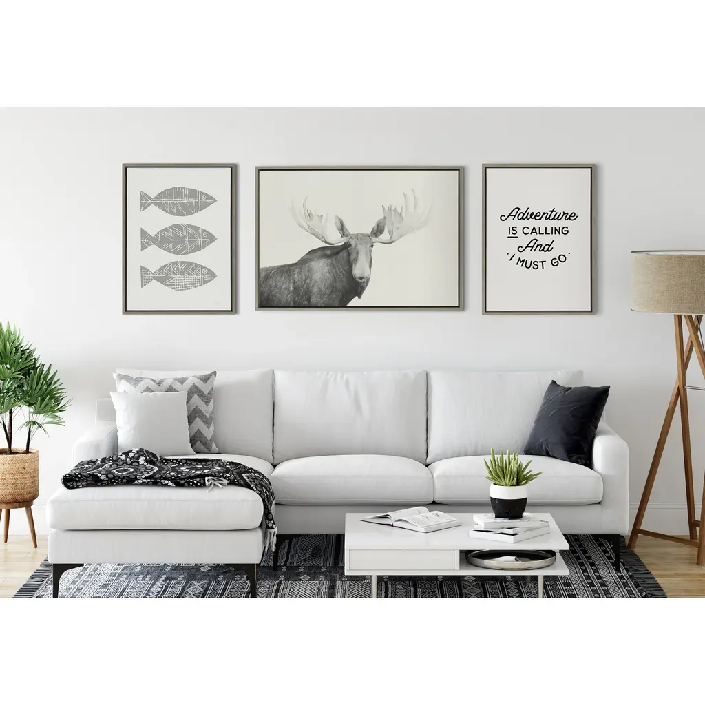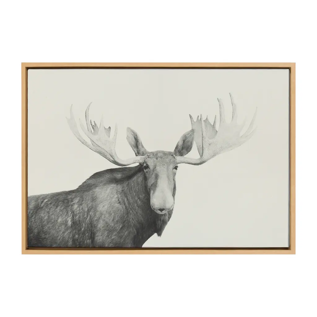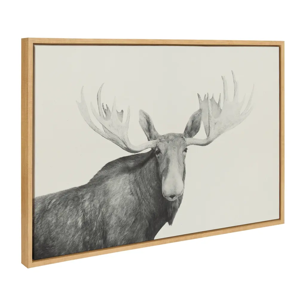 Bring a rustic perspective that embraces the beautiful creatures of the forest with this framed moose art print. This black and white wildlife moose print with it's big antlers is the perfect addition to your fireplace, man cave or hunting shack. Framed in a sleek modern frame, this contemporary design is the perfect art piece to add to your home décor collection. Printed and framed in the USA in Waunakee, Wisconsin, this framed linen textured canvas art will be a pleasure to look at every day in your living room, bedroom, office, or any room in the home. This art print also makes an excellent gift for a birthday, holiday, or housewarming. It has two hangers already attached for easy wall display. The outer dimensions are 33 inches by 23 inches by 1.6 inches. Print Name: "Moose 2 crop BW"