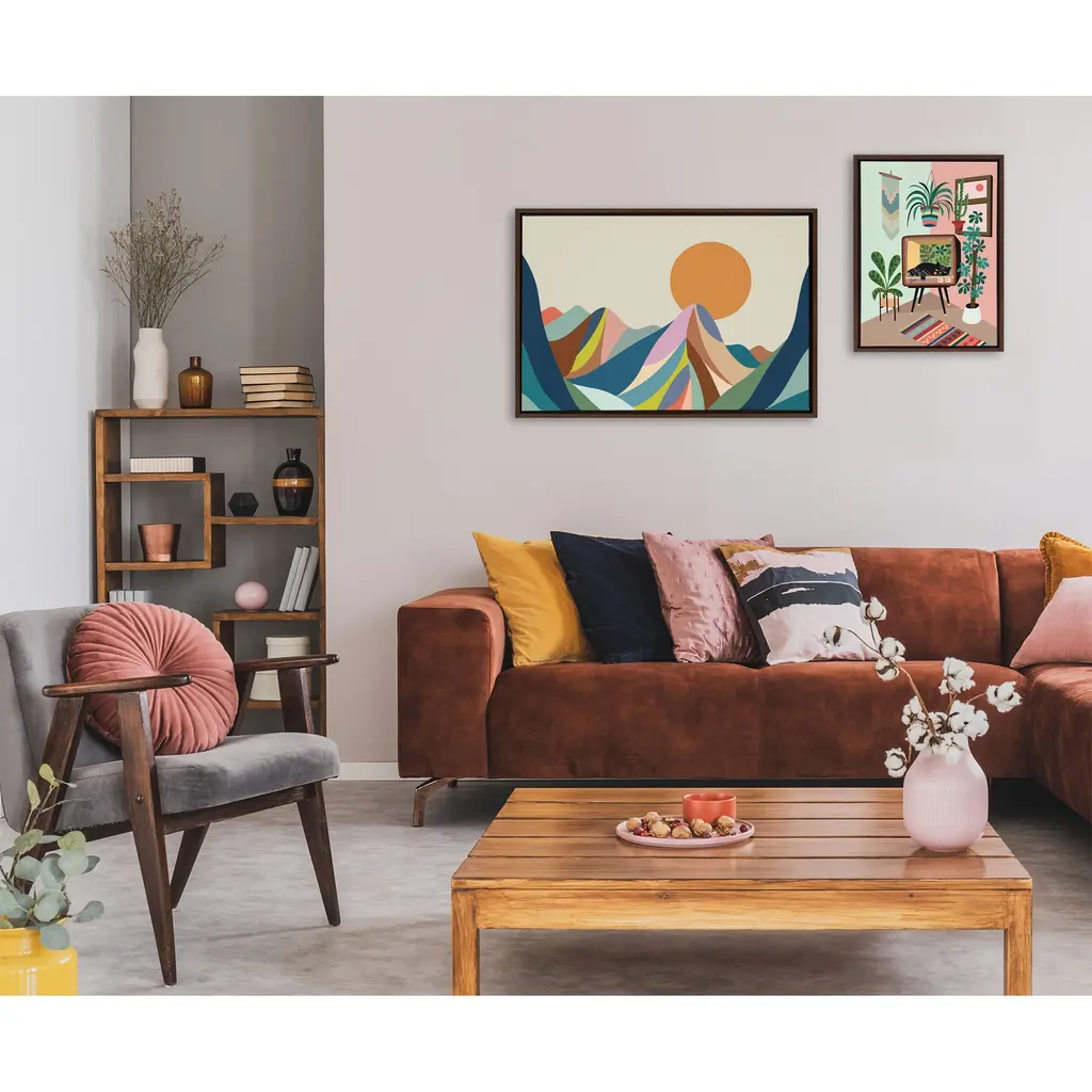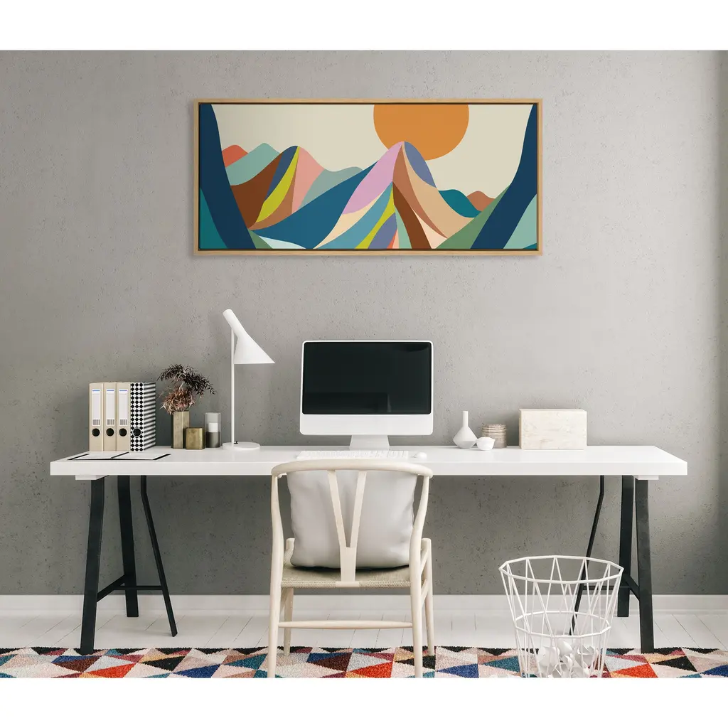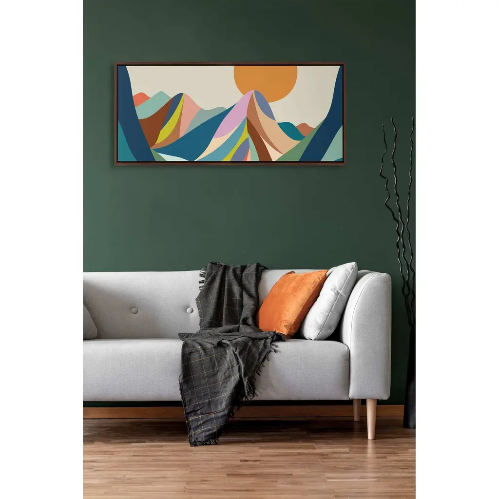 Bring colorful, avant-garde beauty that embraces forms of nature to your home with this vibrant art print. This mid century modern landscape is full of color and the lust for travel. Framed in the USA in Waunakee, Wisconsin, this floating canvas art will be a pleasure to look at every day in your living room, bedroom, nursery, or any room in the home. This art print also makes an excellent gift for birthdays, holidays, or house-warming parties. Printed on gallery-wrapped canvas and framed with a lightweight polystyrene frame, this wall art is easy to display on the wall. The outer dimensions are 23 inches by 33 inches by 1.6 inches. Print Name: "Mountains Crop"