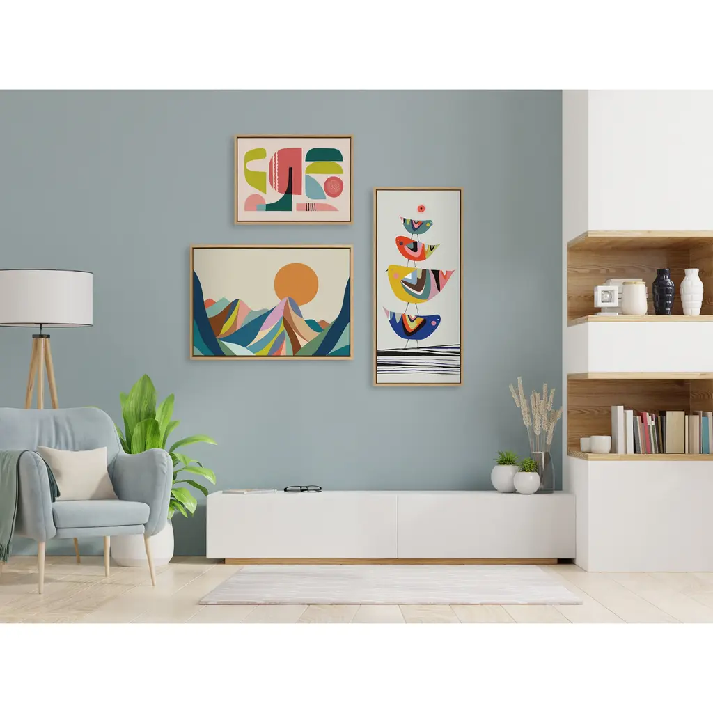 Bring colorful, avant-garde beauty that embraces forms of nature to your home with this vibrant art print. This mid century modern landscape is full of color and the lust for travel. Framed in the USA in Waunakee, Wisconsin, this floating canvas art will be a pleasure to look at every day in your living room, bedroom, nursery, or any room in the home. This art print also makes an excellent gift for birthdays, holidays, or house-warming parties. Printed on gallery-wrapped canvas and framed with a lightweight polystyrene frame, this wall art is easy to display on the wall. The outer dimensions are 23 inches by 33 inches by 1.6 inches. Print Name: "Mountains Crop"