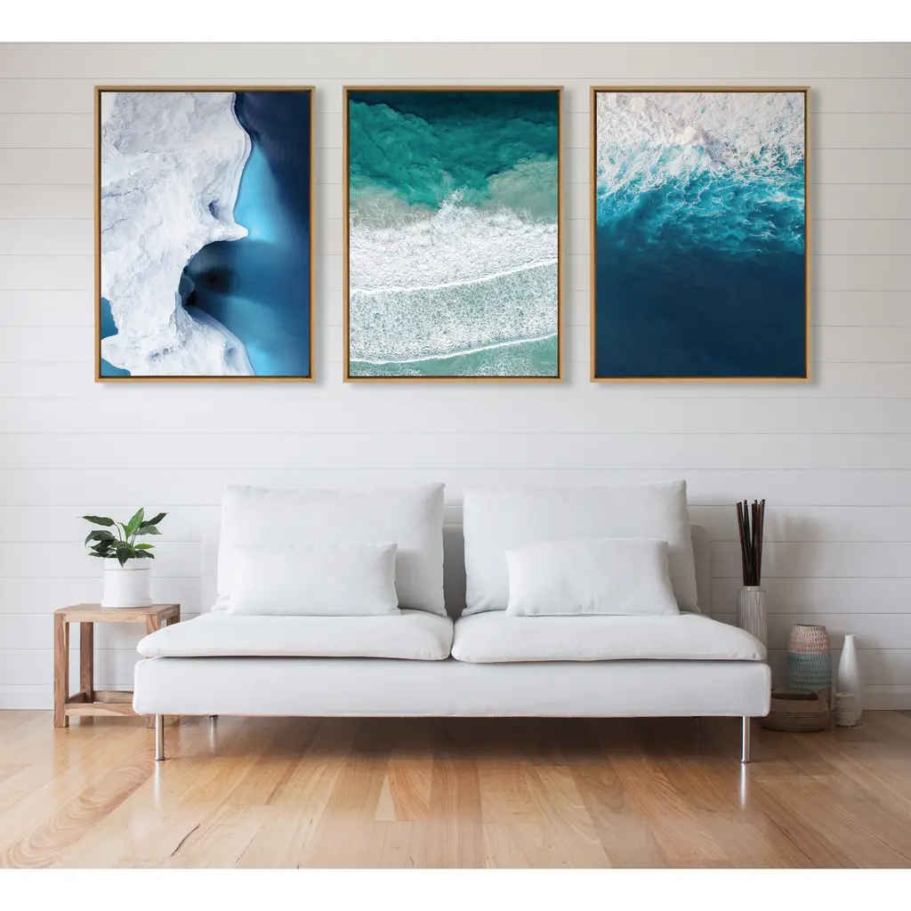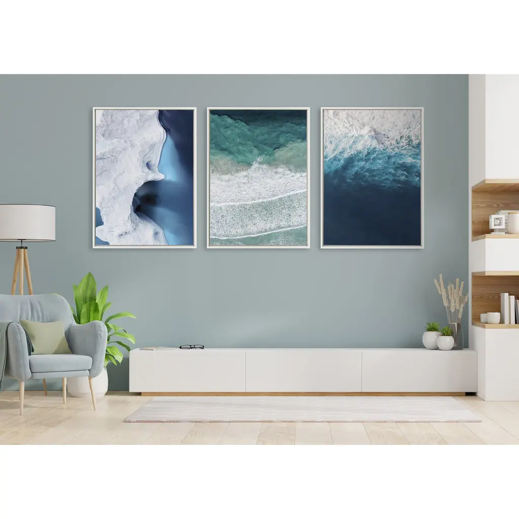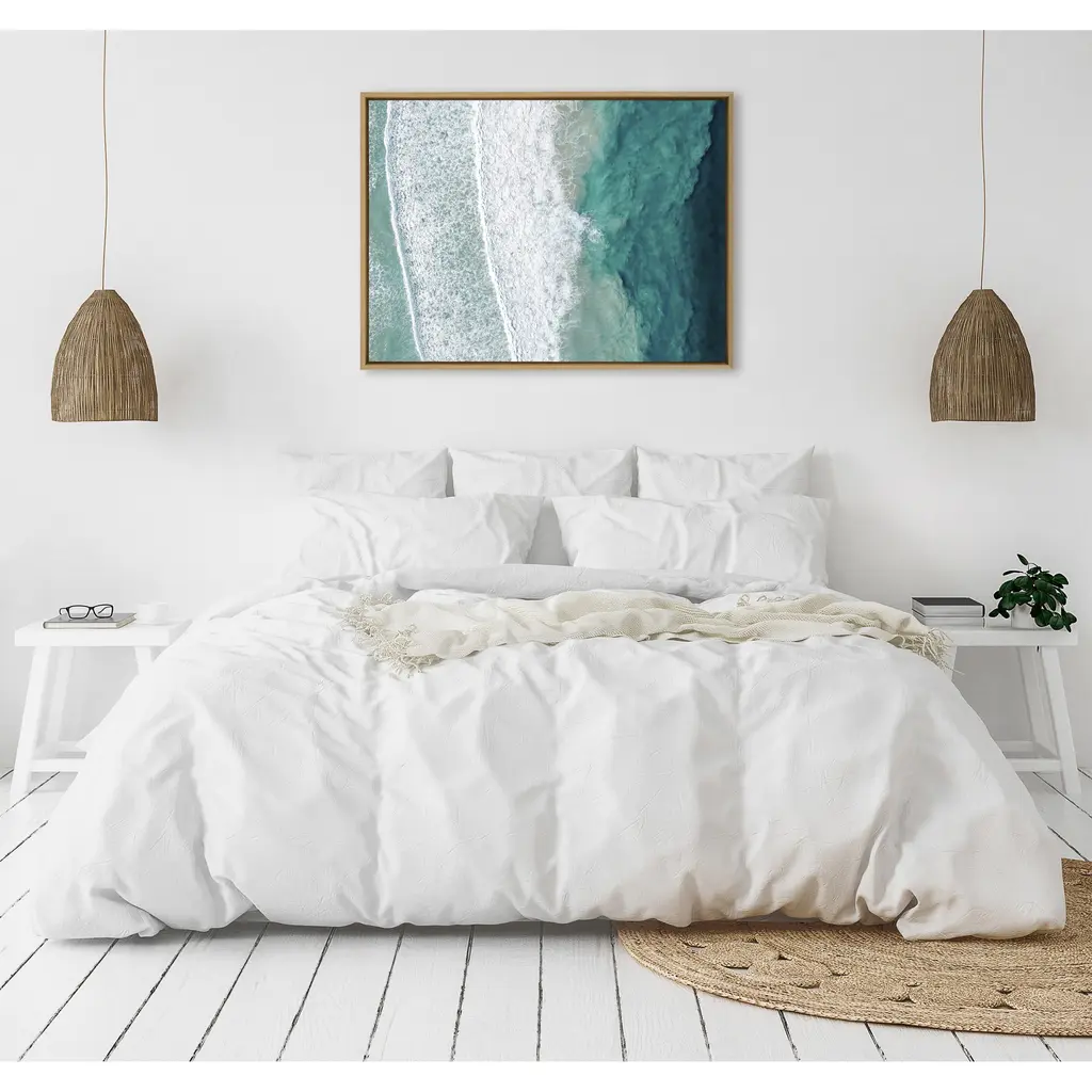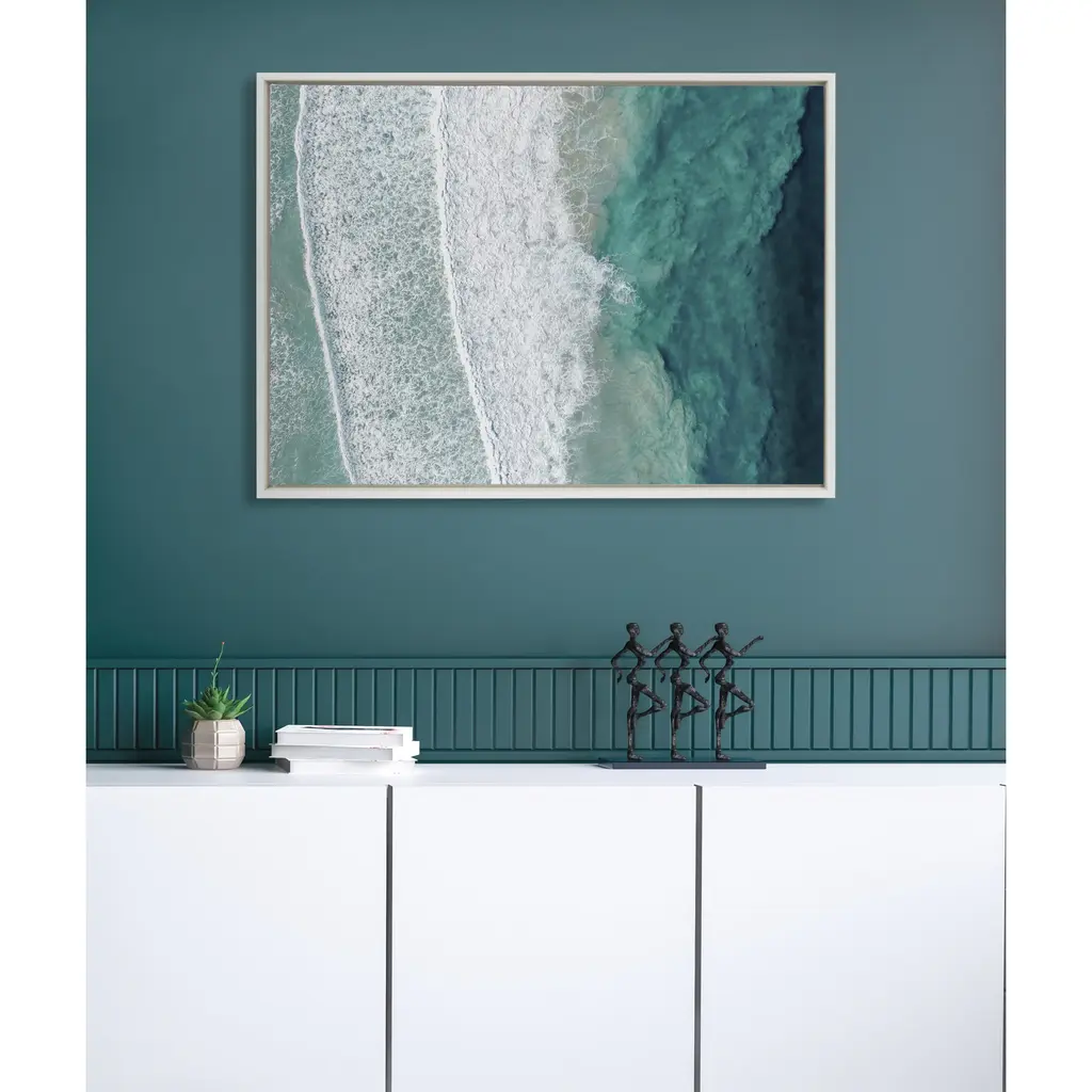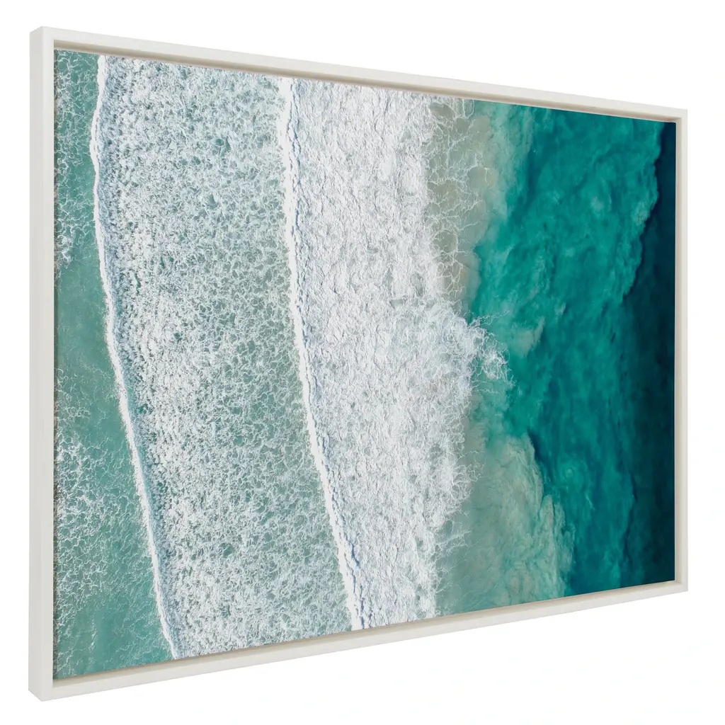 Be transported to the beautiful ocean beach with this oversized coastal photograph. The calming waves and teal blue water bring striking contrast and design without being too busy. Being an oversized art piece, it's designed to wow anyone that walks into the room. Framed in the USA in Waunakee, Wisconsin, this floating canvas art will be a pleasure to look at every day in your living room, bedroom, nursery, or any room in the home. This art print also makes an excellent gift for birthdays, holidays, or house-warming parties. Printed on gallery-wrapped canvas and framed with a lightweight polystyrene frame, this wall art is easy to display on the wall. The outer dimensions are 28 inches by 38 inches by 1.6 inches. Print Name: "Ocean Waves by the Bay"