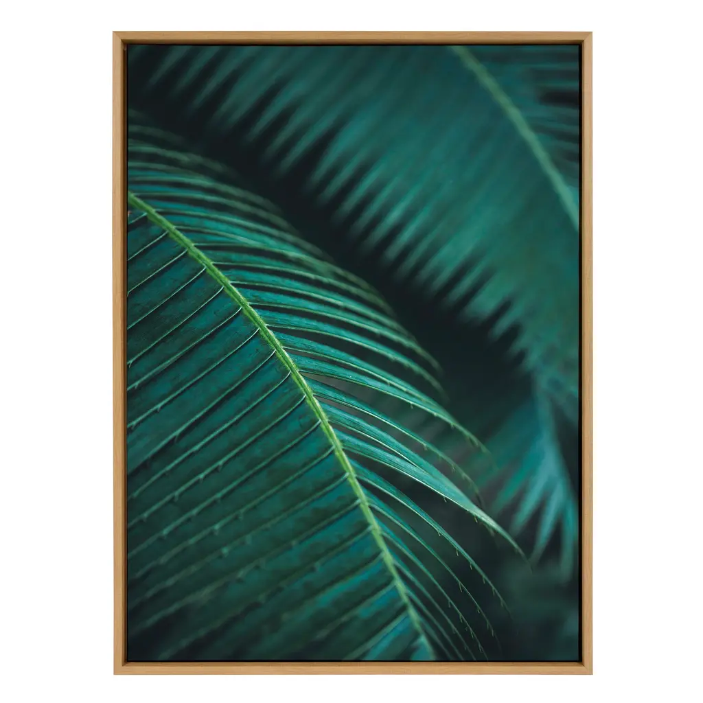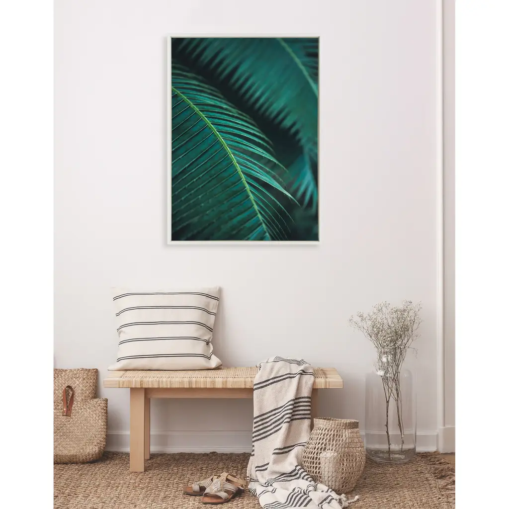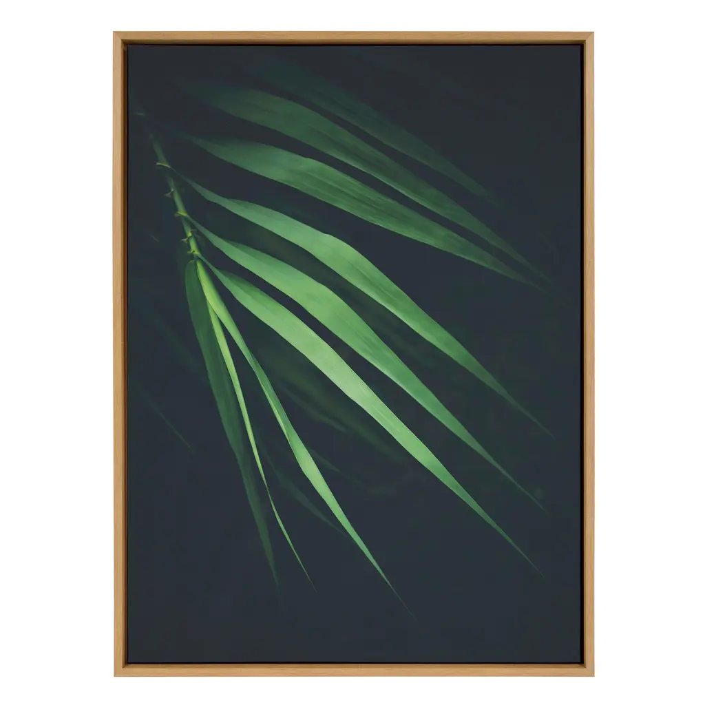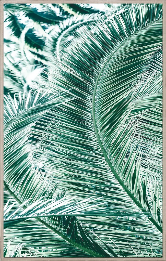 Let this captivating artwork transport you to the beach with its dramatic depiction of a palm frond. It adds intrigue and natural beauty to your wall decor, infusing your space with a sense of coastal charm. Framed in the USA in Waunakee, Wisconsin, this modern floating canvas art is sure to bring joy to your space. Our design team curates art that will fit perfectly in any room of your home. Showcase this art in your living room, bedroom, home office, kitchen, bathroom, nursery, or anywhere you want to bring a little beauty and charm to your walls. Specializing in home décor, we are continually bringing timeless works of art for the traditional decorator as well as trend-forward pieces for that eclectic art lover. Our high-quality framed canvas art also makes excellent gifts for birthdays, holidays, or housewarming parties. Printed on gallery-wrapped canvas and framed with a simple gallery frame this wall art is easy to display on the wall and will match with any décor style. The outer dimensions are 28 inches by 38 inches by 1.6 inches. Print Name: "Palm Frond II"