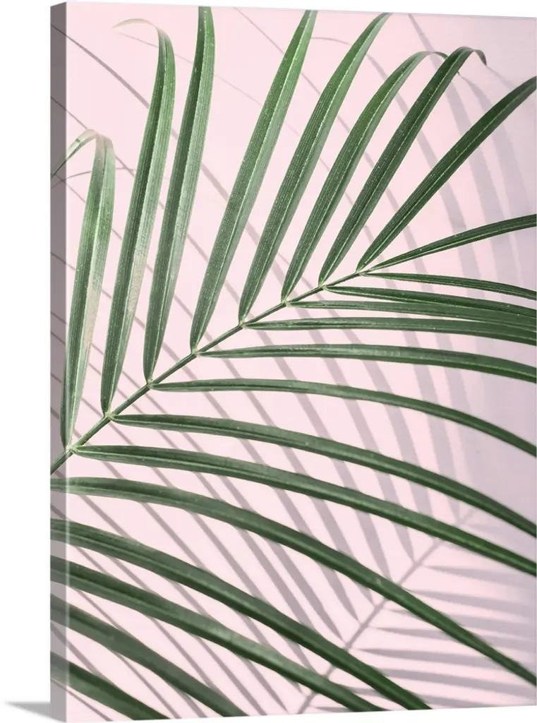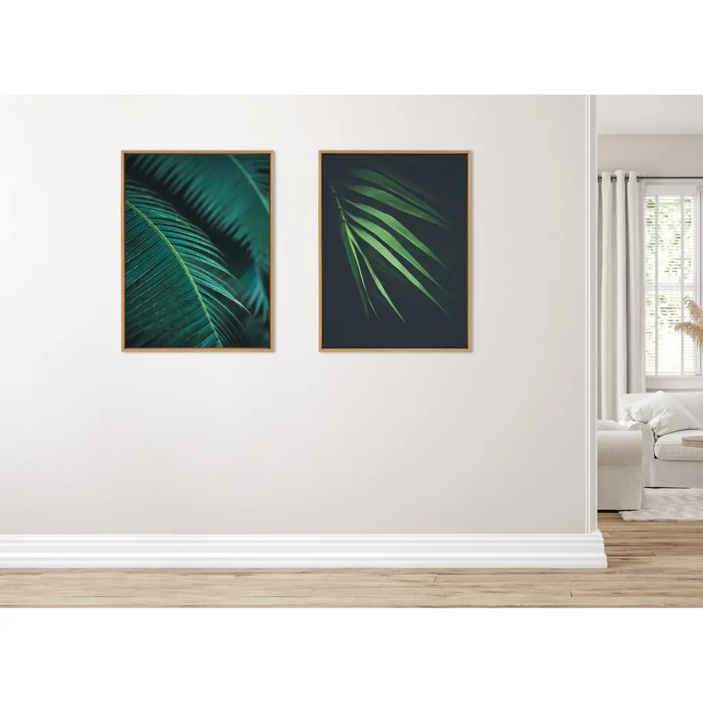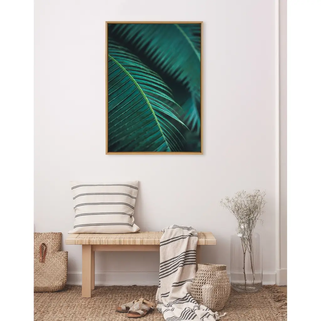 Let this captivating artwork transport you to the beach with its dramatic depiction of a palm frond. It adds intrigue and natural beauty to your wall decor, infusing your space with a sense of coastal charm. Framed in the USA in Waunakee, Wisconsin, this modern floating canvas art is sure to bring joy to your space. Our design team curates art that will fit perfectly in any room of your home. Showcase this art in your living room, bedroom, home office, kitchen, bathroom, nursery, or anywhere you want to bring a little beauty and charm to your walls. Specializing in home décor, we are continually bringing timeless works of art for the traditional decorator as well as trend-forward pieces for that eclectic art lover. Our high-quality framed canvas art also makes excellent gifts for birthdays, holidays, or housewarming parties. Printed on gallery-wrapped canvas and framed with a simple gallery frame this wall art is easy to display on the wall and will match with any décor style. The outer dimensions are 28 inches by 38 inches by 1.6 inches. Print Name: "Palm Frond II"