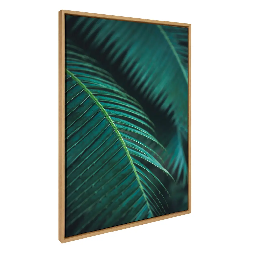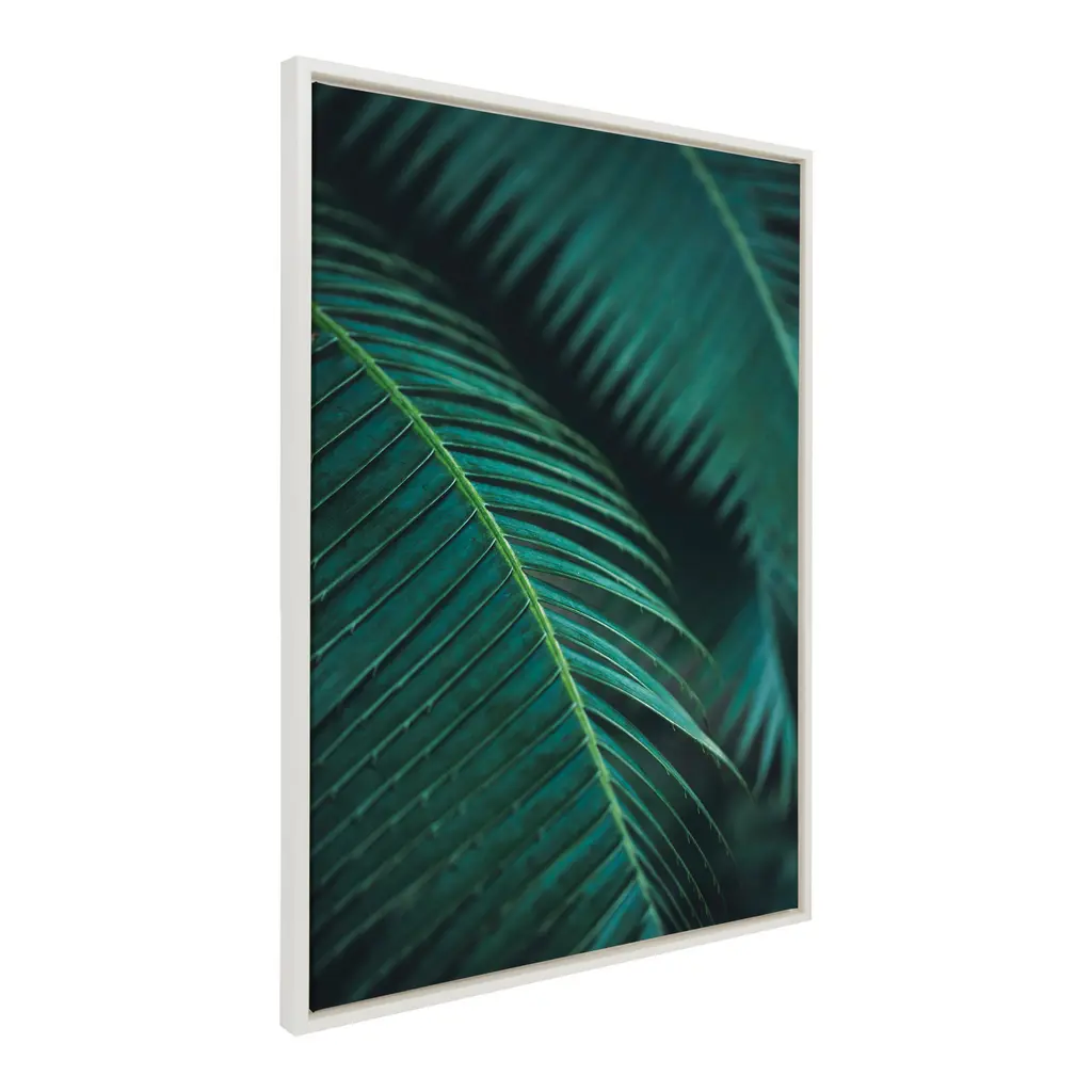 Let this captivating artwork transport you to the beach with its dramatic depiction of a palm frond. It adds intrigue and natural beauty to your wall decor, infusing your space with a sense of coastal charm. Framed in the USA in Waunakee, Wisconsin, this modern floating canvas art is sure to bring joy to your space. Our design team curates art that will fit perfectly in any room of your home. Showcase this art in your living room, bedroom, home office, kitchen, bathroom, nursery, or anywhere you want to bring a little beauty and charm to your walls. Specializing in home décor, we are continually bringing timeless works of art for the traditional decorator as well as trend-forward pieces for that eclectic art lover. Our high-quality framed canvas art also makes excellent gifts for birthdays, holidays, or housewarming parties. Printed on gallery-wrapped canvas and framed with a simple gallery frame this wall art is easy to display on the wall and will match with any décor style. The outer dimensions are 28 inches by 38 inches by 1.6 inches. Print Name: "Palm Frond II"