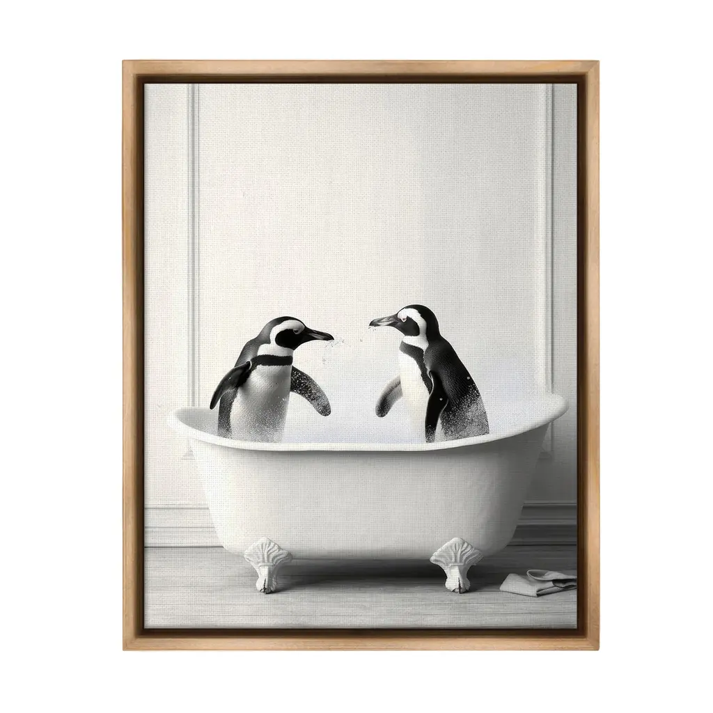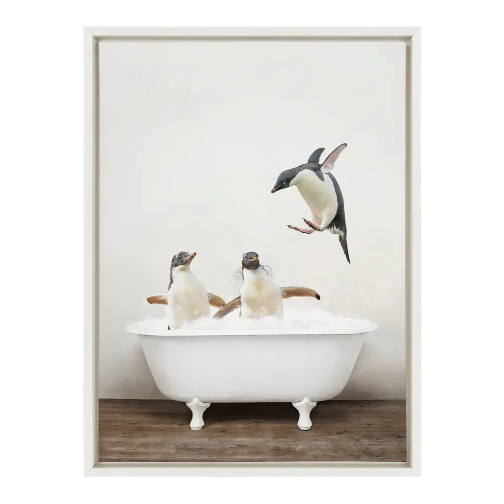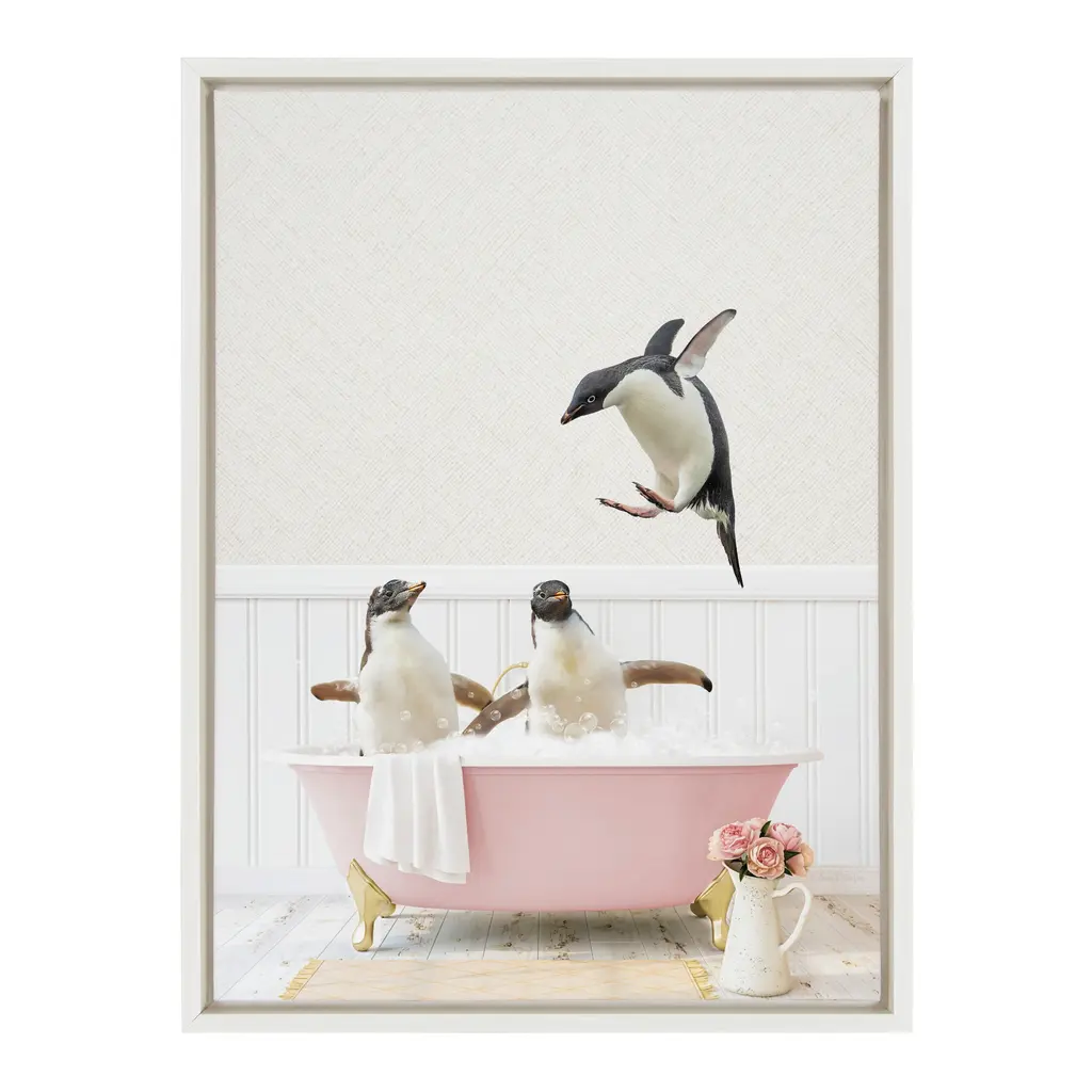 Make a bold impression on your house guests with this whimsical animal art piece by artist Amy Peterson. With its sleek modern frame, this fun, contemporary design is the perfect art piece to add to your home decor collection. Framed in the USA in Waunakee, Wisconsin, this floating canvas art will be a pleasure to look at every day in your living room, bedroom, nursery, or any room in the home. This art print also makes an excellent gift for birthdays, holidays, or house-warming parties. Printed on gallery-wrapped canvas and framed with a lightweight polystyrene frame, this wall art is easy to display on the wall. The outer dimensions are 18 inches by 24 inches by 1.6 inches. Print Name: "Penguins Playing in Cottage Rose Bath"