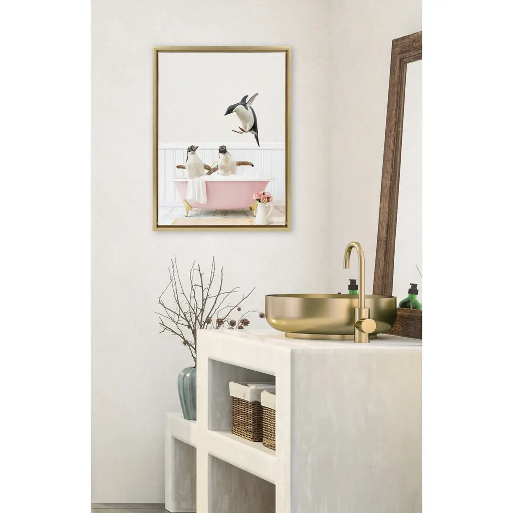 Kate And Laurel Sylvie Penguin Rose Bath Framed Canvas By Amy Peterson - Gold