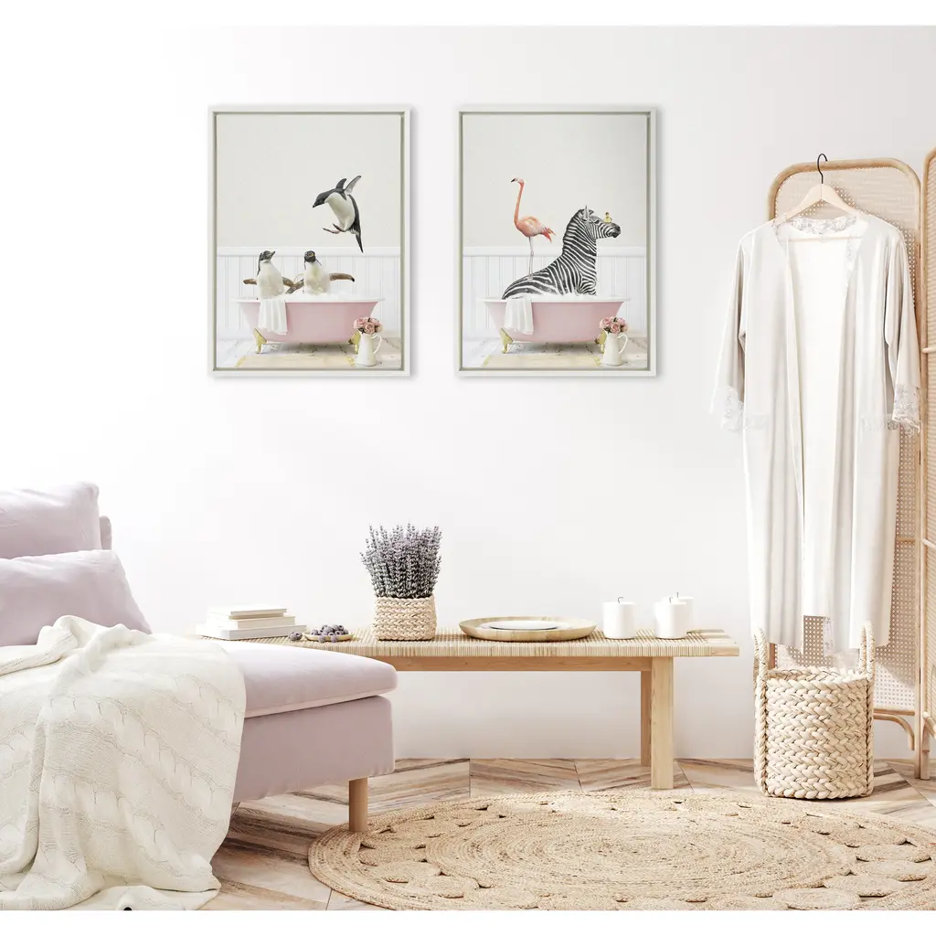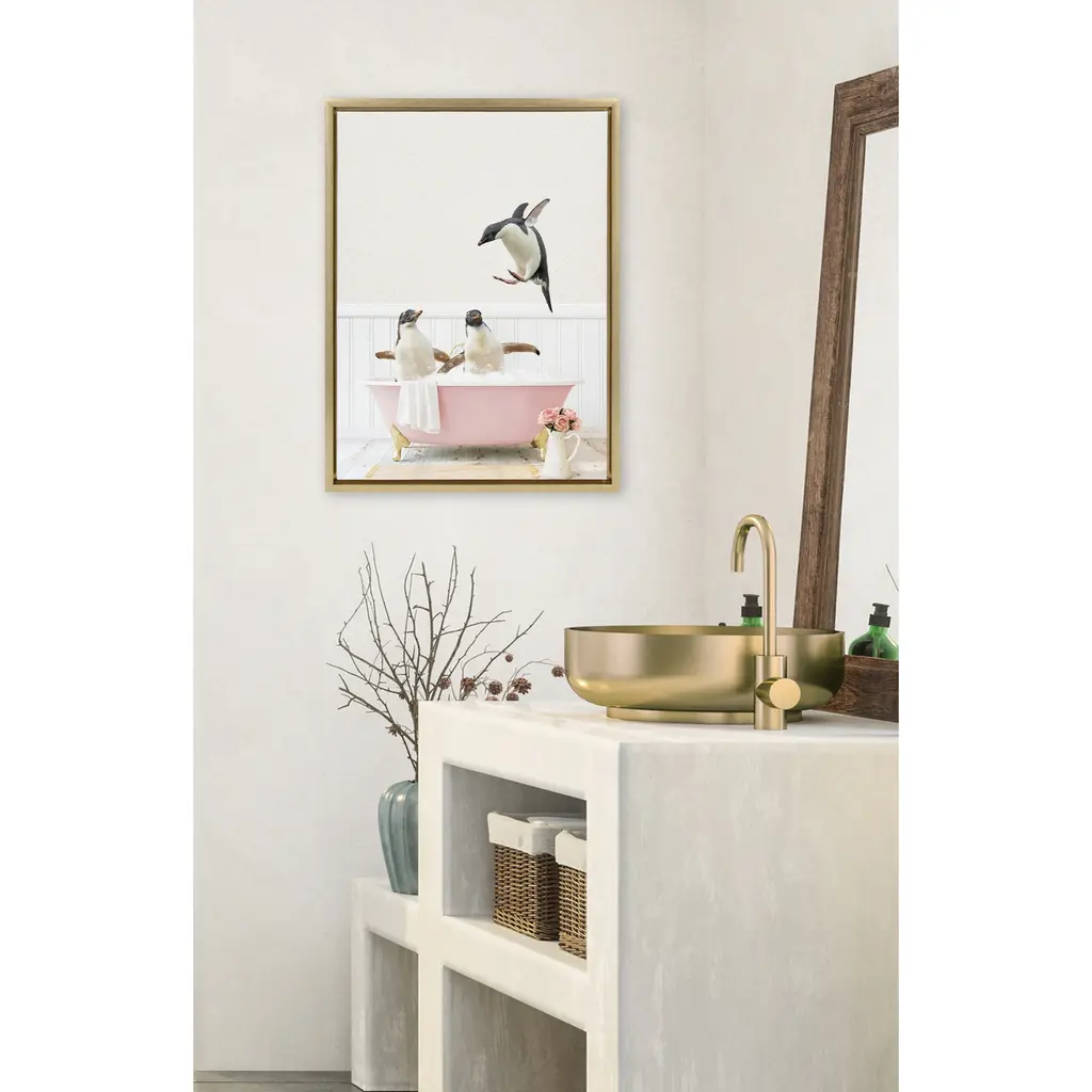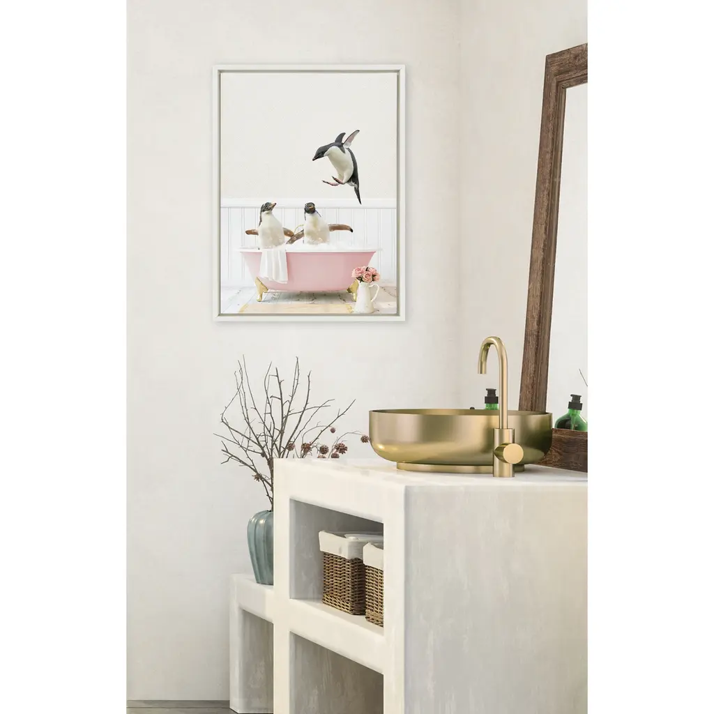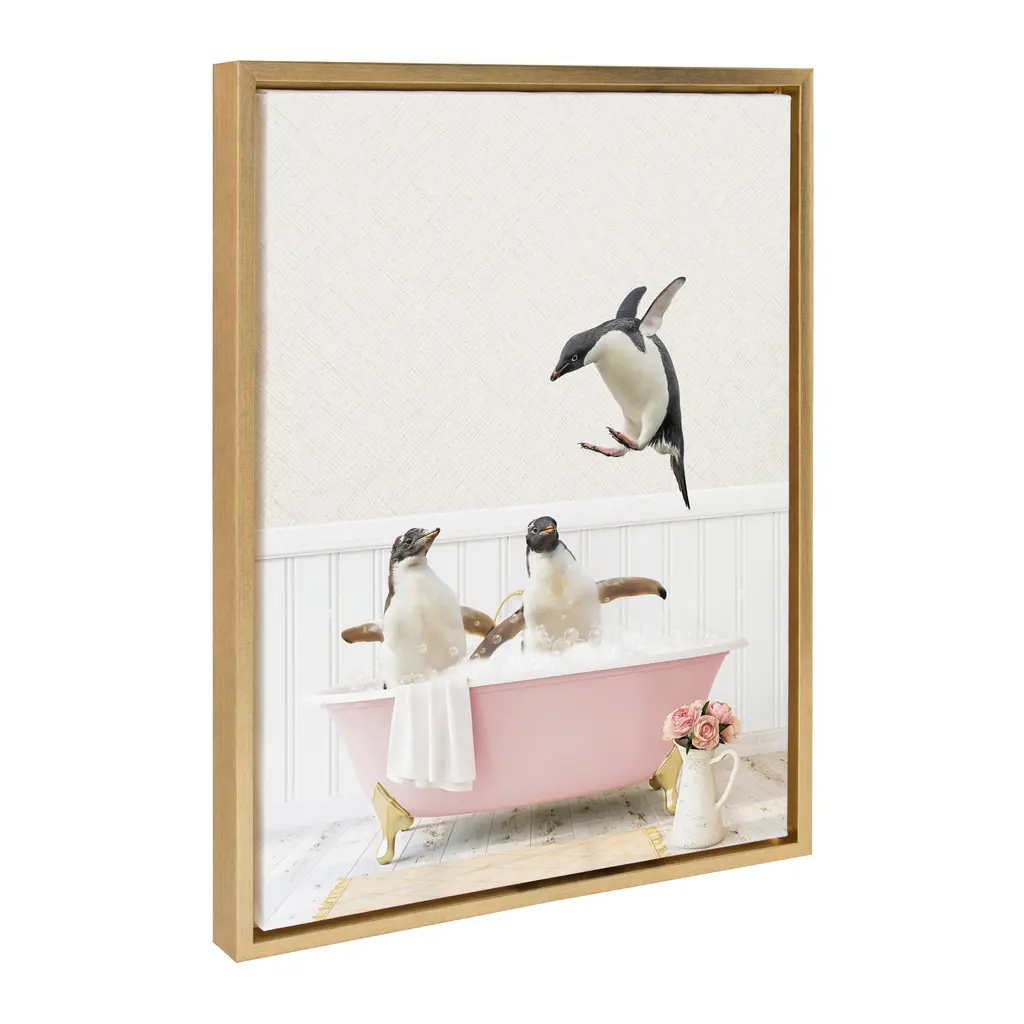 Make a bold impression on your house guests with this whimsical animal art piece by artist Amy Peterson. With its sleek modern frame, this fun, contemporary design is the perfect art piece to add to your home decor collection. Framed in the USA in Waunakee, Wisconsin, this floating canvas art will be a pleasure to look at every day in your living room, bedroom, nursery, or any room in the home. This art print also makes an excellent gift for birthdays, holidays, or house-warming parties. Printed on gallery-wrapped canvas and framed with a lightweight polystyrene frame, this wall art is easy to display on the wall. The outer dimensions are 18 inches by 24 inches by 1.6 inches. Print Name: "Penguins Playing in Cottage Rose Bath"