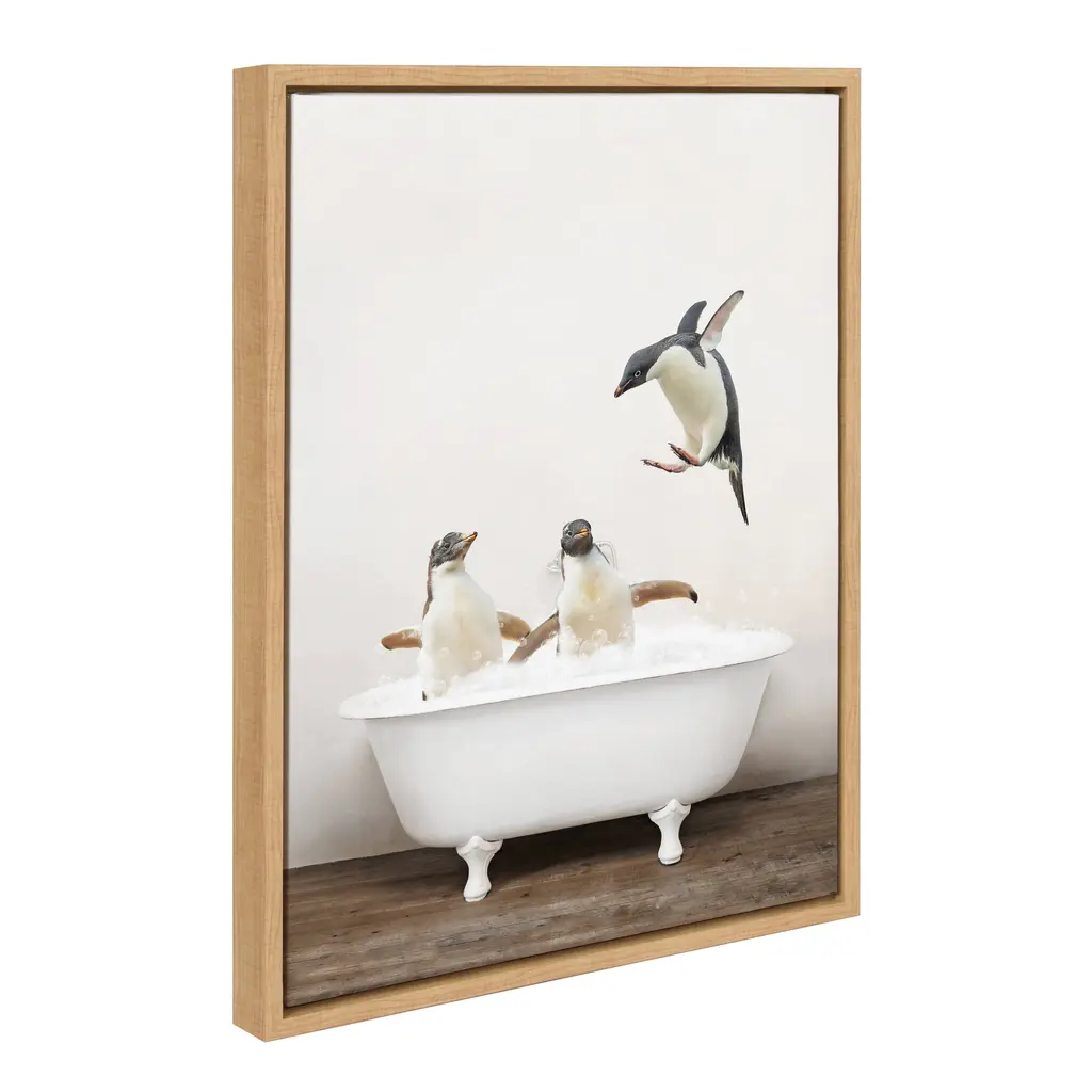 Make a bold impression on your house guests with this whimsical animal art piece by artist Amy Peterson. With its sleek modern frame, this fun, contemporary design is the perfect art piece to add to your home decor collection. Framed in the USA in Waunakee, Wisconsin, this floating canvas art will be a pleasure to look at every day in your living room, bedroom, nursery, or any room in the home. This art print also makes an excellent gift for birthdays, holidays, or house-warming parties. Printed on gallery-wrapped canvas and framed with a lightweight polystyrene frame, this wall art is easy to display on the wall. The outer dimensions are 18 inches by 24 inches by 1.6 inches. Print Name: "Penguins Playing in Rustic Bath"