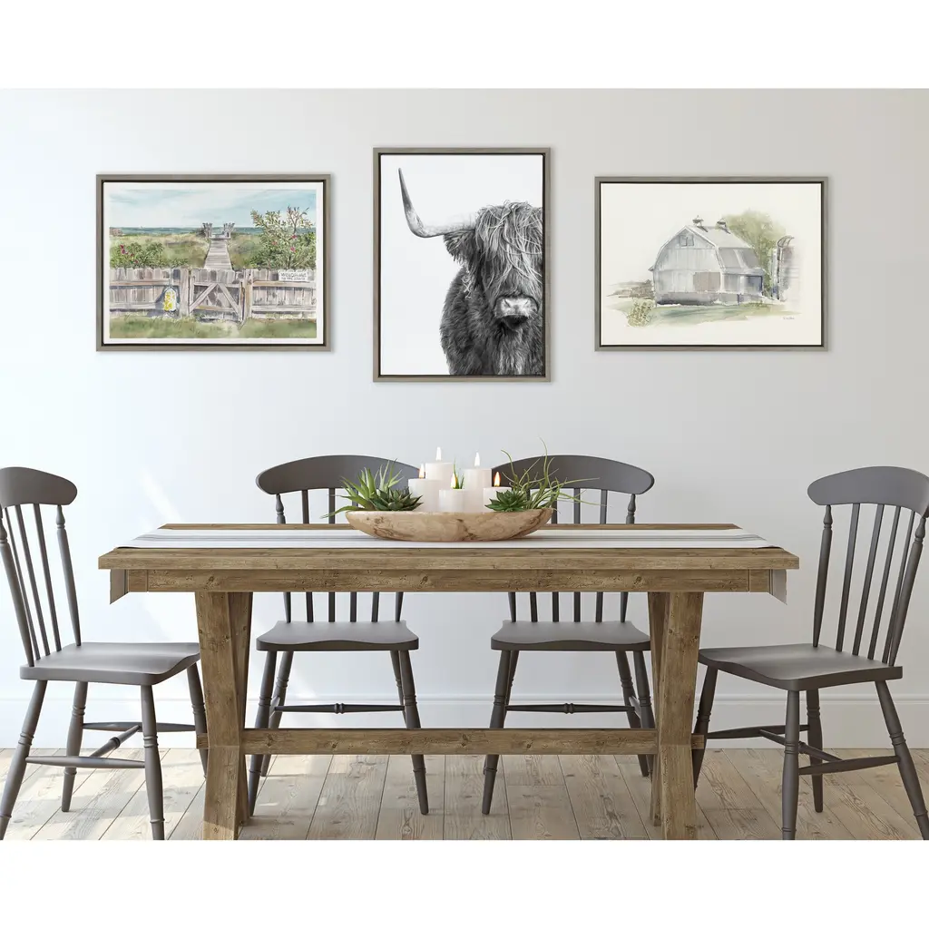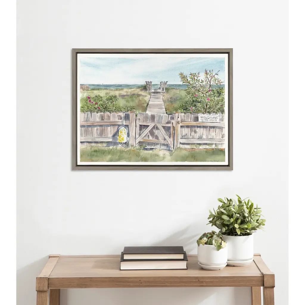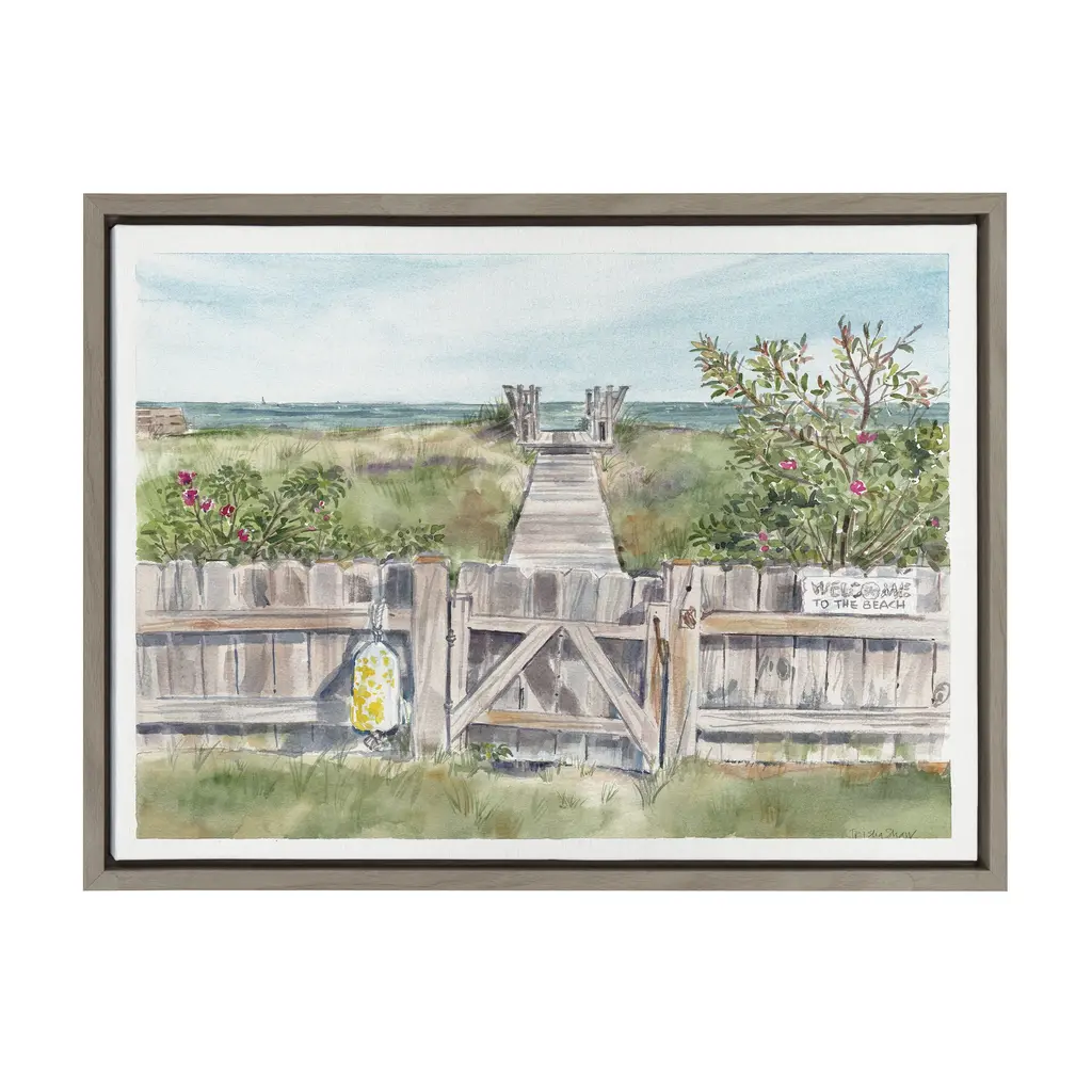 A serene and calming watercolor painting of a beach path leading to the ocean. This wall art is perfect for creating a peaceful atmosphere in your home. Framed in the USA in Waunakee, Wisconsin, this modern floating canvas art is sure to bring joy to your space. Our design team curates art that will fit perfectly in any room of your home. Showcase this art in your living room, bedroom, home office, kitchen, bathroom, nursery, or anywhere you want to bring a little beauty and charm to your walls. Specializing in home décor, we are continually bringing timeless works of art for the traditional decorator as well as trend-forward pieces for that eclectic art lover. Our high-quality framed canvas art also makes excellent gifts for birthdays, holidays, or housewarming parties. Printed on gallery-wrapped canvas and framed with a simple gallery frame this wall art is easy to display on the wall and will match with any décor style. The outer dimensions are 18 inches by 24 inches by 1.6 inches. Print Name: "Pirri Cape Path to Beach"