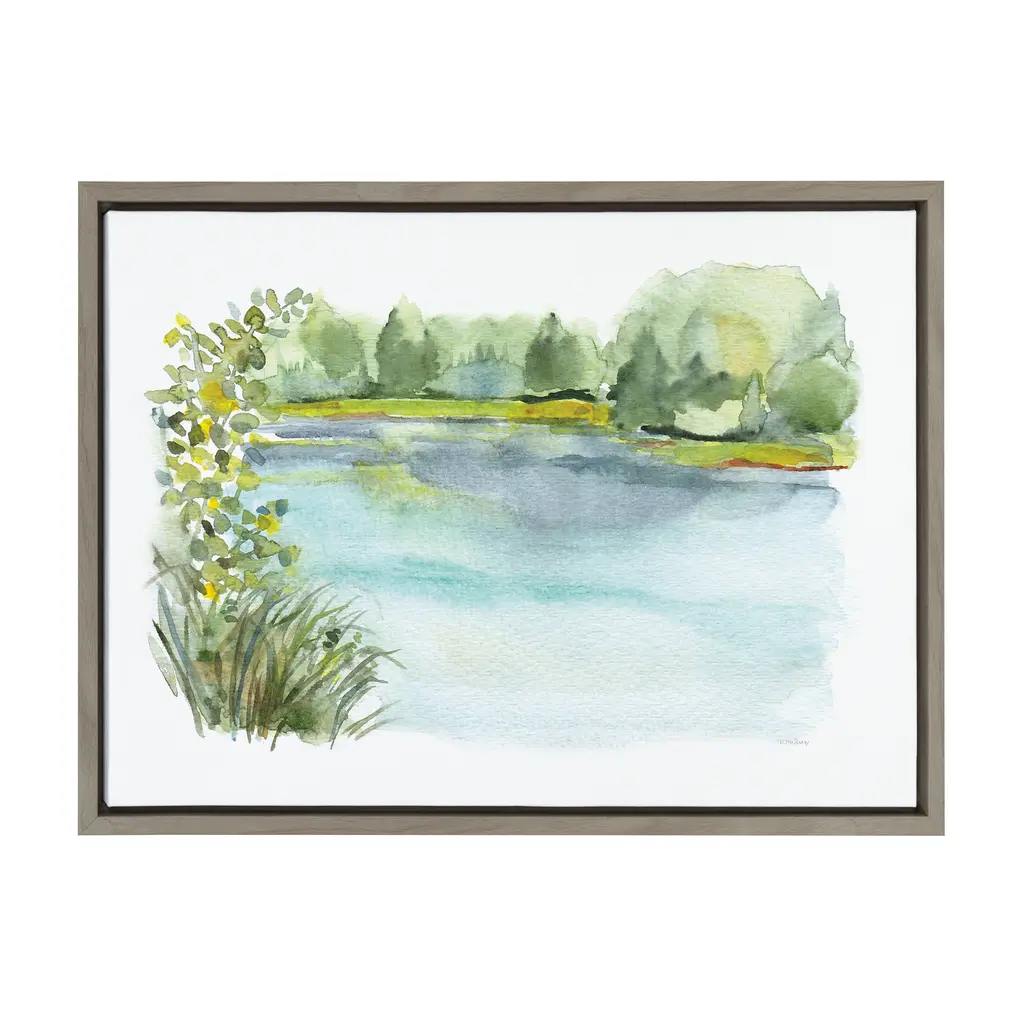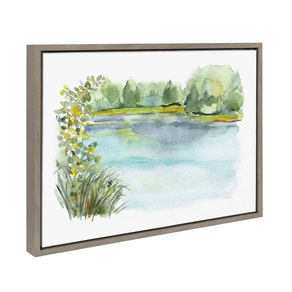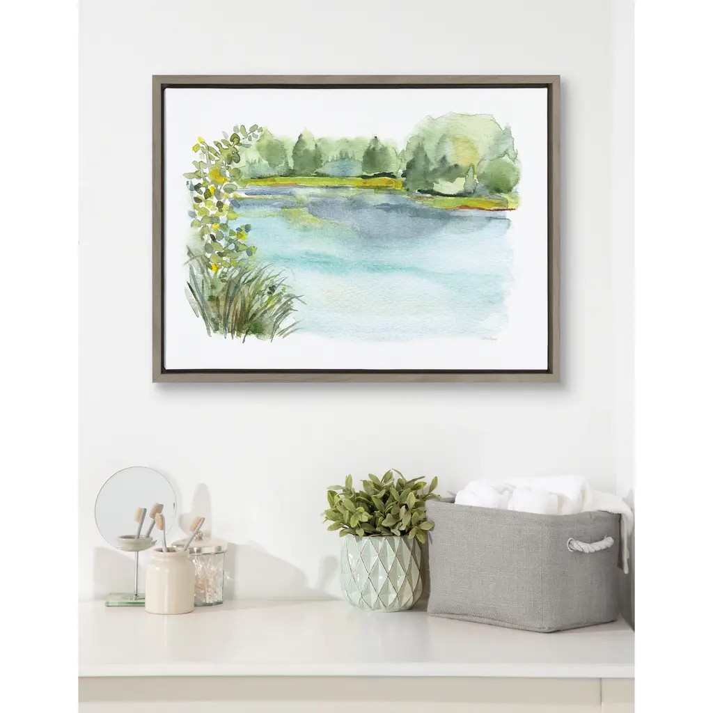Bring the peace and beauty of nature to your home with this charming watercolor landscape. Framed in the USA in Waunakee, Wisconsin, this floating canvas art will be a pleasure to look at every day in your living room, bedroom, office, or any room in the home. This art print also makes an excellent gift for birthdays, holidays, or house-warming parties. Printed on gallery-wrapped canvas and framed with a lightweight polystyrene frame, this wall art has two hangers already attached to the MDF back for easy wall display. The outer dimensions are 24 inches by 18 inches by 1.6 inches. Print Name: "Pond Landscape"