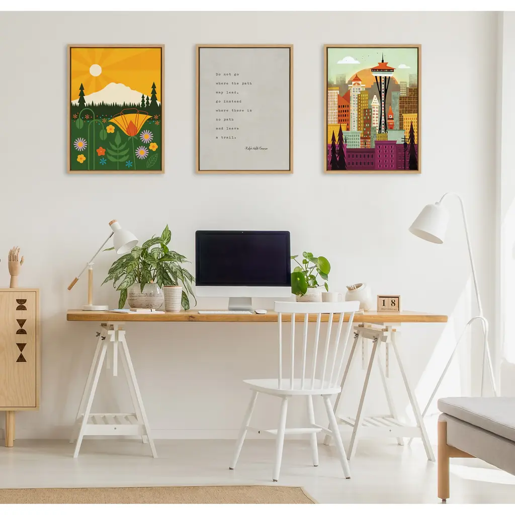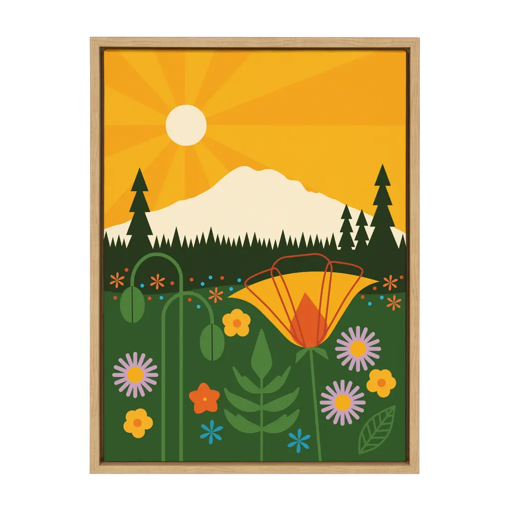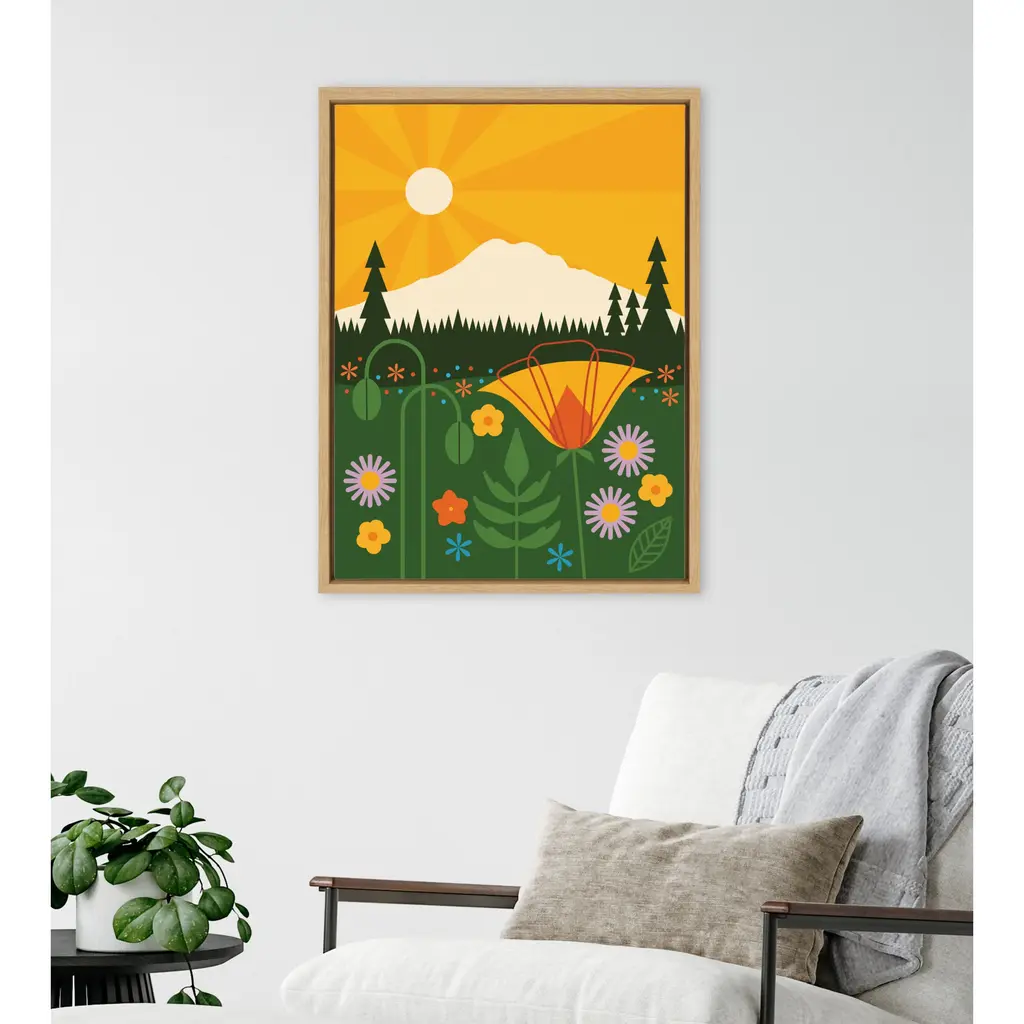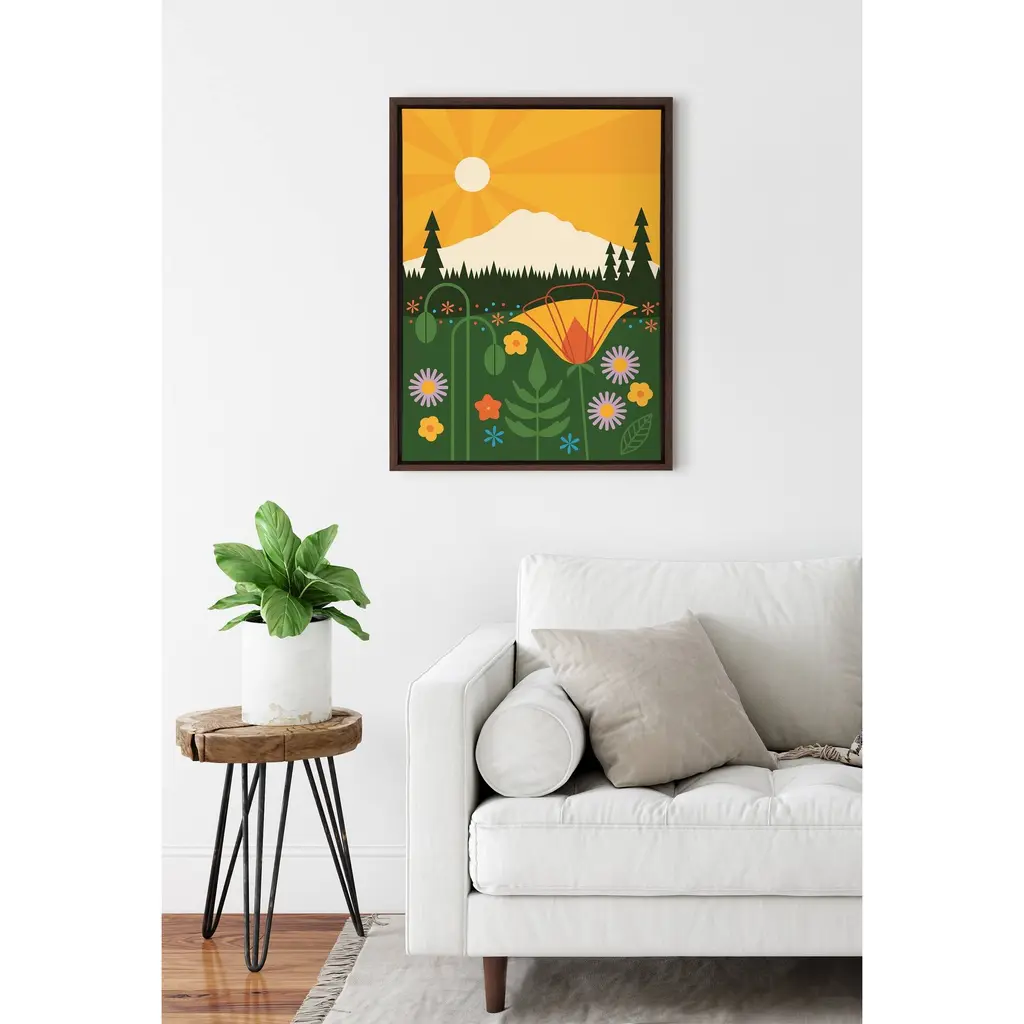 Decorate your home with a colorful mid century inspired landscape in a jungalow style with this beautiful art print by Amber Leaders Designs. Framed in the USA in Waunakee, Wisconsin, this floating canvas art will be a pleasure to look at every day in your living room, bedroom, dining room, or any room in the home that needs some color. Printed on gallery-wrapped canvas and framed with a lightweight polystyrene frame, this wall art has two hangers already attached to the MDF back for easy wall display. The outer dimensions are 24 inches tall by 18 inches wide by 1.63 inches deep. Print Name: "Mt Rainier"