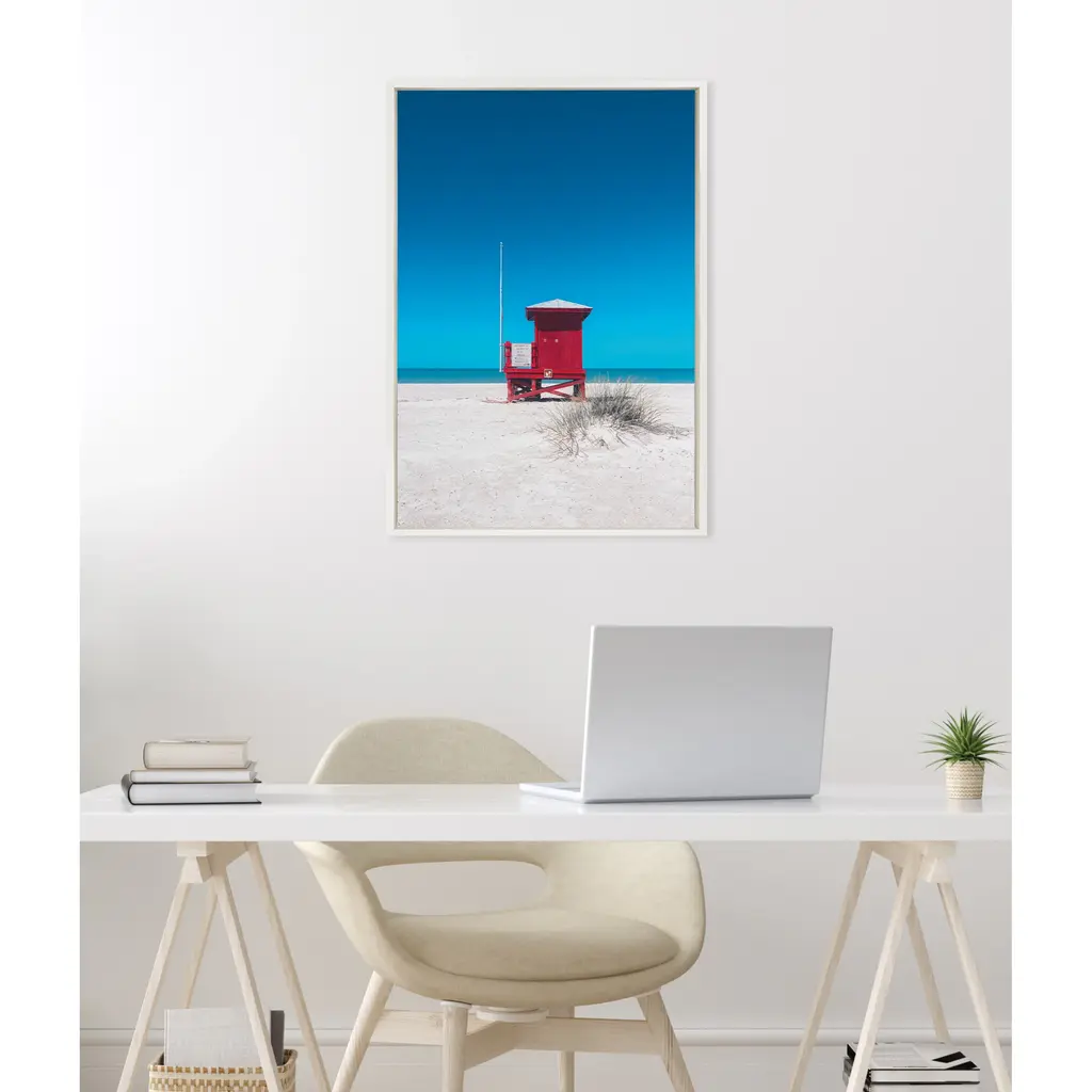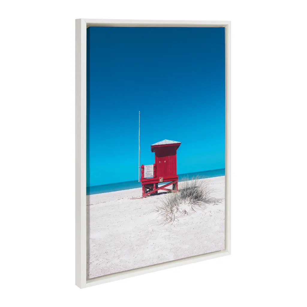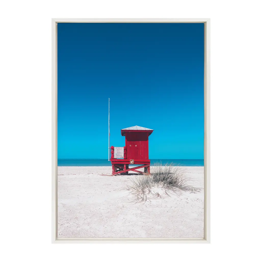 Add a pop of color to your home with this beautiful and scenic wall art featuring a red lifeguard tower on the beach. This serves as a perfect wall accent for any beach or coastal home. Framed in the USA in Waunakee, Wisconsin, this modern floating canvas art is sure to bring joy to your space. Our design team curates art that will fit perfectly in any room of your home. Showcase this art in your living room, bedroom, home office, kitchen, bathroom, nursery, or anywhere you want to bring a little beauty and charm to your walls. Specializing in home décor, we are continually bringing timeless works of art for the traditional decorator as well as trend-forward pieces for that eclectic art lover. Our high-quality framed canvas art also makes excellent gifts for birthdays, holidays, or housewarming parties. Printed on gallery-wrapped canvas and framed with a simple gallery frame this wall art is easy to display on the wall and will match with any décor style. The outer dimensions are 23 inches by 33 inches by 1.6 inches. Print Name: "Red Lifeguard Tower Sand Key Beach"