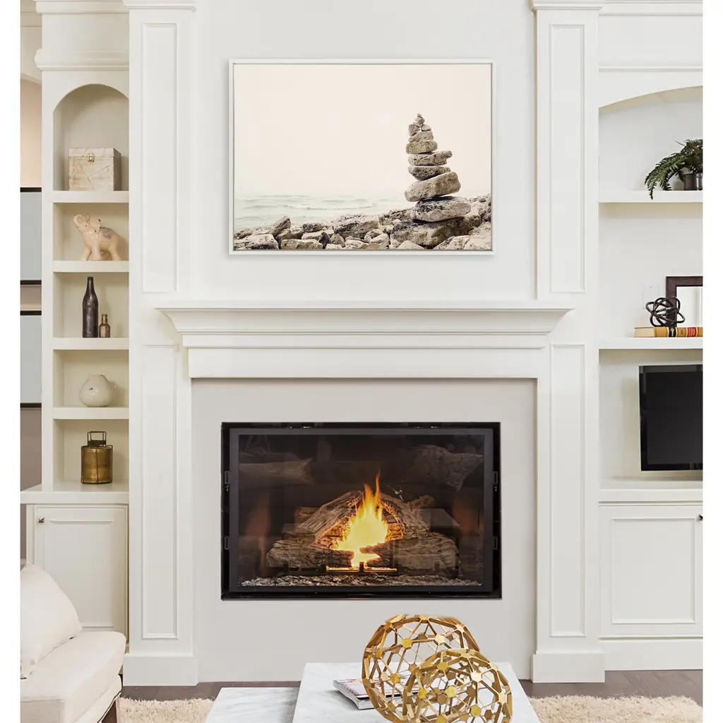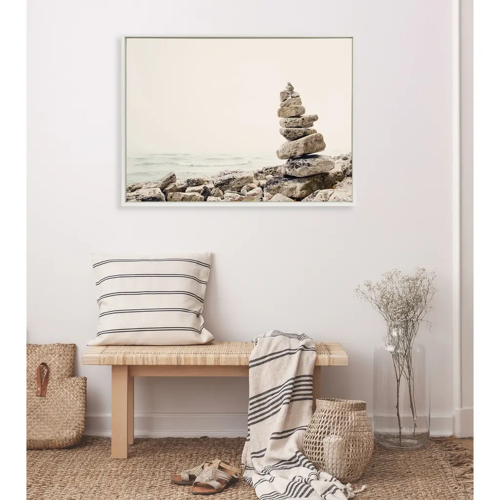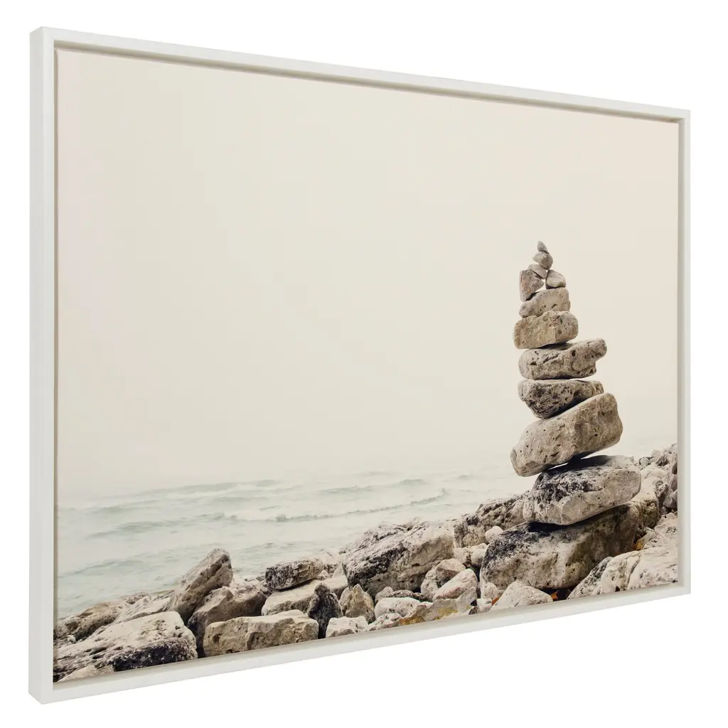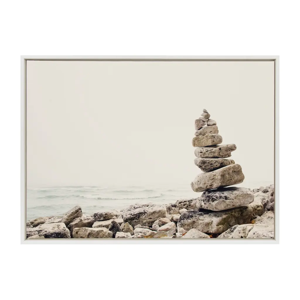Immerse yourself in the serenity of coastal beauty with this artwork featuring stacked ocean rocks. It creates a calming atmosphere and adds a touch of natural tranquility to your wall decor. Framed in the USA in Waunakee, Wisconsin, this modern floating canvas art is sure to bring joy to your space. Our design team curates art that will fit perfectly in any room of your home. Showcase this art in your living room, bedroom, home office, kitchen, bathroom, nursery, or anywhere you want to bring a little beauty and charm to your walls. Specializing in home décor, we are continually bringing timeless works of art for the traditional decorator as well as trend-forward pieces for that eclectic art lover. Our high-quality framed canvas art also makes excellent gifts for birthdays, holidays, or housewarming parties. Printed on gallery-wrapped canvas and framed with a simple gallery frame this wall art is easy to display on the wall and will match with any décor style. The outer dimensions are 28 inches by 38 inches by 1.6 inches. Print Name: "Return"
