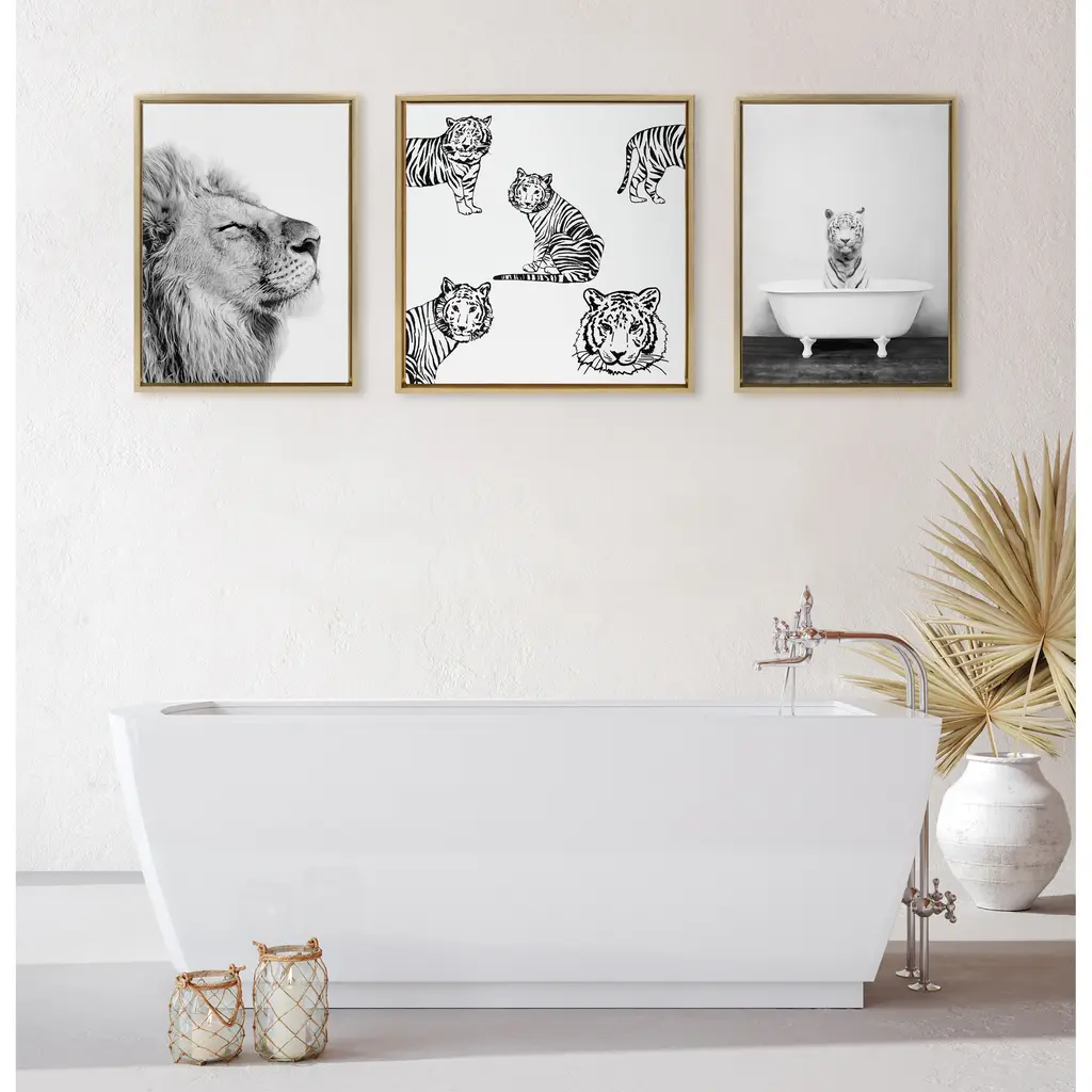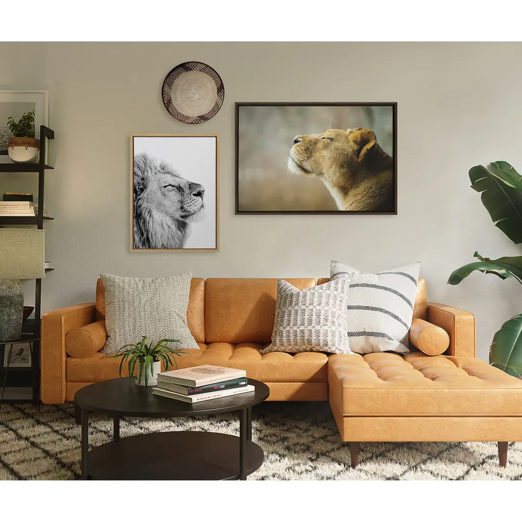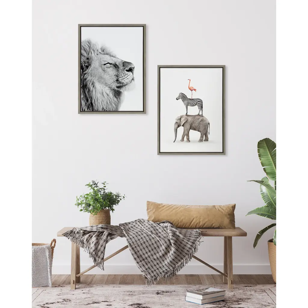 Create an inspirational focal point in your living room with this 'Self Actualizing Lion' wall art by Amy Peterson from Kate and Laurel. Printed on high-grade canvas and framed with grey woodgrain polystyrene, this artwork is durable and accentuates contemporary decor. With two sawtooth hangers on the back, this art comes conveniently ready to hang.