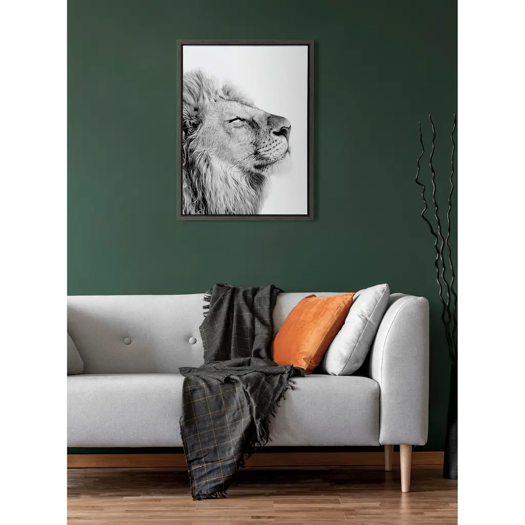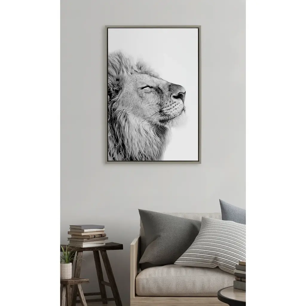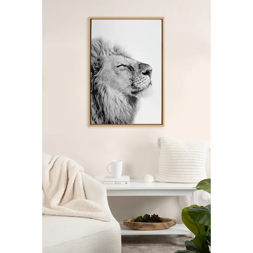 Create an inspirational focal point in your living room with this 'Self Actualizing Lion' wall art by Amy Peterson from Kate and Laurel. Printed on high-grade canvas and framed with grey woodgrain polystyrene, this artwork is durable and accentuates contemporary decor. With two sawtooth hangers on the back, this art comes conveniently ready to hang.