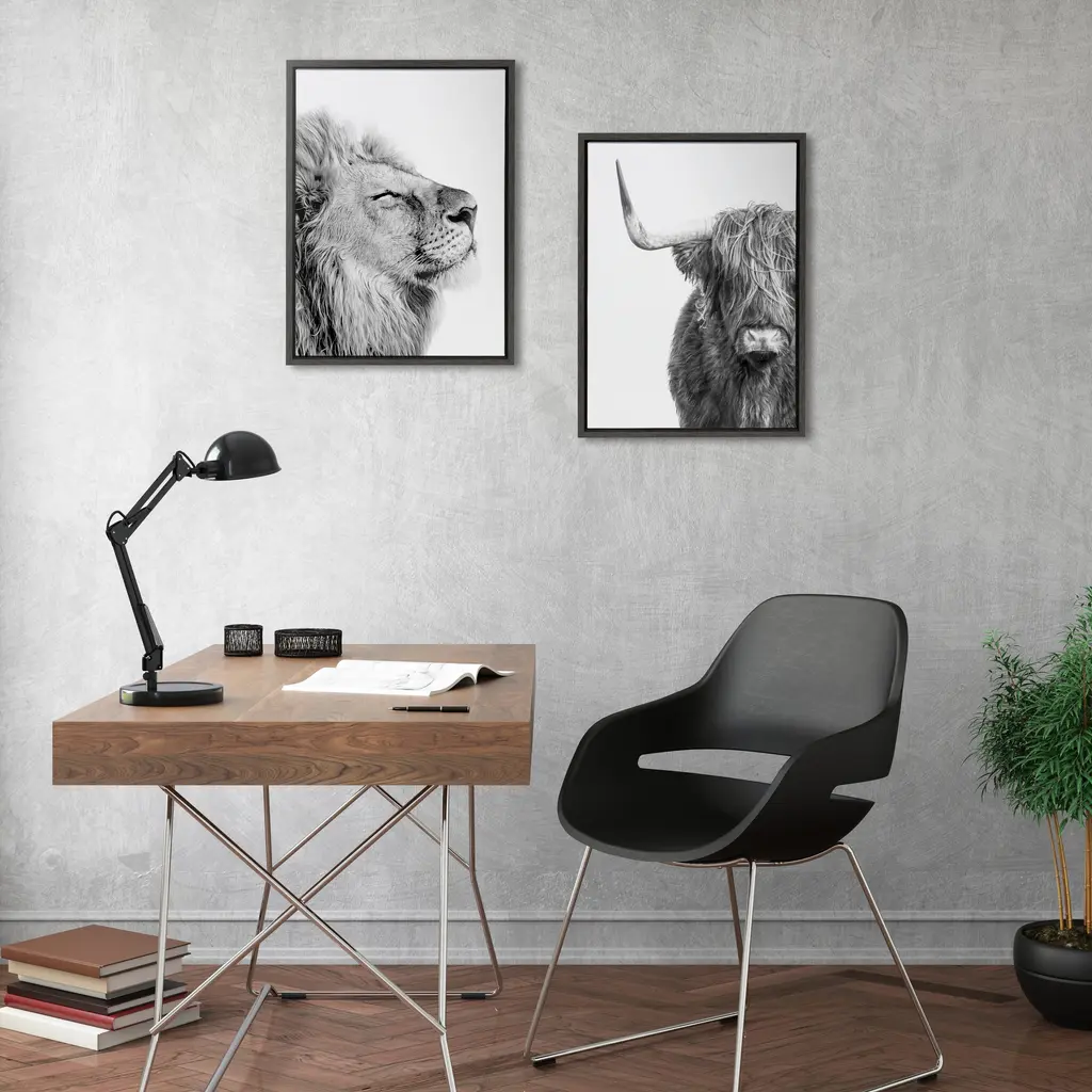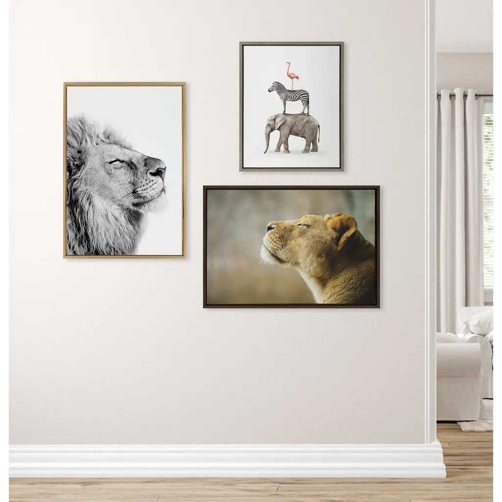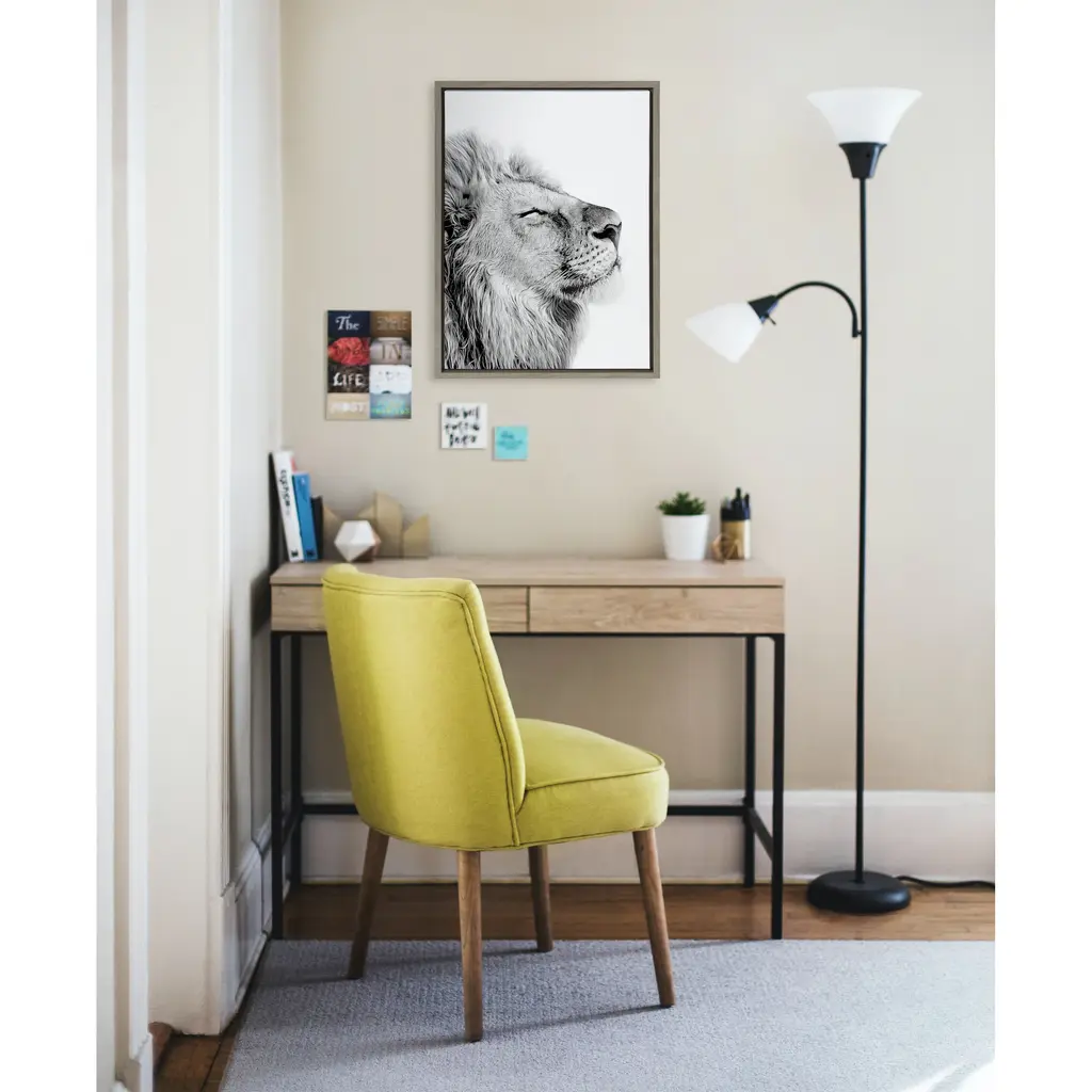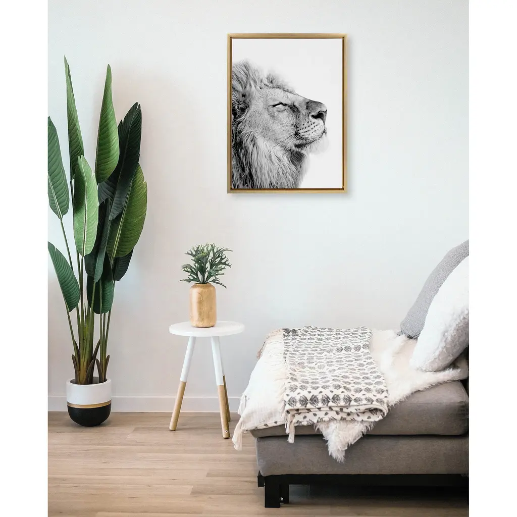 Create an inspirational focal point in your living room with this 'Self Actualizing Lion' wall art by Amy Peterson from Kate and Laurel. Printed on high-grade canvas and framed with grey woodgrain polystyrene, this artwork is durable and accentuates contemporary decor. With two sawtooth hangers on the back, this art comes conveniently ready to hang.