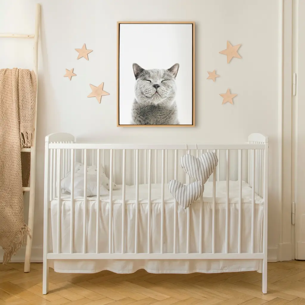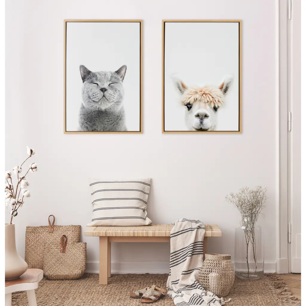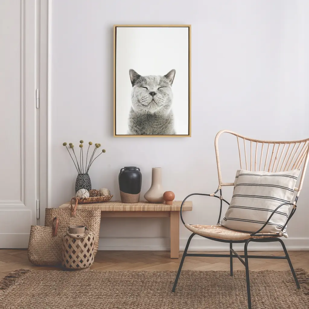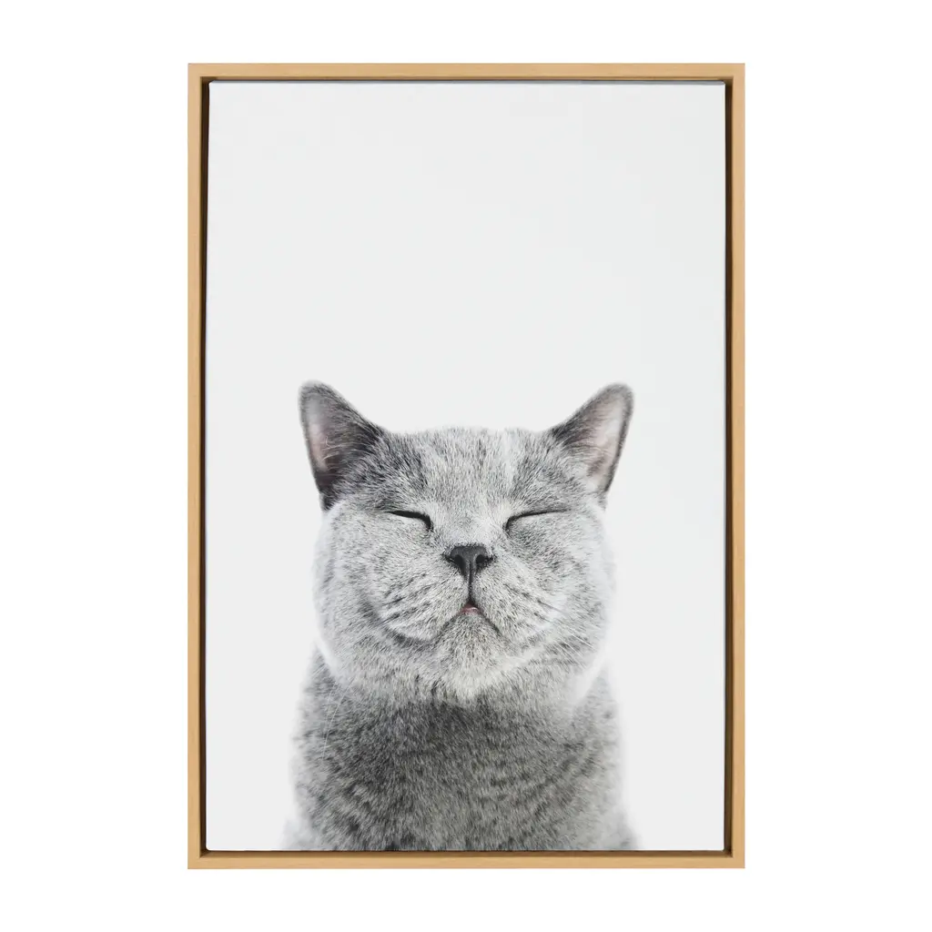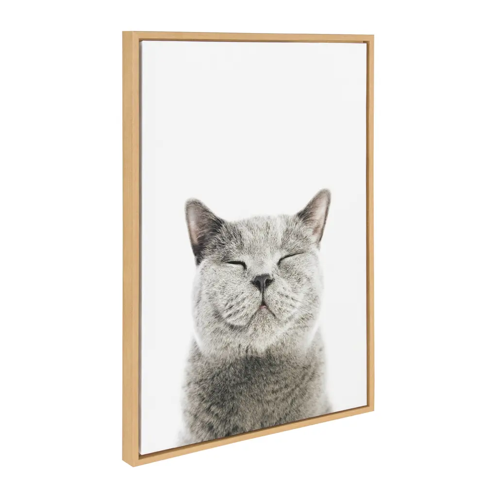 Calling all cat lovers! Add this smiling kitty to your home for a whimsical (and totally adorable) piece of wall decor. Printed and framed in the USA in Waunakee, Wisconsin, this framed floating canvas art will be a pleasure to look at every day in your living room, bedroom, nursery, or any room in the home. Printed on gallery-wrapped canvas and framed with a gray woodgrain high-quality polystyrene frame, this animal wall art has two sawtooth hangers already attached to the inset back for easy wall display. The outer dimensions are 24 inches tall by 18 inches wide by 1.6 inches deep. Print name: "Smiling Cat" by Amy Peterson. About the artist: Amy Peterson started working on her craft at an early age and continues to sharpen her skills as a production artist in many of San Francisco's technical creative agencies. Creating colorful and uplifting art is the key to Amy's "Happy Place." Her favorite pieces come together with the helping hands of a good cup of coffee and some great music. Nothing ignites her passion like creating work that brings joy and good vibes into the world!