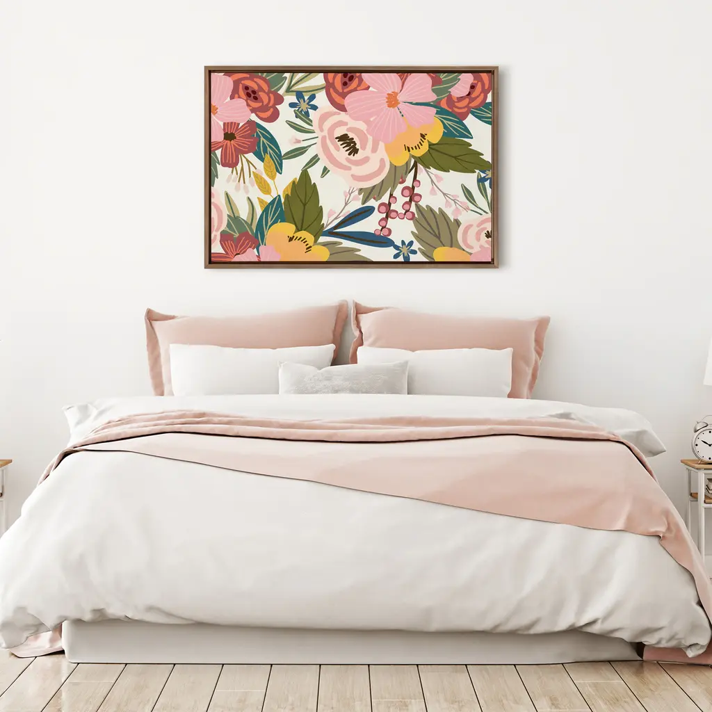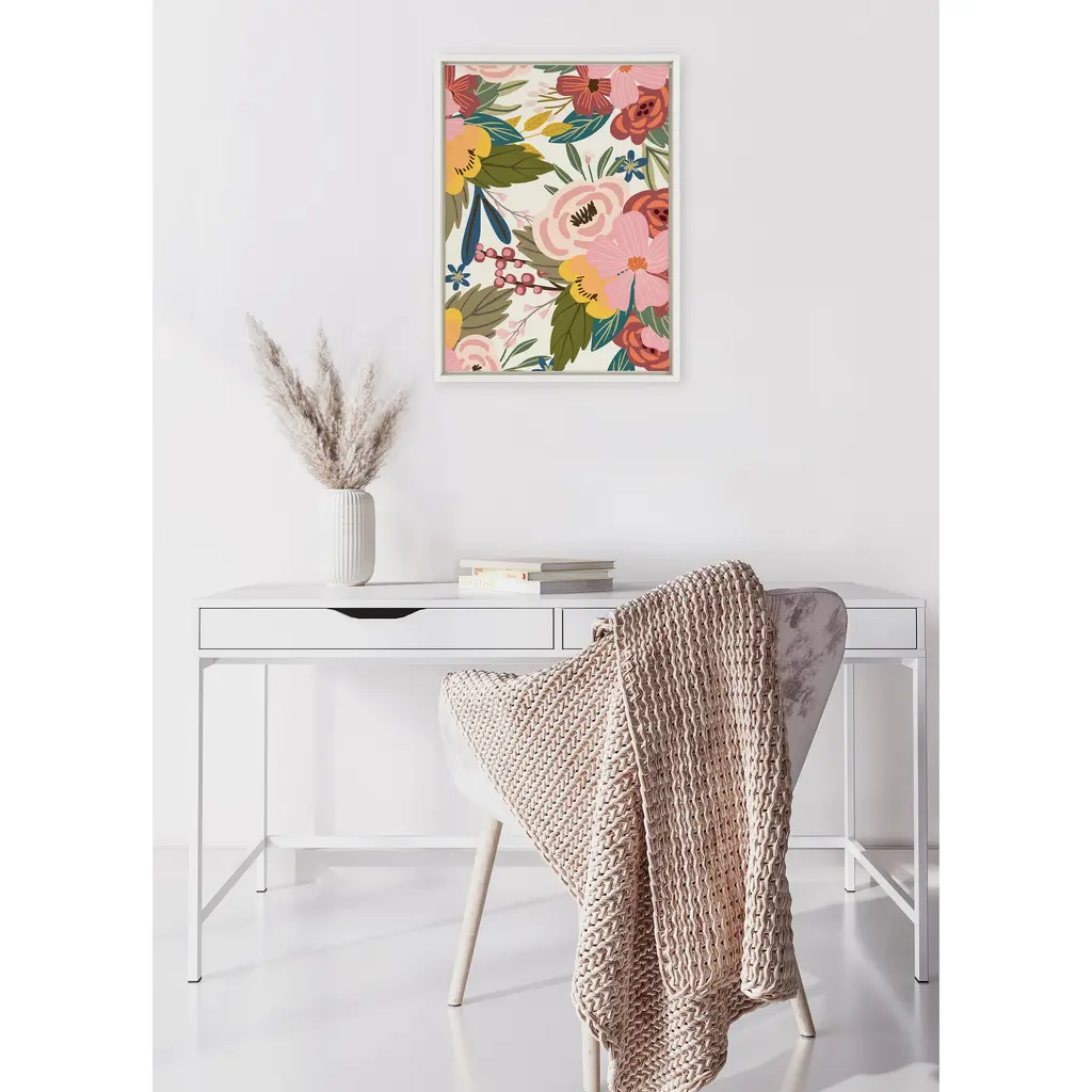 Add some vibrancy to your home with this vibrant floral accent piece by Mia Charro. Framed in the USA in Waunakee, Wisconsin, this floating canvas art will be a pleasure to look at every day in your living room, bedroom, nursery, or any room in the home. Printed on gallery-wrapped canvas and framed with a lightweight polystyrene frame, this wall art has two hangers already attached to the MDF back for easy wall display. The outer dimensions are 33 inches tall by 23 inches wide by 1.63 inches deep. Print Name: "Softly"