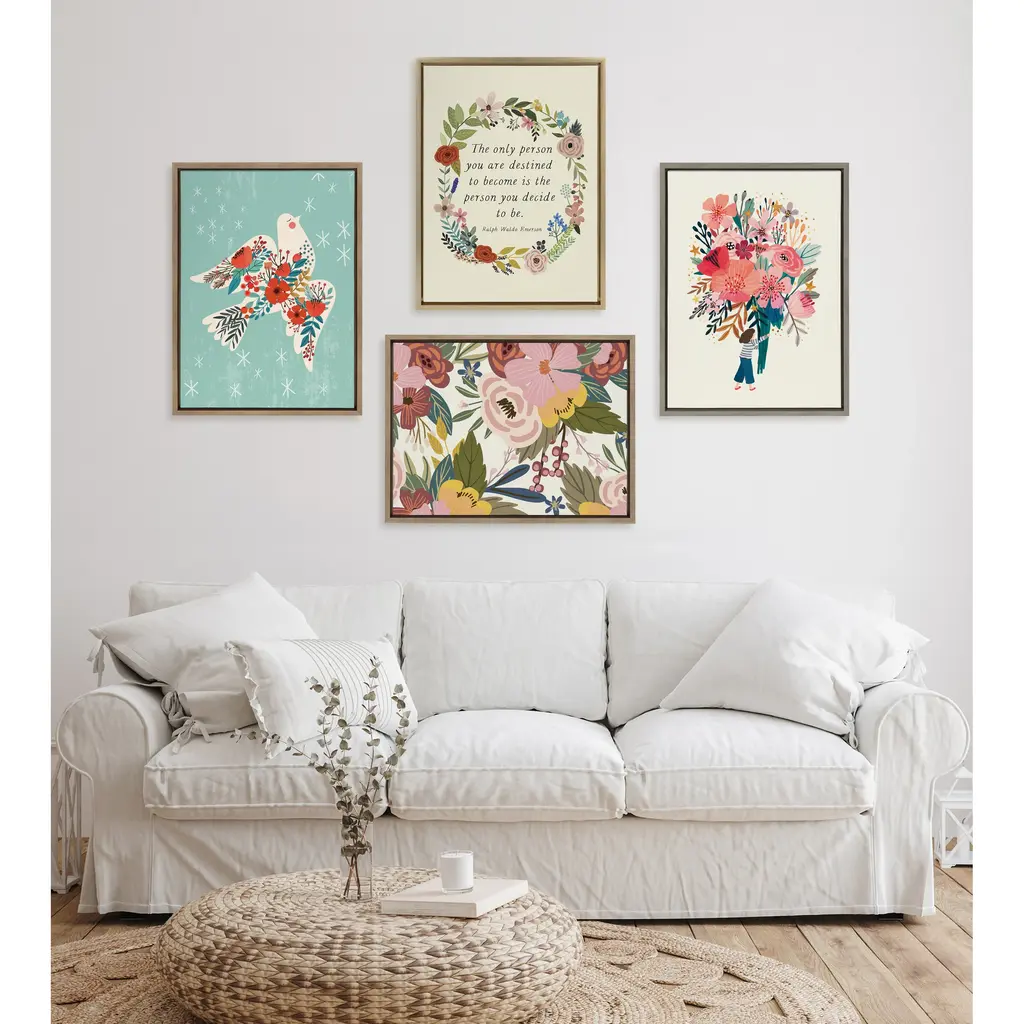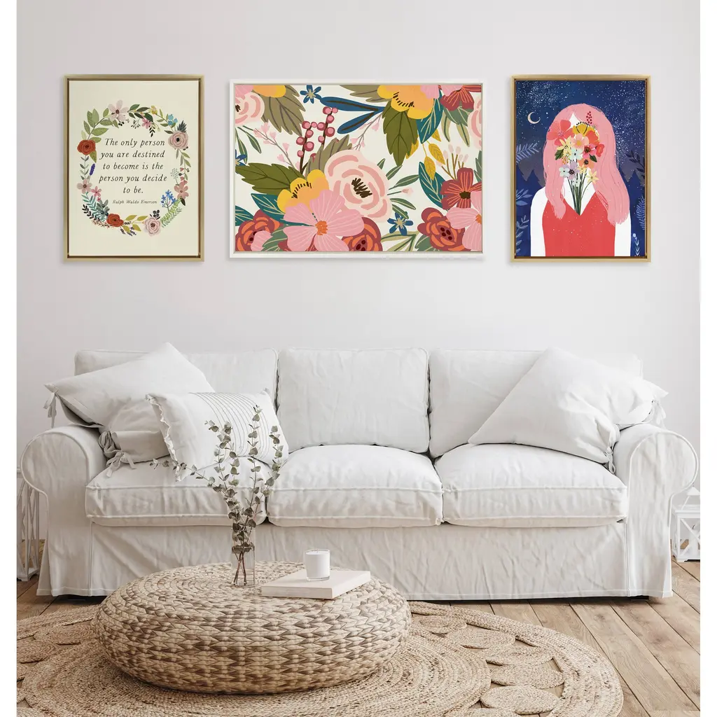 Add some vibrancy to your home with this vibrant floral accent piece by Mia Charro. Framed in the USA in Waunakee, Wisconsin, this floating canvas art will be a pleasure to look at every day in your living room, bedroom, nursery, or any room in the home. Printed on gallery-wrapped canvas and framed with a lightweight polystyrene frame, this wall art has two hangers already attached to the MDF back for easy wall display. The outer dimensions are 33 inches tall by 23 inches wide by 1.63 inches deep. Print Name: "Softly"