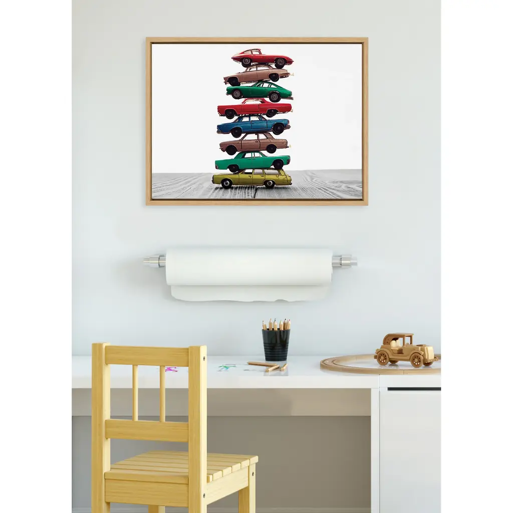 This piece by Saint and Sailor Studios is a vibrant and modern piece featuring colorful car toys arranged in a stacked formation. Add a playful touch to your child's nursery or playroom with this delightful artwork. Framed in the USA in Waunakee, Wisconsin, this modern floating canvas art is sure to bring joy to your space. Our design team curates art that will fit perfectly in any room of your home. Showcase this art in your living room, bedroom, home office, kitchen, bathroom, nursery, or anywhere you want to bring a little beauty and charm to your walls. Specializing in home décor, we are continually bringing timeless works of art for the traditional decorator as well as trend-forward pieces for that eclectic art lover. Our high-quality framed canvas art also makes excellent gifts for birthdays, holidays, or housewarming parties. Printed on gallery-wrapped canvas and framed with a simple gallery frame this wall art is easy to display on the wall and will match with any décor style. The outer dimensions are 18 inches by 24 inches by 1.6 inches. Print Name: "Stacked Cars"