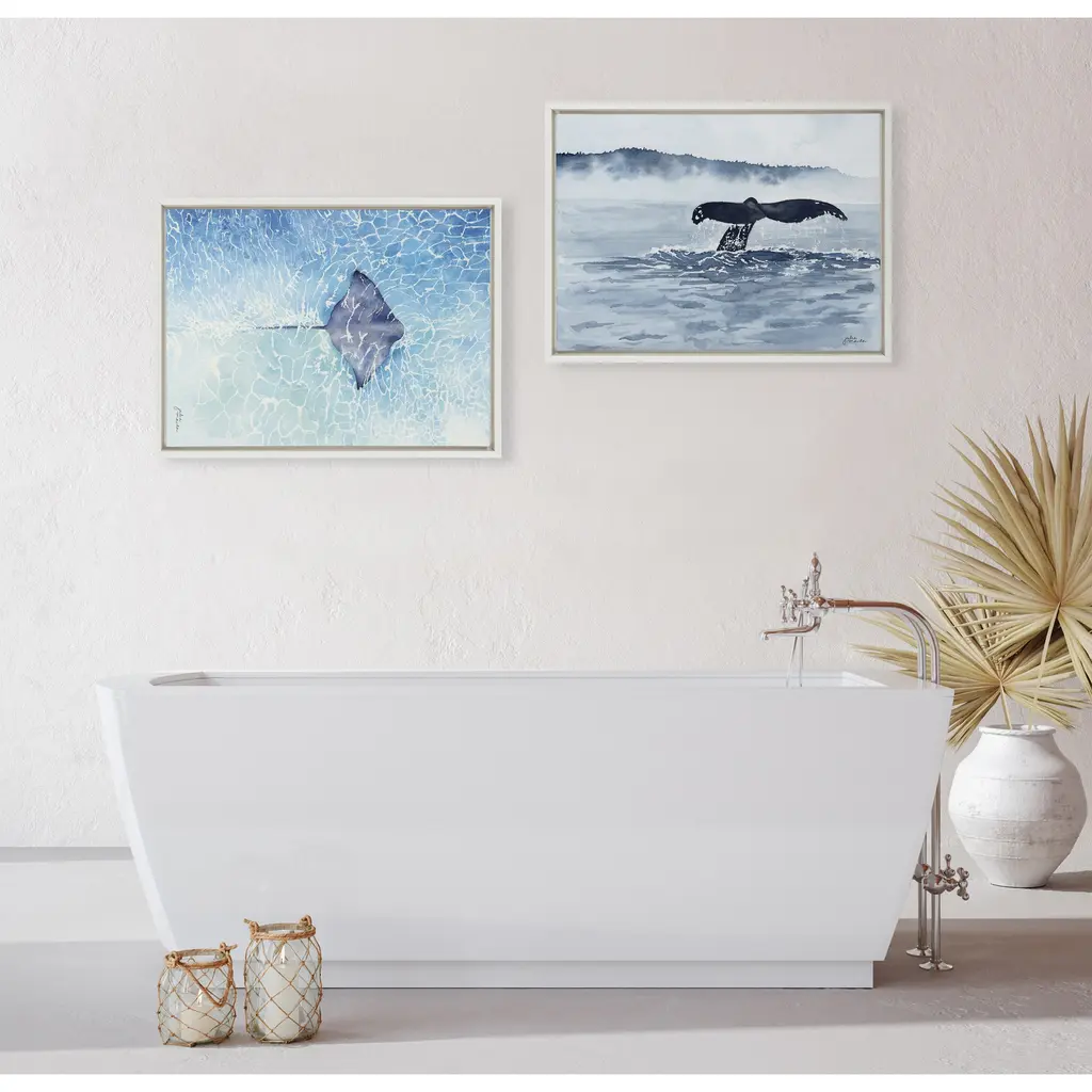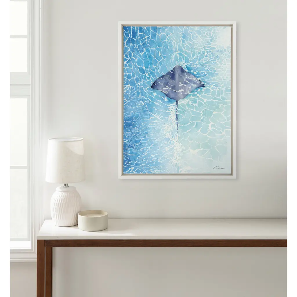 This stunning underwater stingray framed canvas is the perfect ocean accent to a coastal-themed home. Its unique design makes it a stunning piece to hang both vertically and horizontally. Framed in the USA in Waunakee, Wisconsin, this floating canvas art will be a pleasure to look at every day in your living room, bedroom, nursery, or any room in the home. This art print also makes an excellent gift for birthdays, holidays, or house-warming parties. Printed on gallery-wrapped canvas and framed with a lightweight polystyrene frame, this wall art is easy to display on the wall. The outer dimensions are 18 inches by 24 inches by 1.6 inches. Print Name: "Stingray"